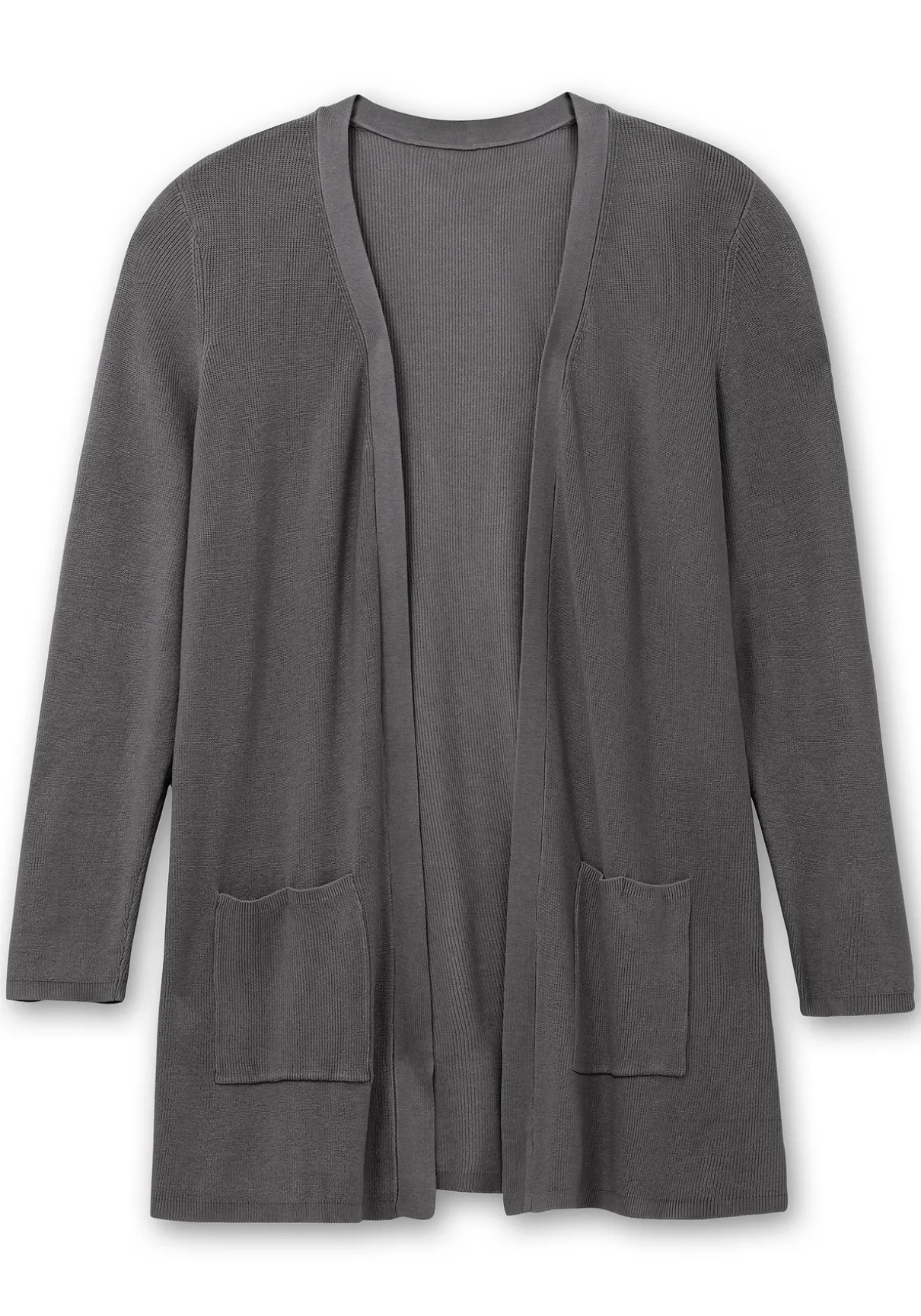 Cardigan mit V-Ausschnitt. Die verschlusslose, offen fallende Form macht die Strickjacke zum zeitlosen Begleiter für viele Outfits. Sowohl die Ärmel als auch der Saum sind mit schmalen Rippbündchen versehen. Zwei große aufgenähte Taschen runden den schlichten Look perfekt ab.