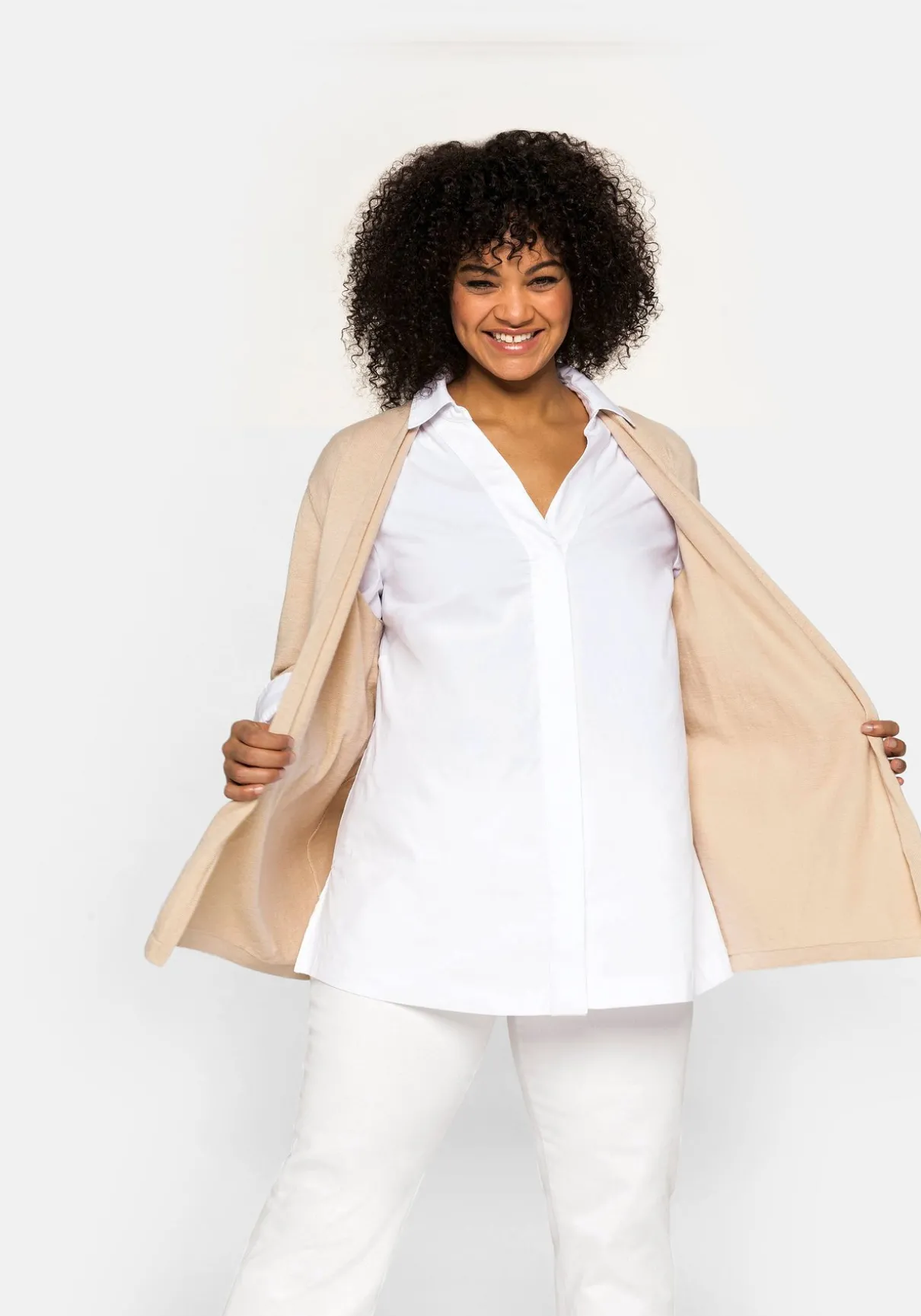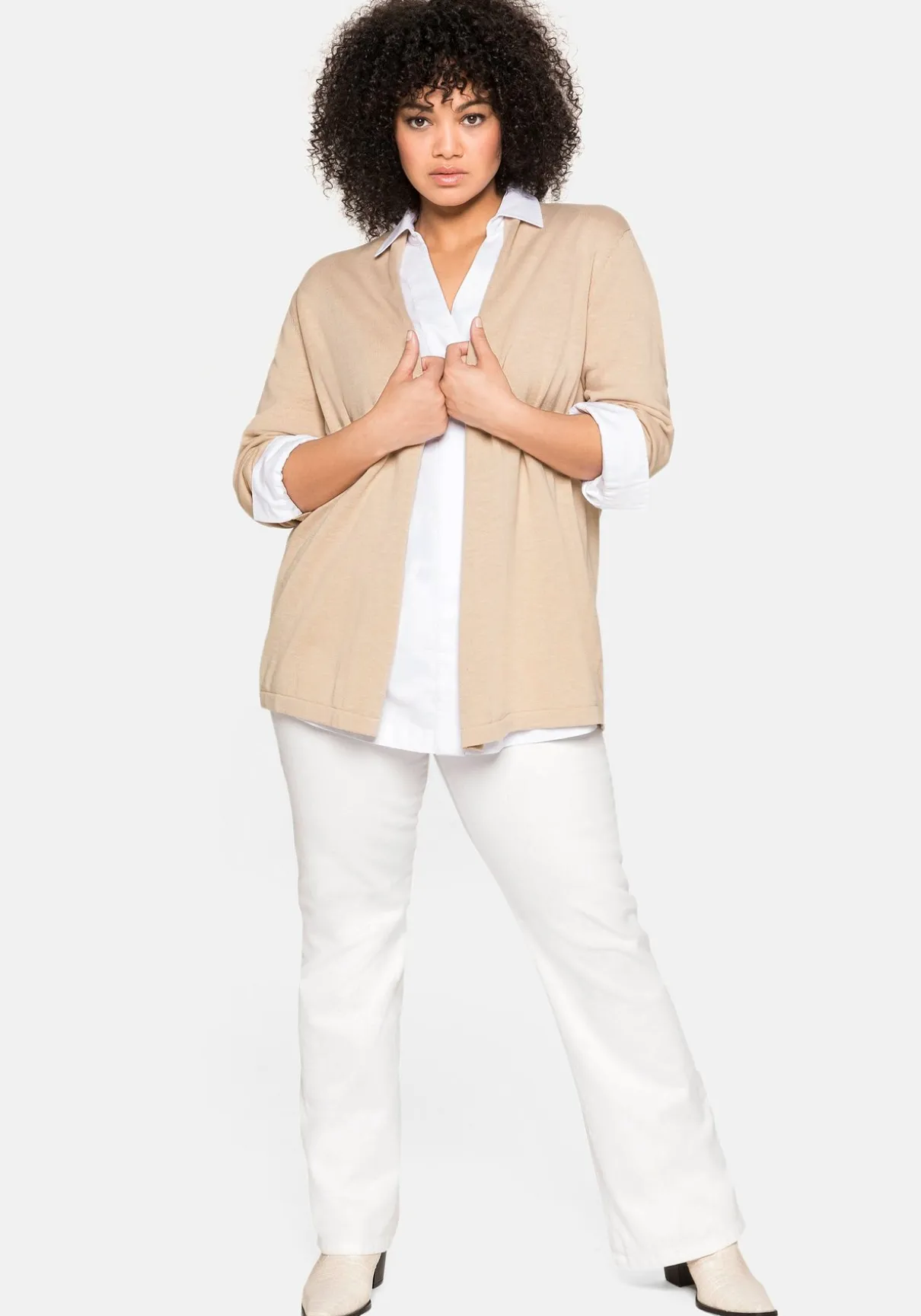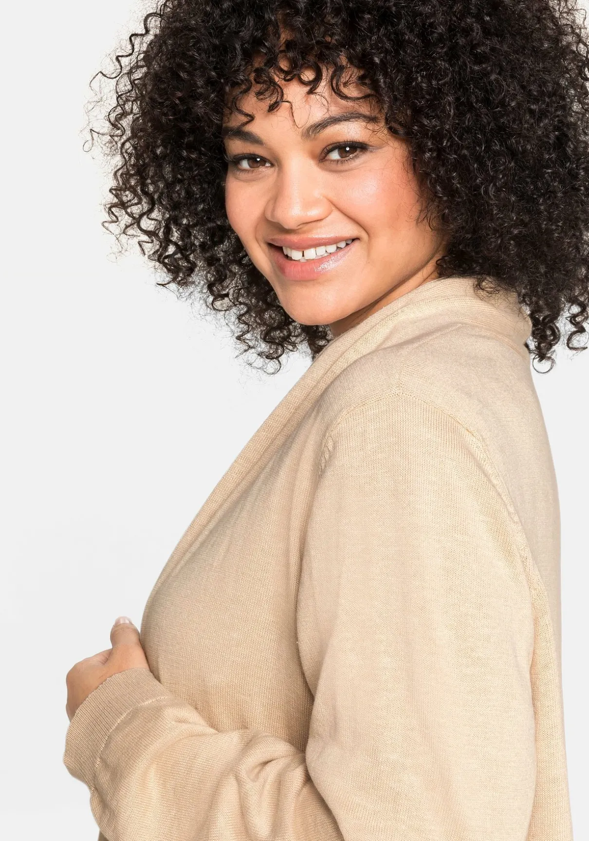 Strickjacke in verschlussloser Form. Sie zeigt sich mit dezentem Schalkragen und schmalen Rippbündchen an den langen Ärmeln. Der offen fallende Schnitt macht den Cardigan zum idealen Kombipartner.