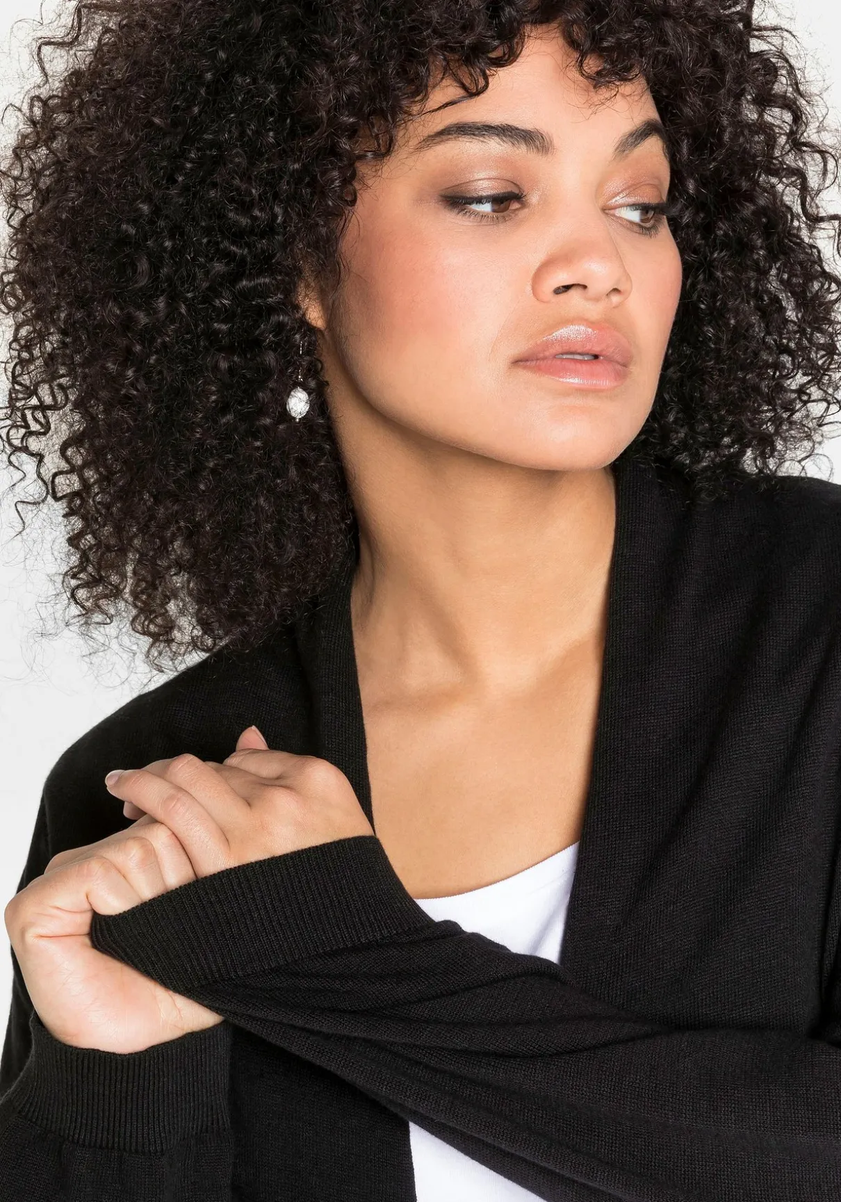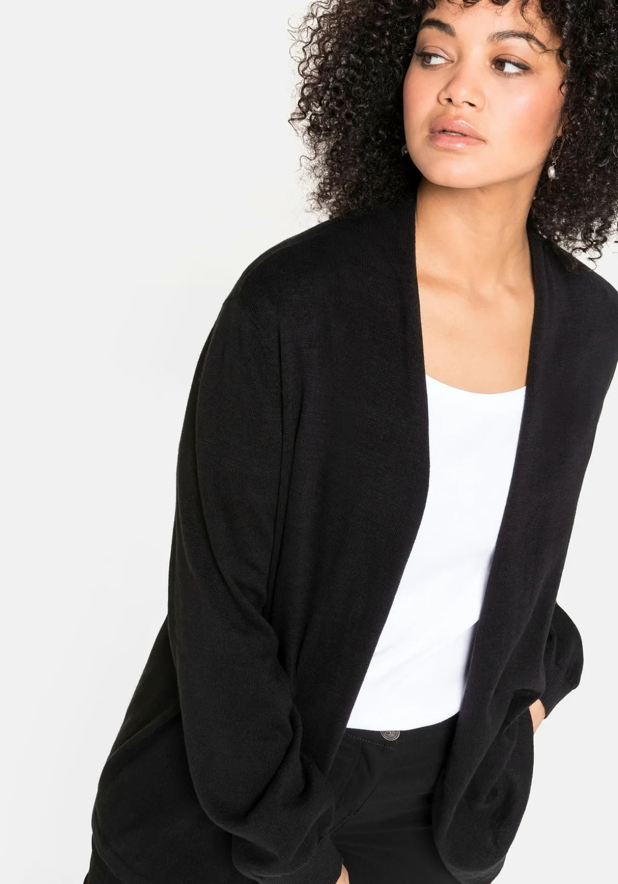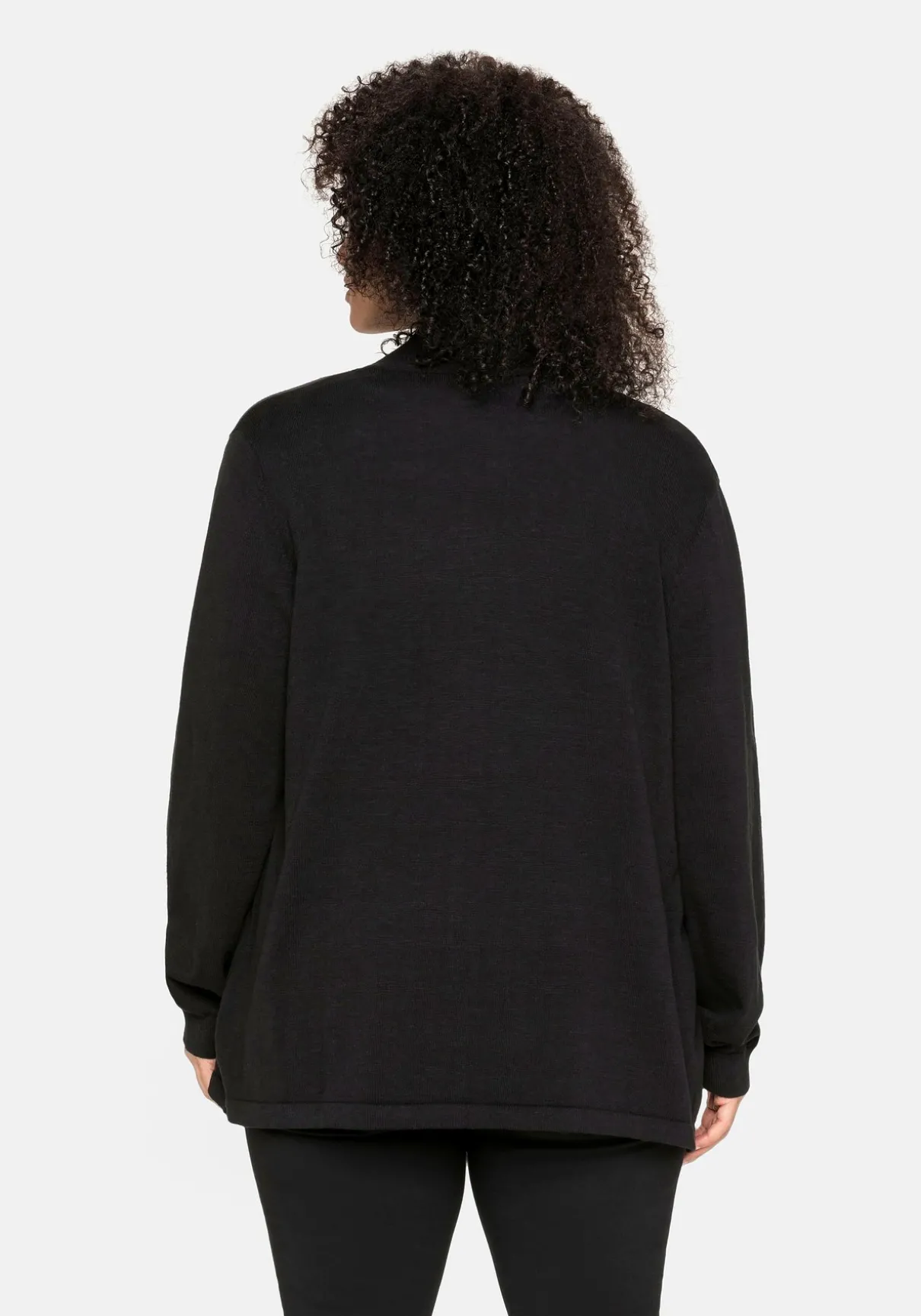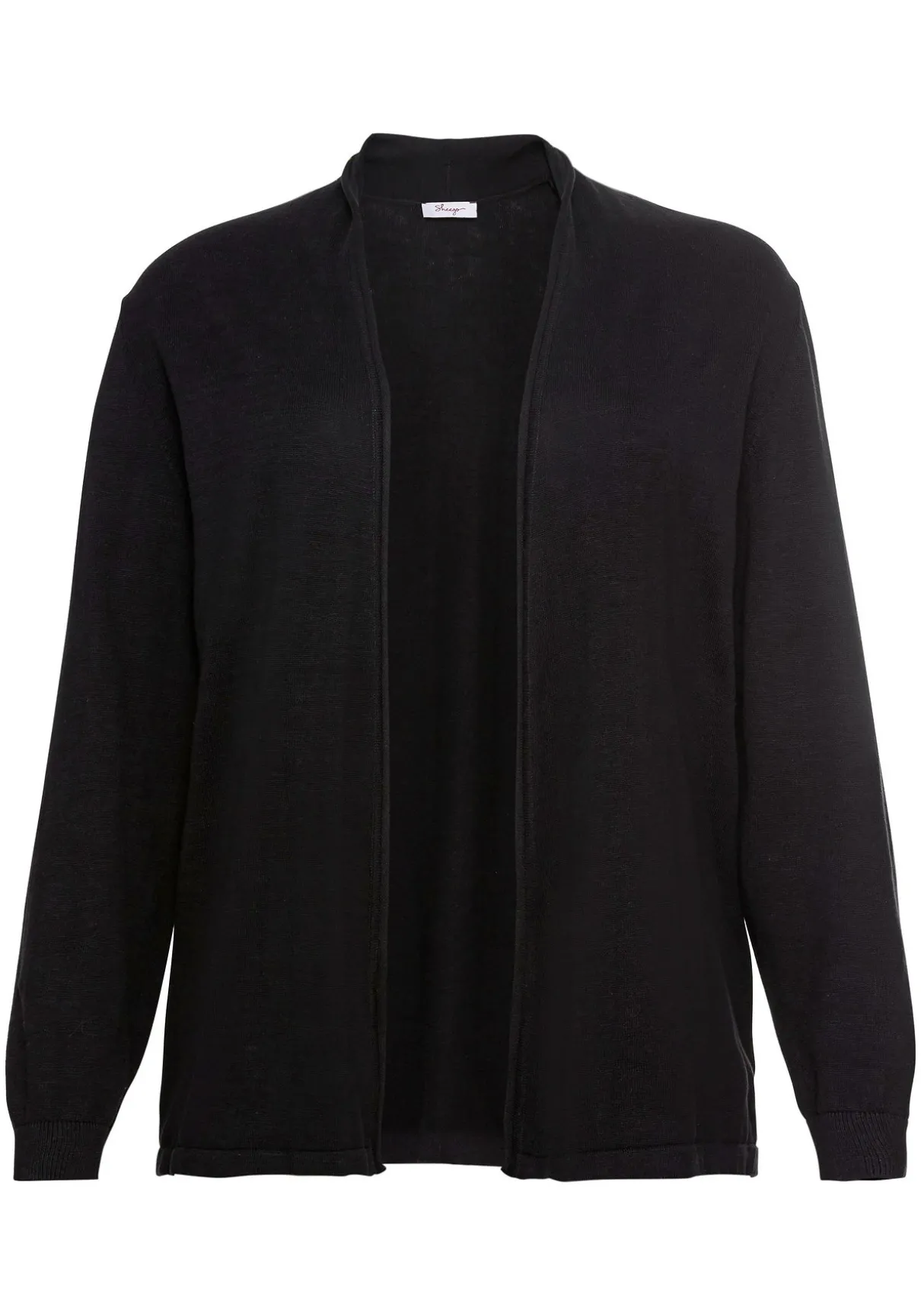 Strickjacke in verschlussloser Form. Sie zeigt sich mit dezentem Schalkragen und schmalen Rippbündchen an den langen Ärmeln. Der offen fallende Schnitt macht den Cardigan zum idealen Kombipartner.