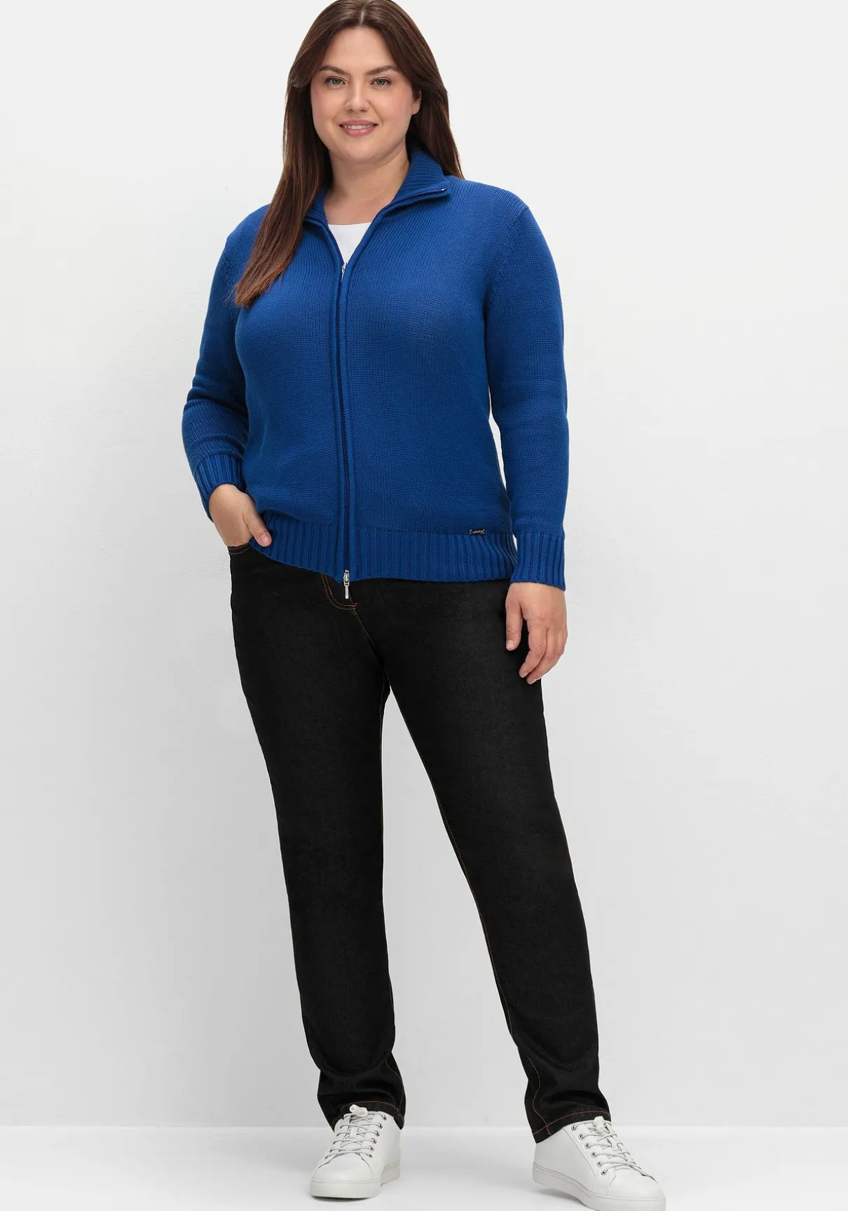 Die gerade geschnittene Strickjacke betont dezent die Figur und reicht bis zur Hüfte. Für mehr Bewegungsfreiheit lässt sich der Reißverschluss auch von unten öffnen.