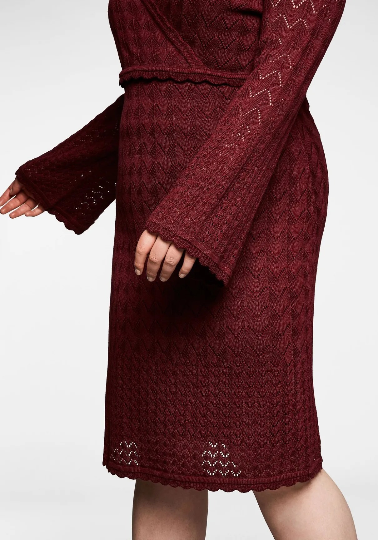 Strickkleid mit Unterkleid. Das zarte Ajourstrickmuster verleiht ihm seine verspielte Optik, auch der in Wickeloptik gestaltete Ausschnitt unterstreicht den femininen Auftritt. Passendes Finish sind die Bogenkanten an allen Abschlüssen, eine Teilungsnaht in der Taille gibt der Silhouette Form.