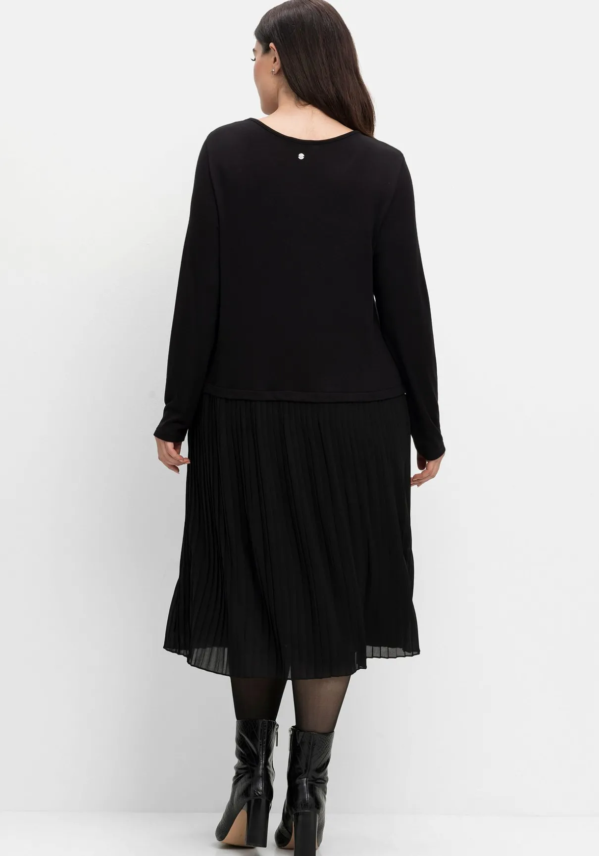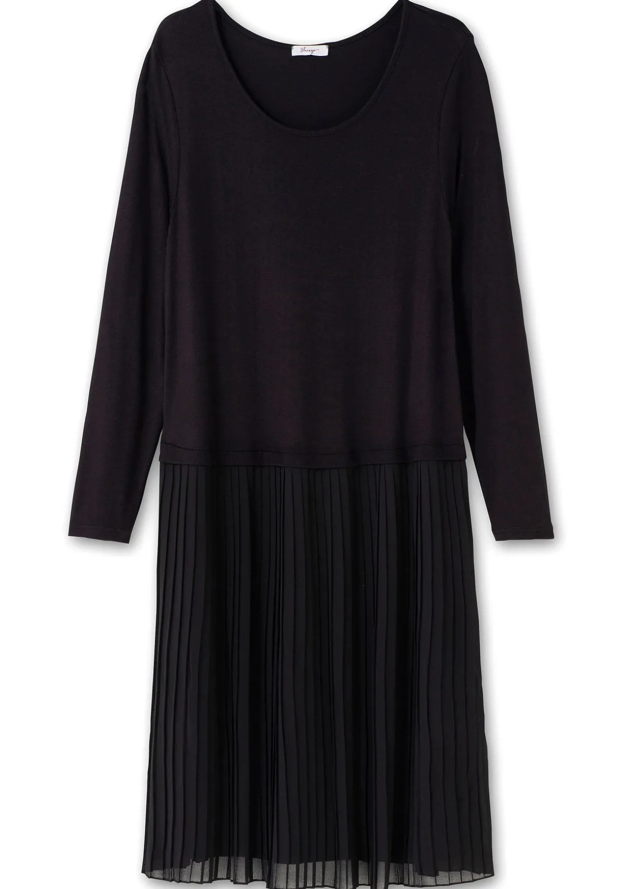 Strickkleid im Materialmix. Der interessante Mix aus weichem Strickoberteil und plissiertem Chiffonrock gibt dem Look Raffinesse. Ein etwas weiterer Rundhals unterstreicht den femininen Style, der gut auch zu festlichen Anlässen passt.