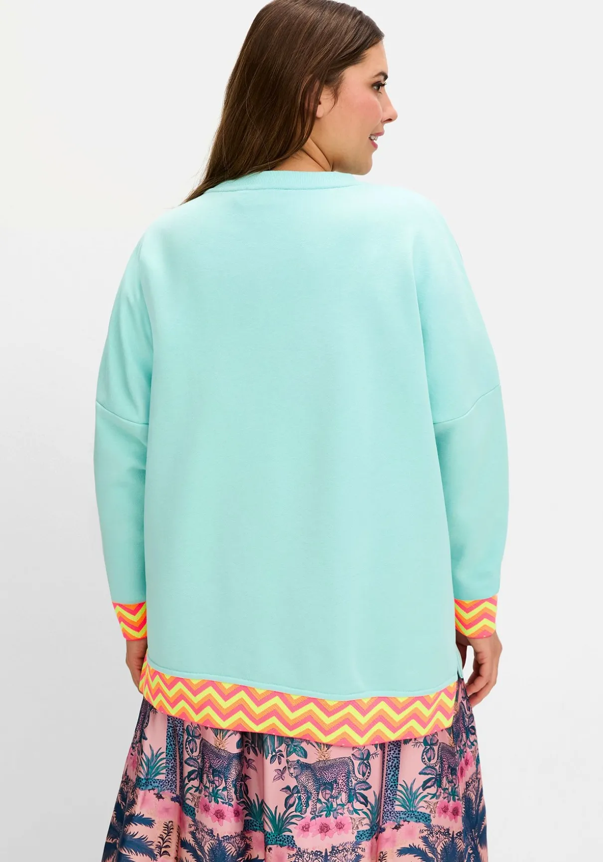 Sweatshirt mit modischen Highlights von sheego loves miss goodlife. Der fröhliche Statement-Frontdruck verleiht dem Sweater einen unverwechselbaren Charme. Der V-Ausschnitt sorgt zusammen mit den überschnittenen Ärmeln für eine lässige Silhouette. Auffällig sind die Zickzack-Streifenbündchen, die den Look modern abrunden.