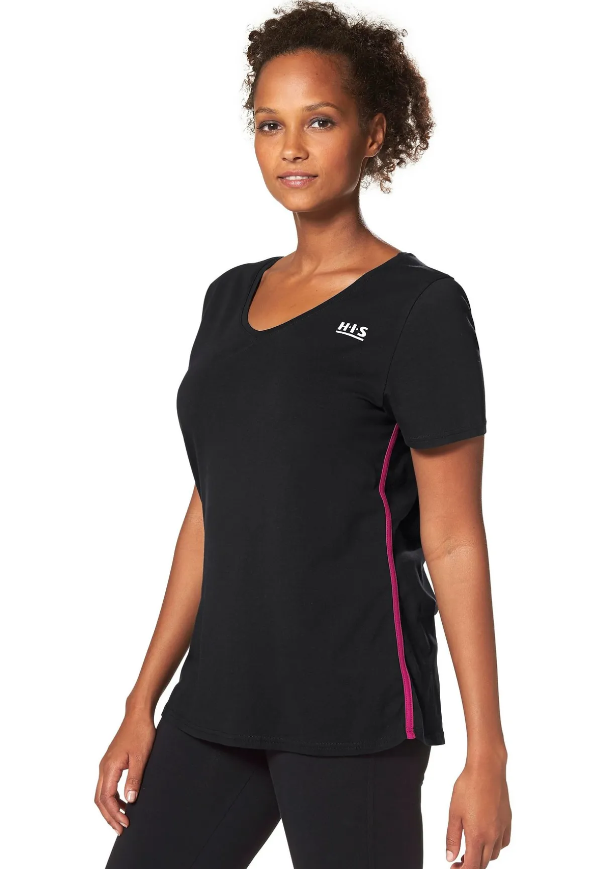 Unkompliziertes Damen-T-Shirt der Marke H.I.S. Mit einem hüftbedeckenden und figurumspielenden Schnitt. Es ist mit einem coolen Logodruck versehen. Das T-Shirt kommt mit einem vielseitigen Look, der für Sport und Alltag gut geeignet ist. Das Oberteil ist durch die weiche Baumwoll-Qualität angenehm zu tragen.