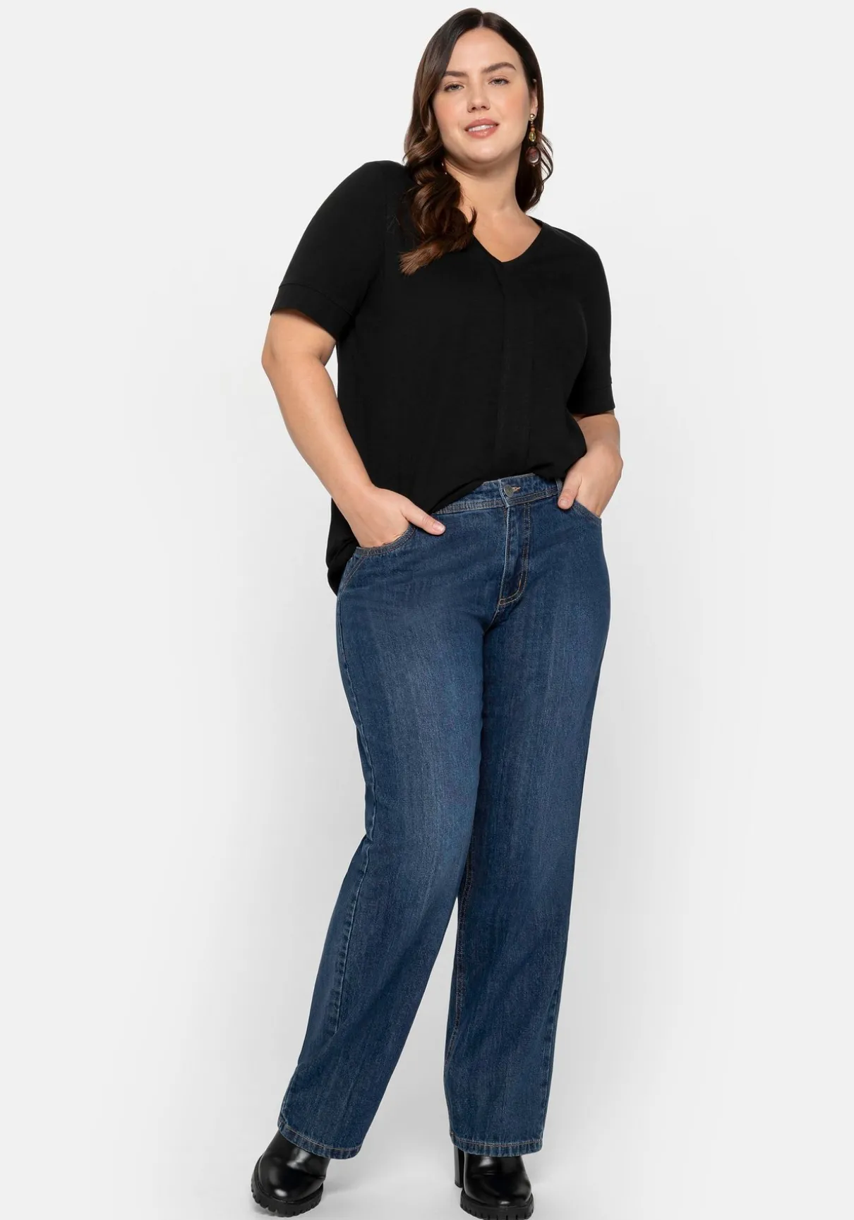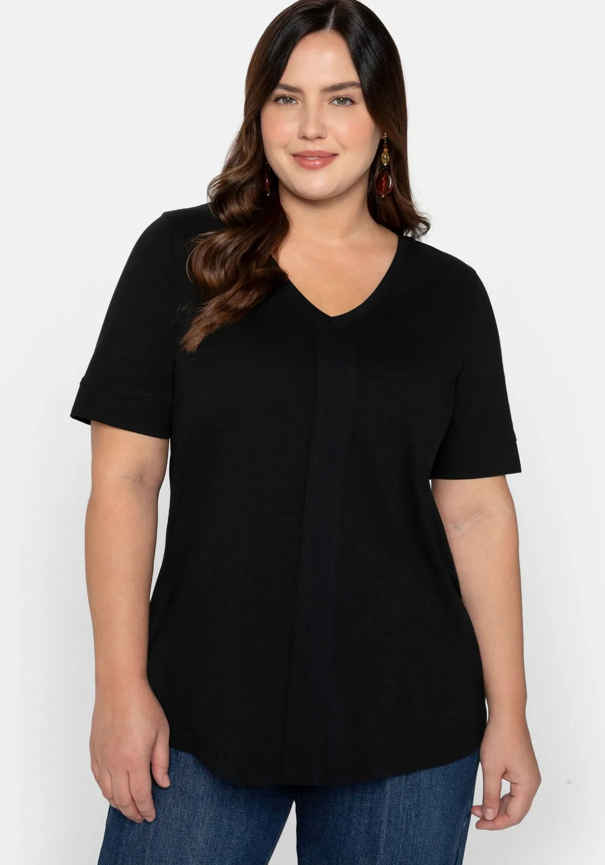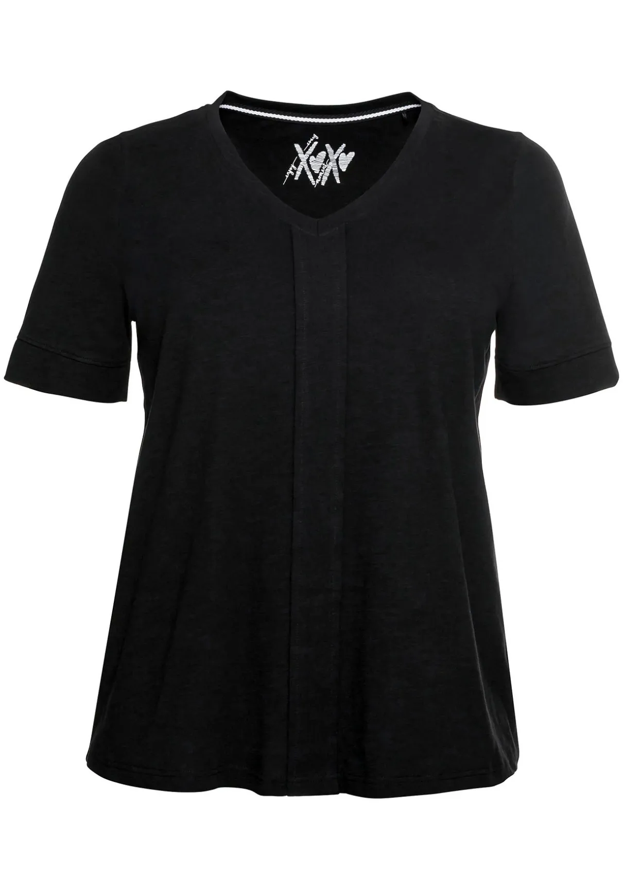 T-Shirt mit gerundetem V-Ausschnitt. Als Blickfang dient hier die senkrecht verlaufende, gesteppte Falte vorn. Der Ärmel ist etwas länger geschnitten und fällt so schmeichelnd über die Oberarme.