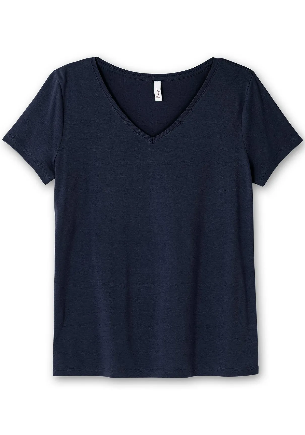 T-Shirt mit V-Ausschnitt. Der kurze Ärmel und der etwas längere Schnitt machen es zum kombistarken Basic.