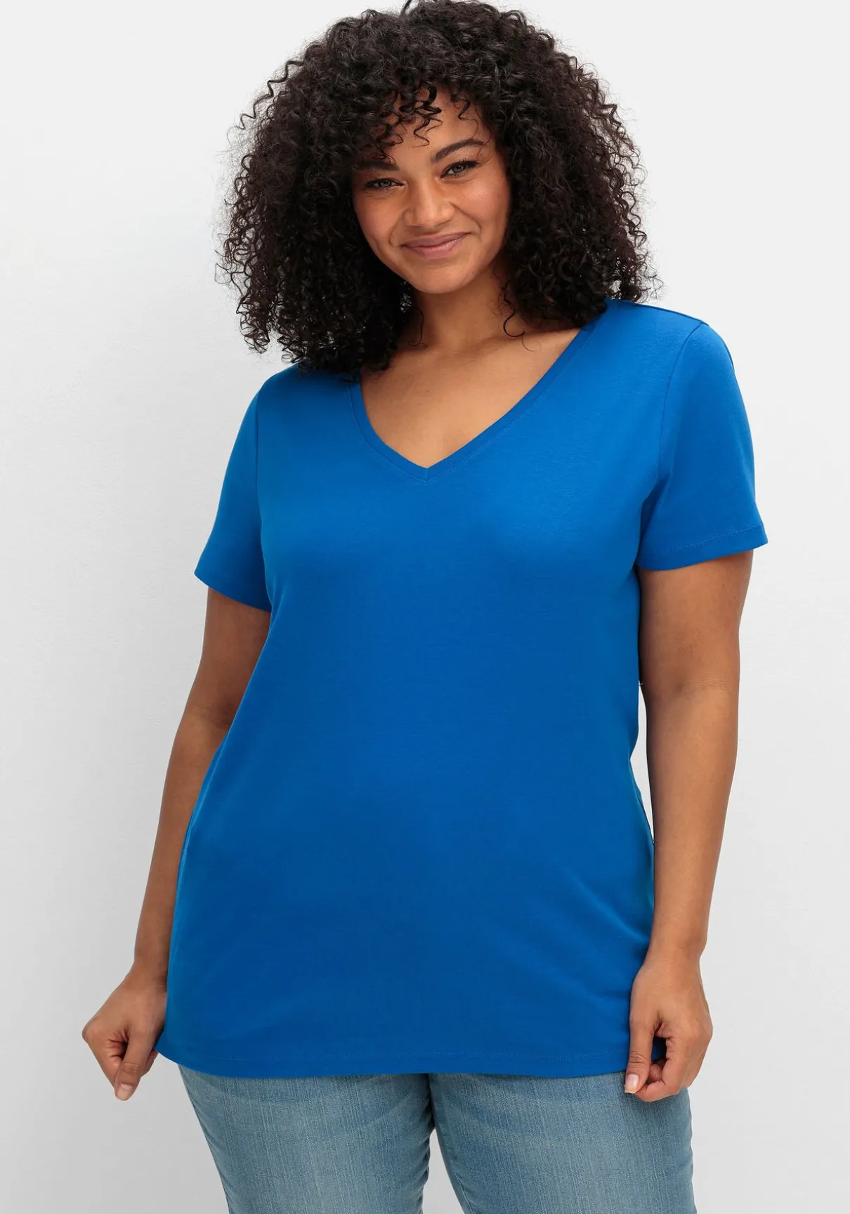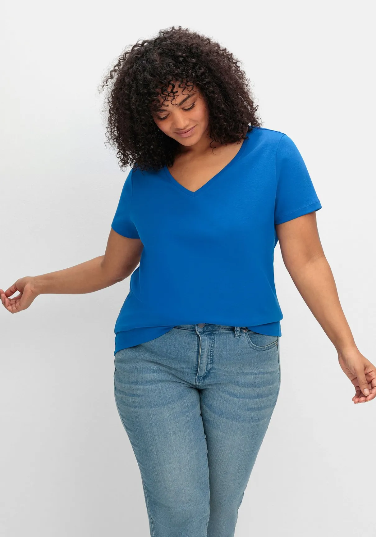 T-Shirt mit V-Ausschnitt. Der kurze Ärmel und der etwas längere Schnitt machen es zum kombistarken Basic.