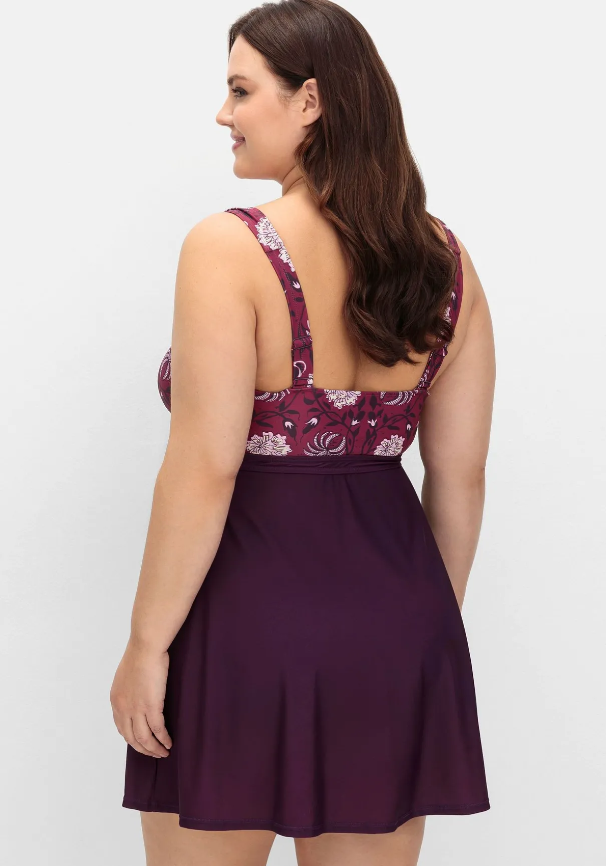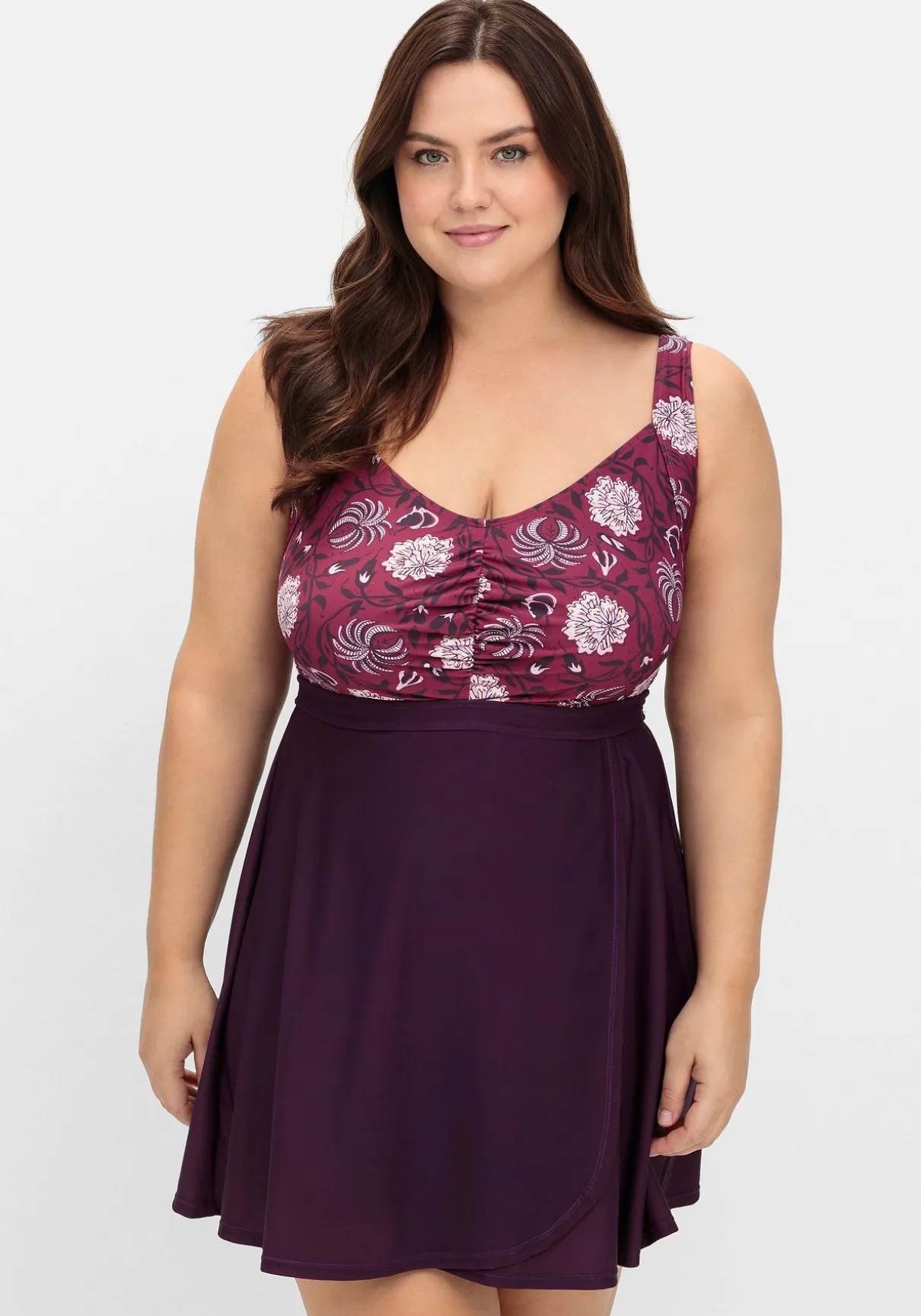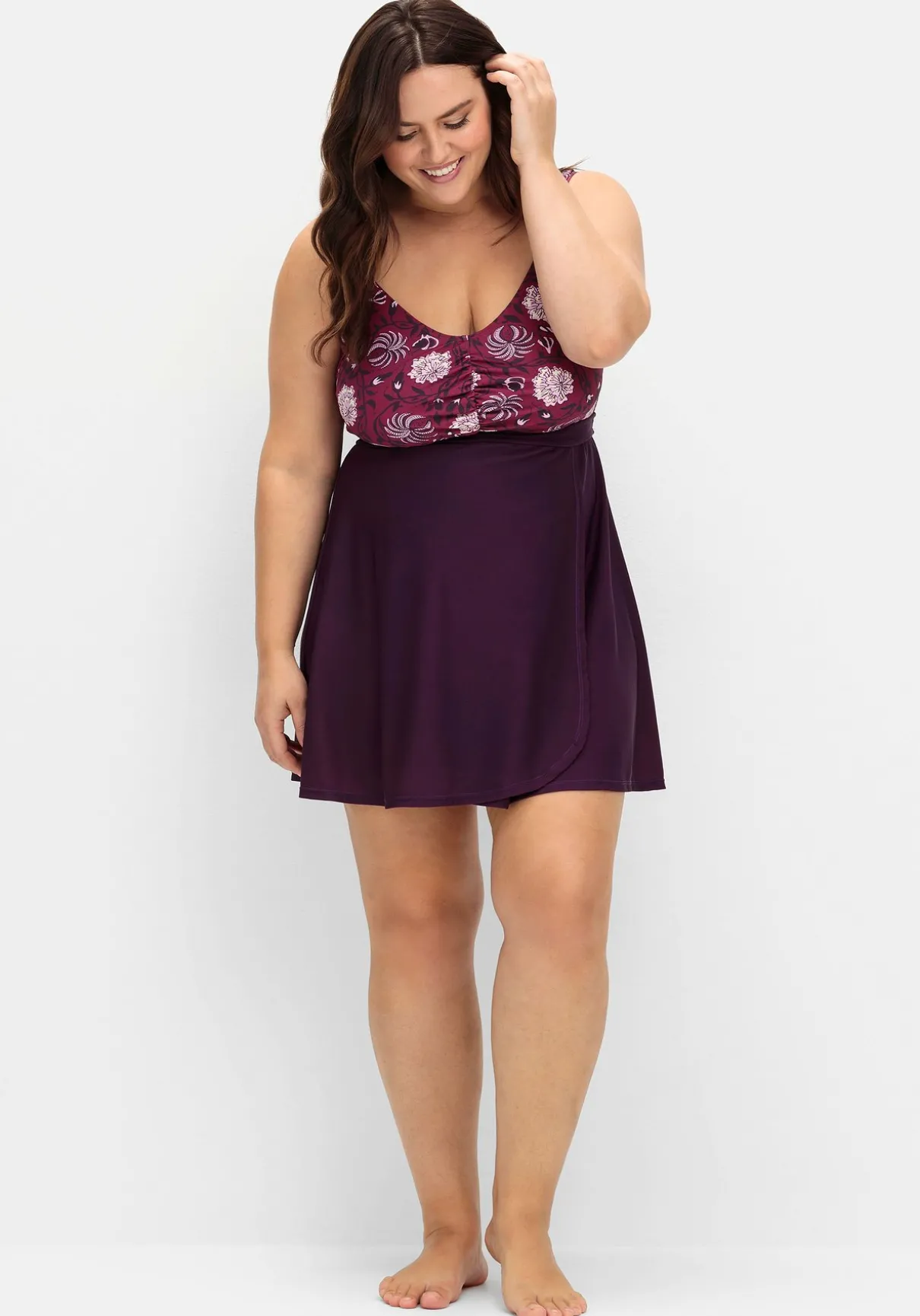 Tankini-Oberteil ohne Badehose von sheego by Joe Browns. Der farbharmonische Blumendruck im Brustbereich bildet einen hübschen Kontrast zum unifarbenen abgesetzten Rockteil. Breite verstellbare Träger, weich gepolsterte Cups und ein bequemes Unterbrustgummi geben Halt und unterstützen die Brust. Das Rockteil erhält durch die leichte Kräuselung einen lockeren Fall, die ausgestellte Form in Wickeloptik zaubert eine feminine Silhouette. Dank des Mix & Match-Charakters lassen sich dazu verschiedene Bikinihosen aus der sheego by Joe Browns Badekollektion kombinieren.
