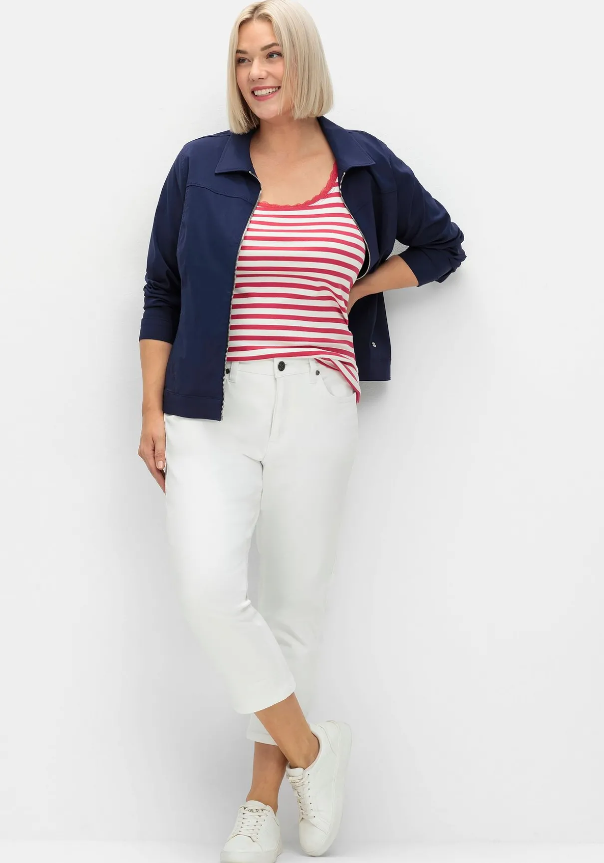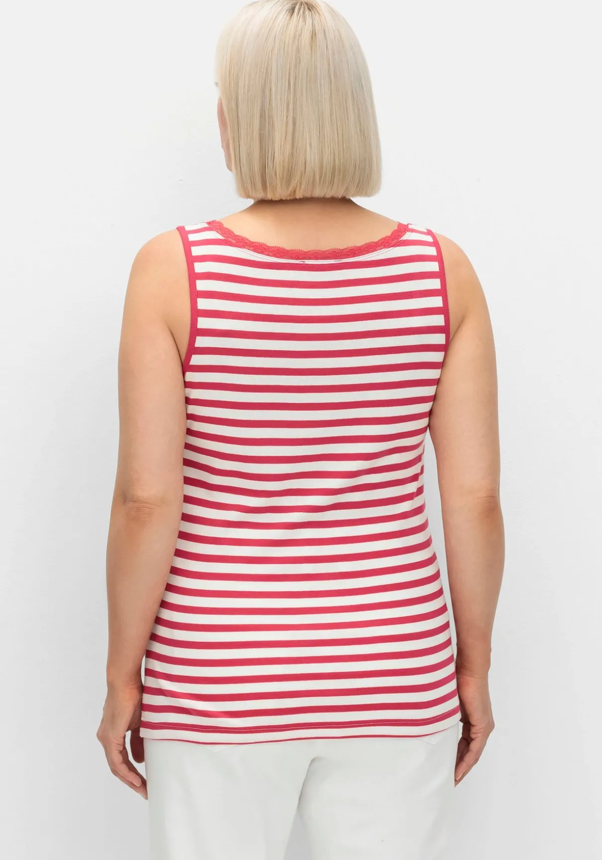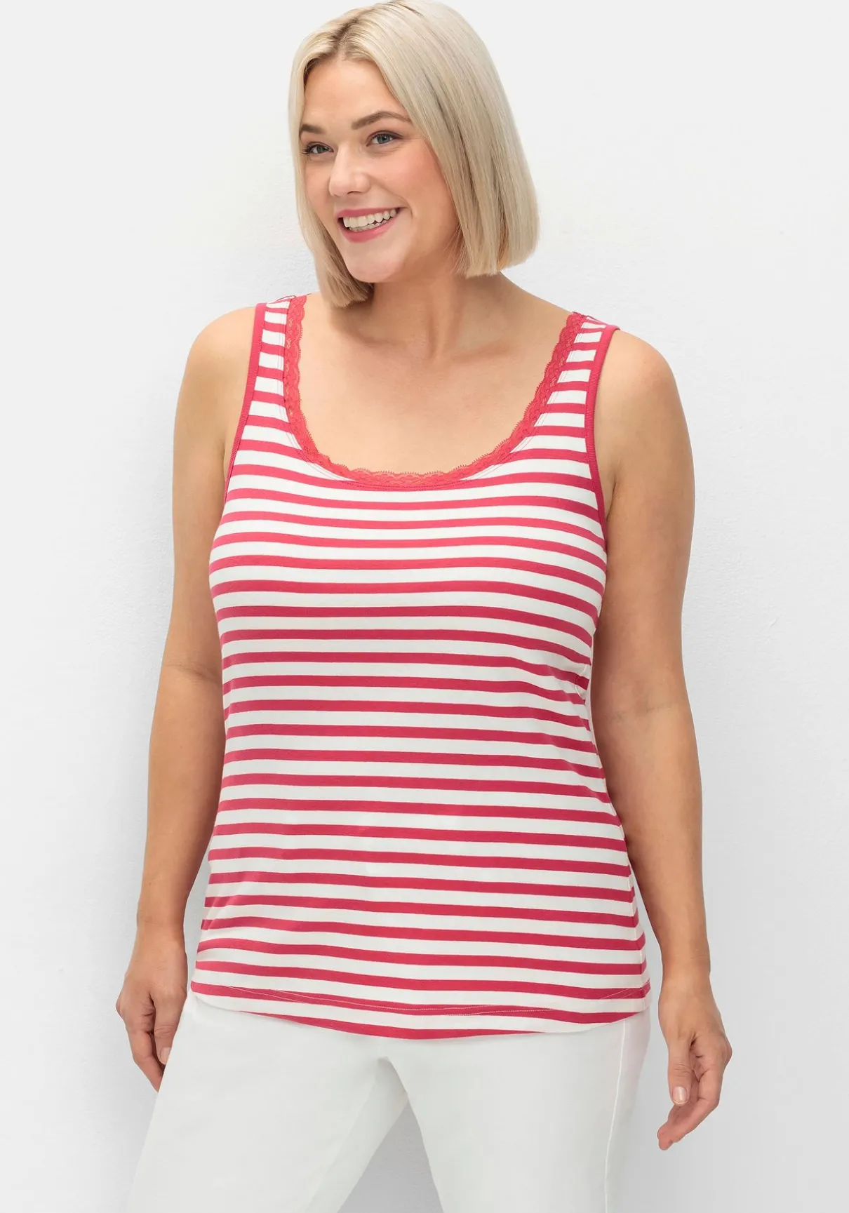 Tanktop mit schmalen Trägern. Garngefärbte Ringel geben dem Oberteil einen frischen, sportiven Look. Dezente Spitze am Rundhalsausschnitt sorgt für ein feminines Finish.