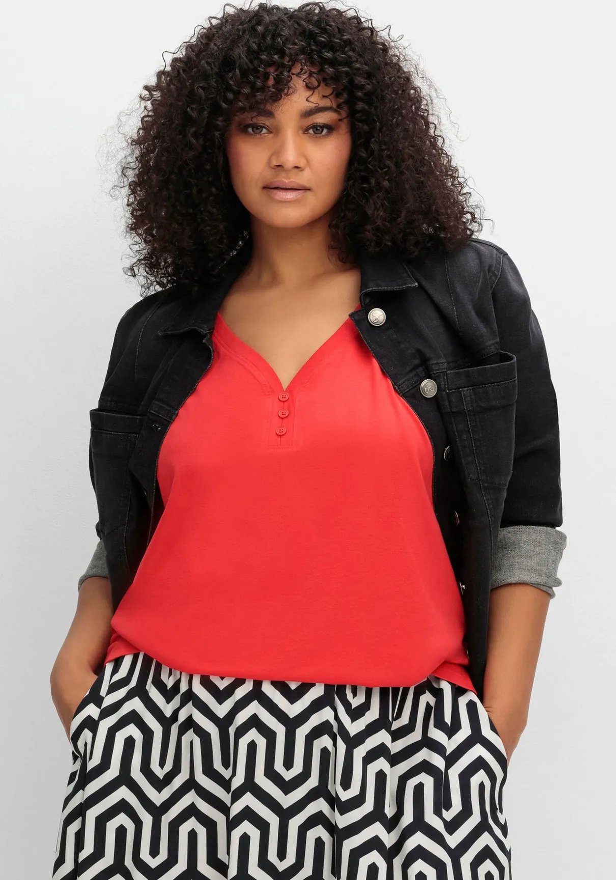 Der gerade Schnitt endet in hüftbedeckender Länge.