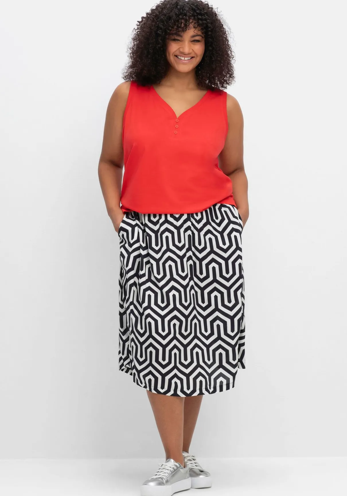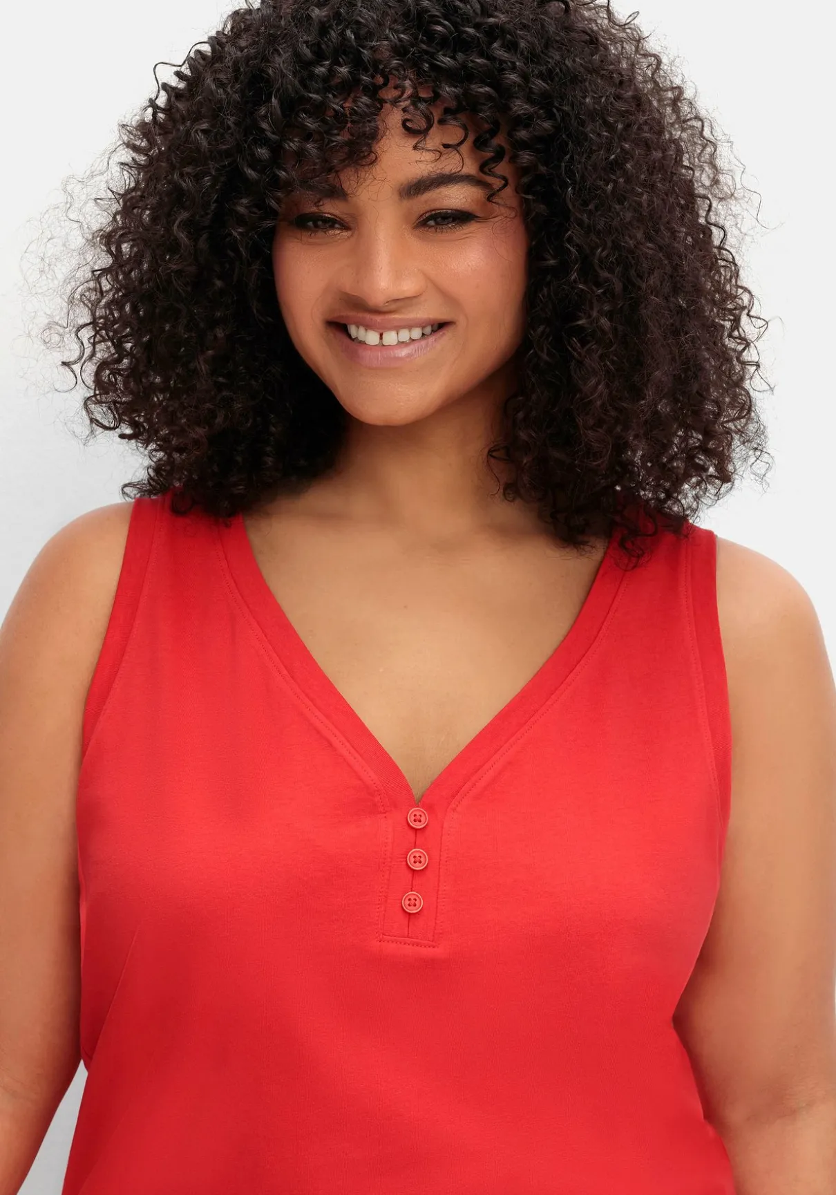 Jerseytop mit breiten Trägern. Das sommerliche Oberteil zeigt sich mit tieferem V-Ausschnitt und dekorativer Zierknopfleiste. Kurze seitliche Schlitze lassen das Top locker über die Hüfte fallen.