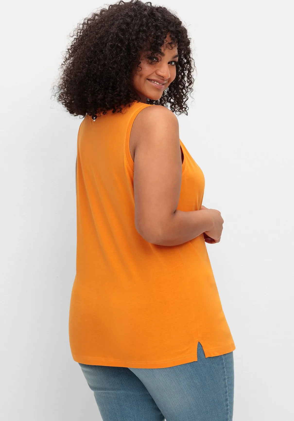 Jerseytop mit breiten Trägern. Das sommerliche Oberteil zeigt sich mit tieferem V-Ausschnitt und dekorativer Zierknopfleiste. Kurze seitliche Schlitze lassen das Top locker über die Hüfte fallen.