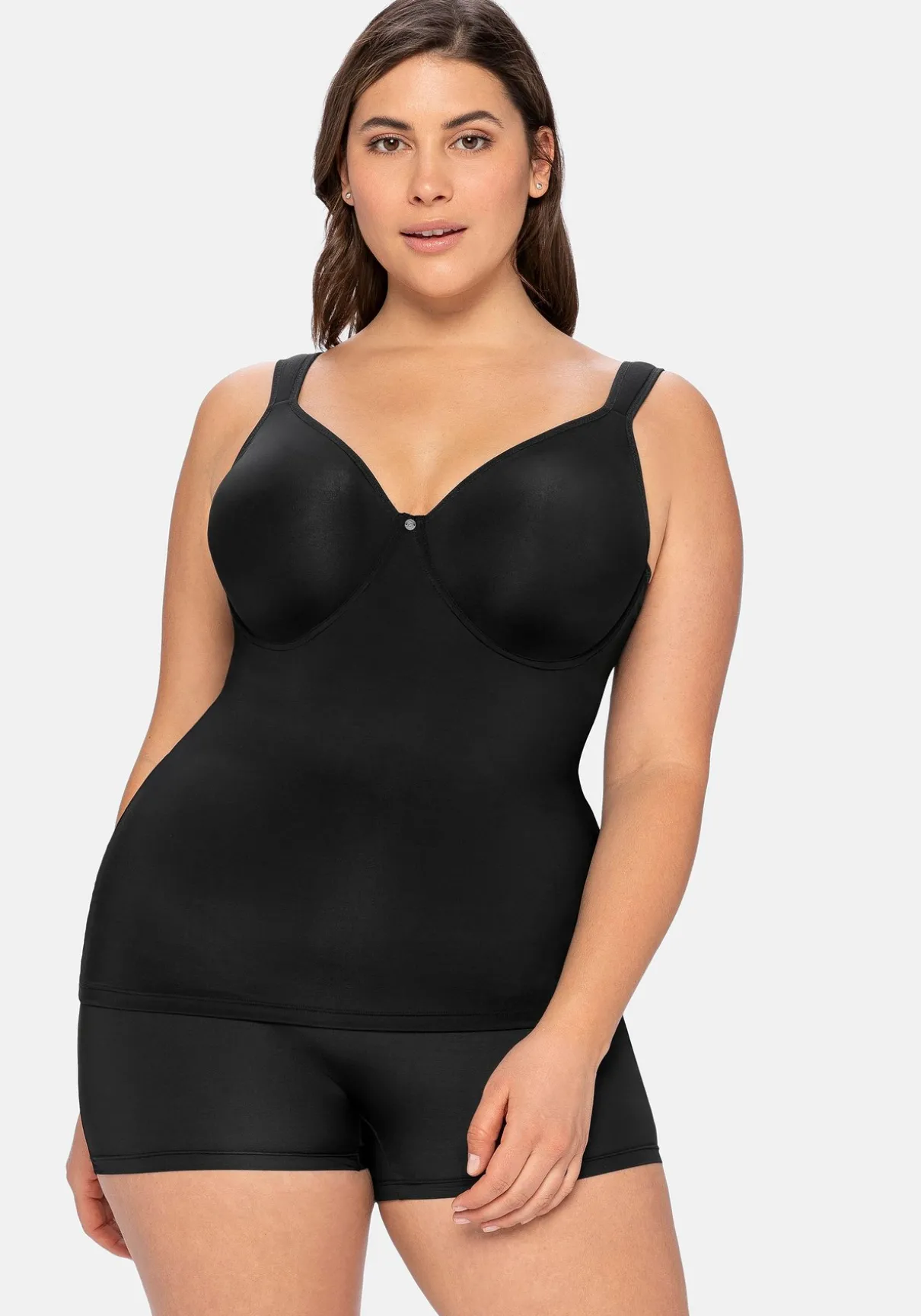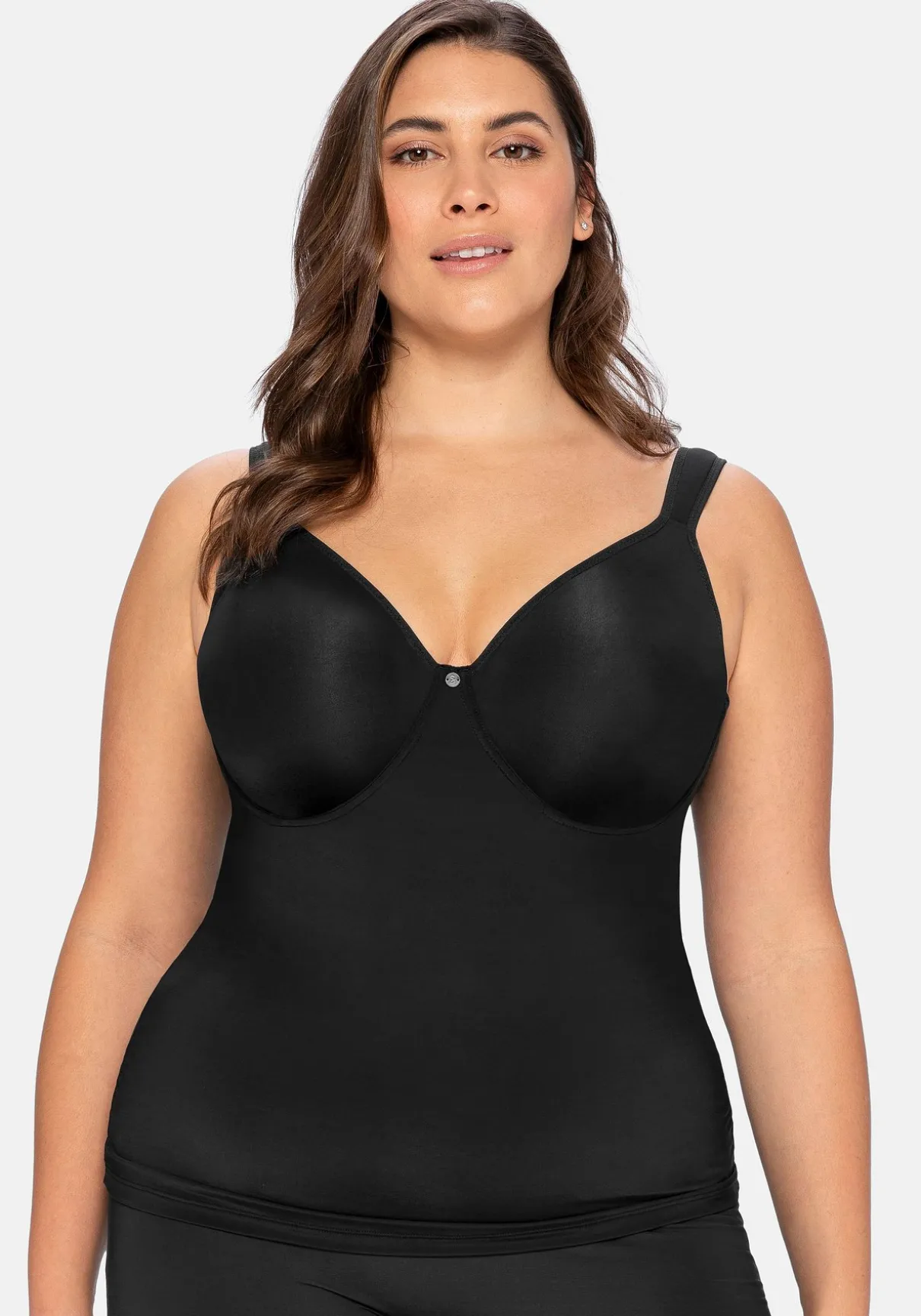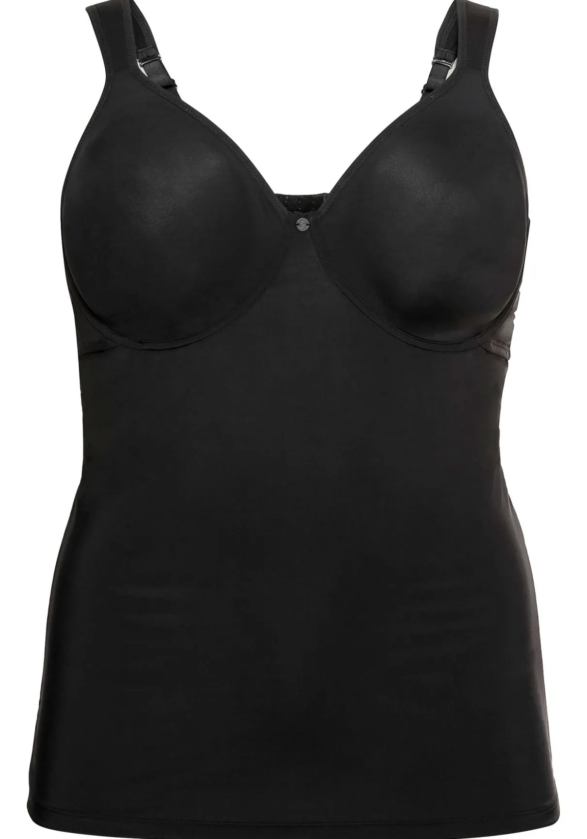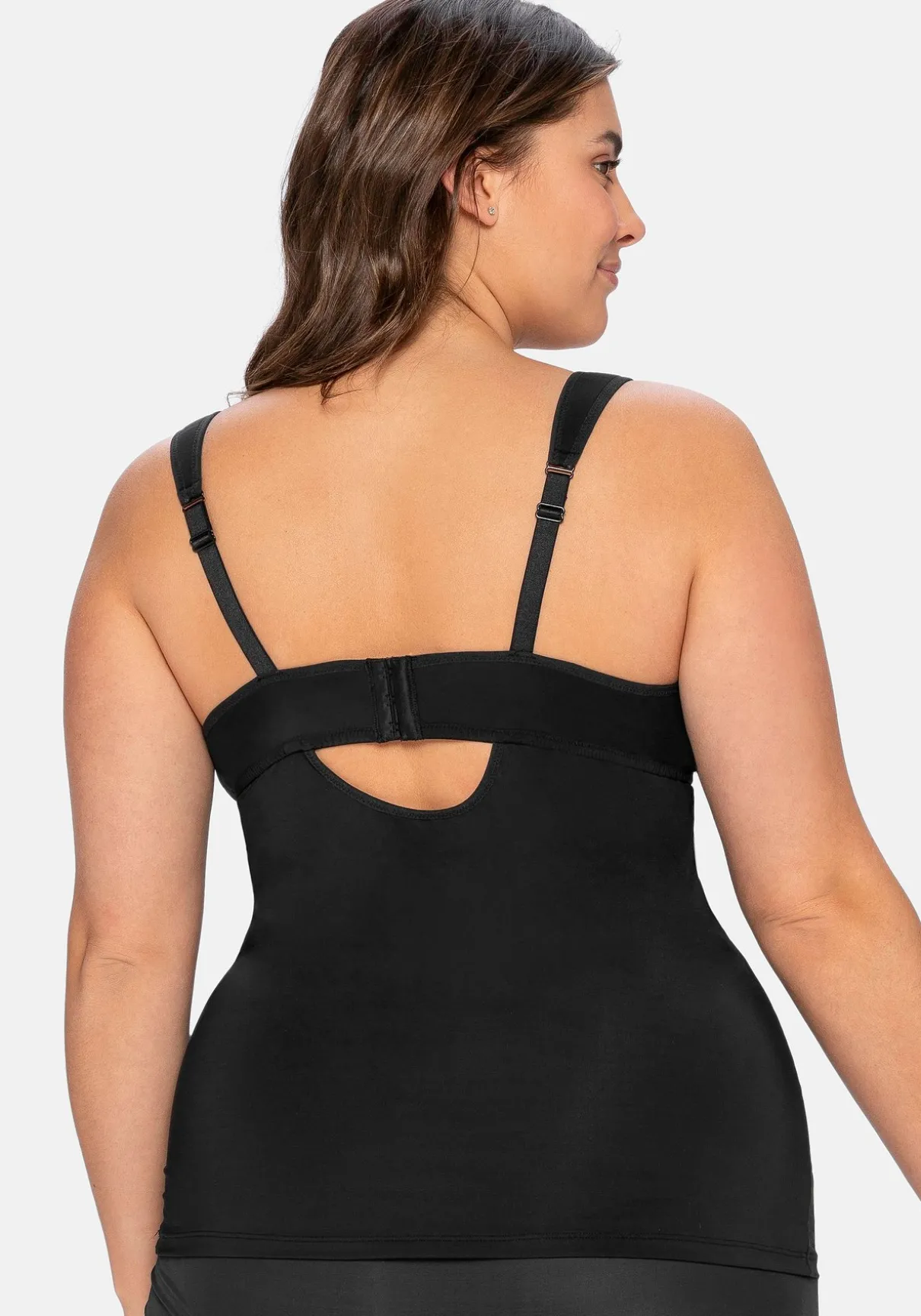 Top mit integriertem Bügel-BH. Nicht nur die eingearbeiteten Bügel stützen die Brust, auch die etwas breiteren, verstellbaren Träger geben Halt. Der BH-Einsatz ist in der Weite verstellbar und sorgt so für optimalen Tragekomfort. Hinten sorgt ein weitenverstellbarer Rückenverschluss für einen sicheren Sitz und leichteres Anziehen.