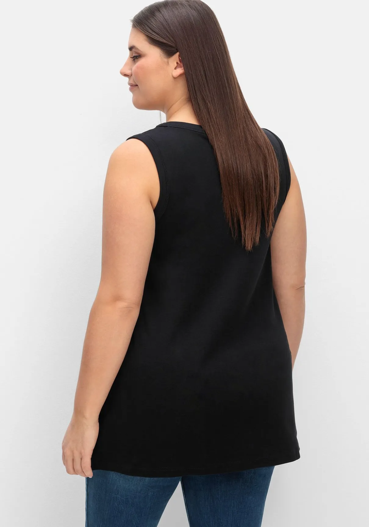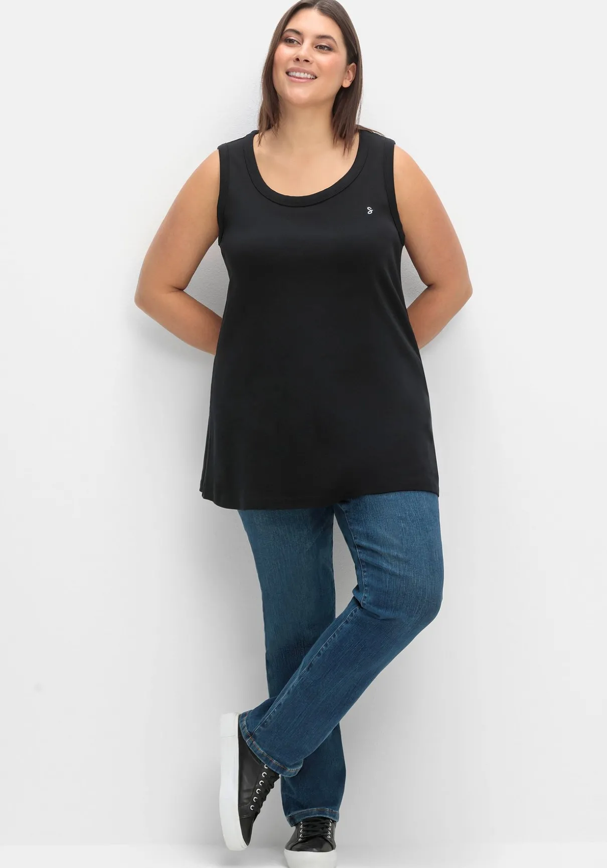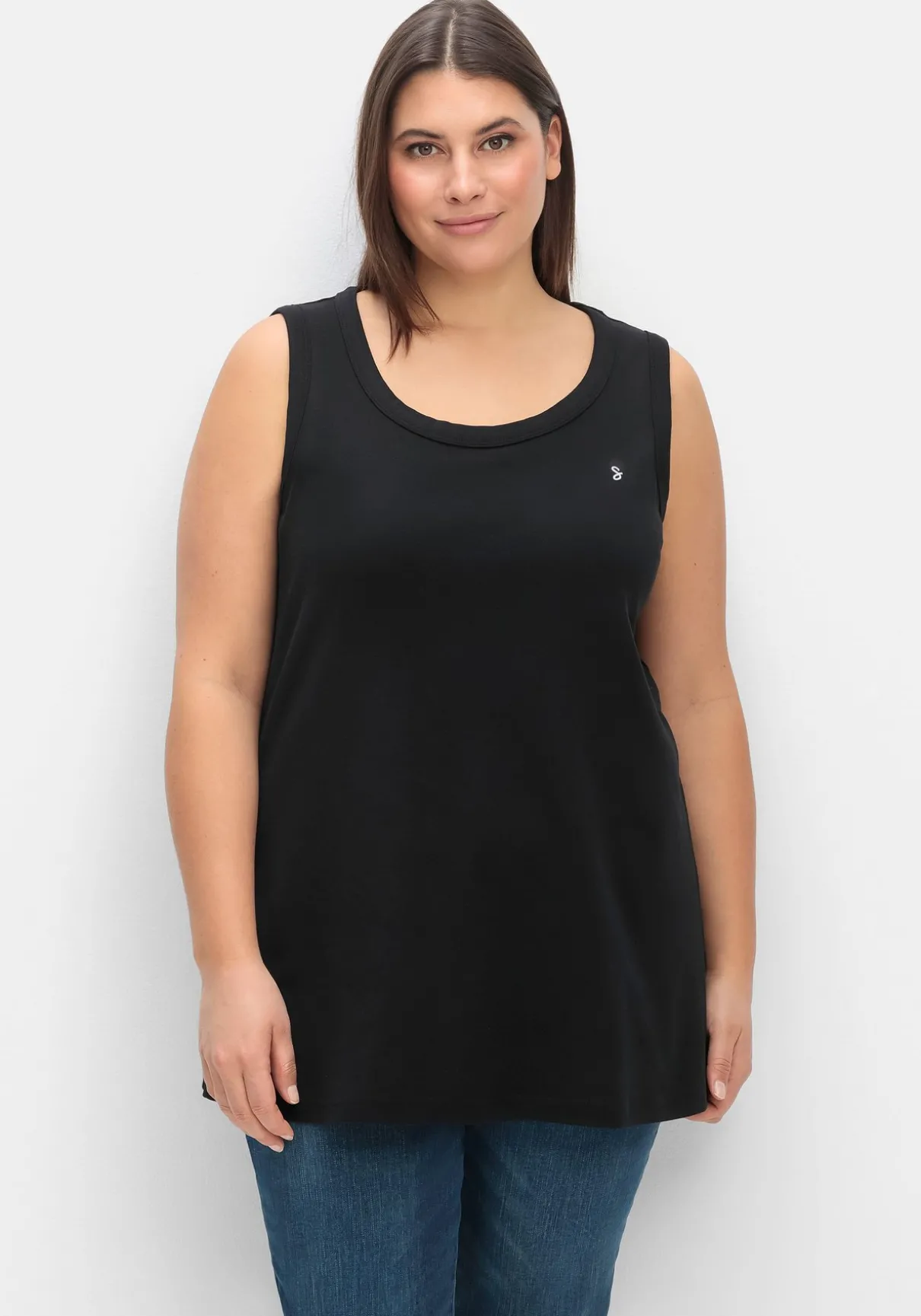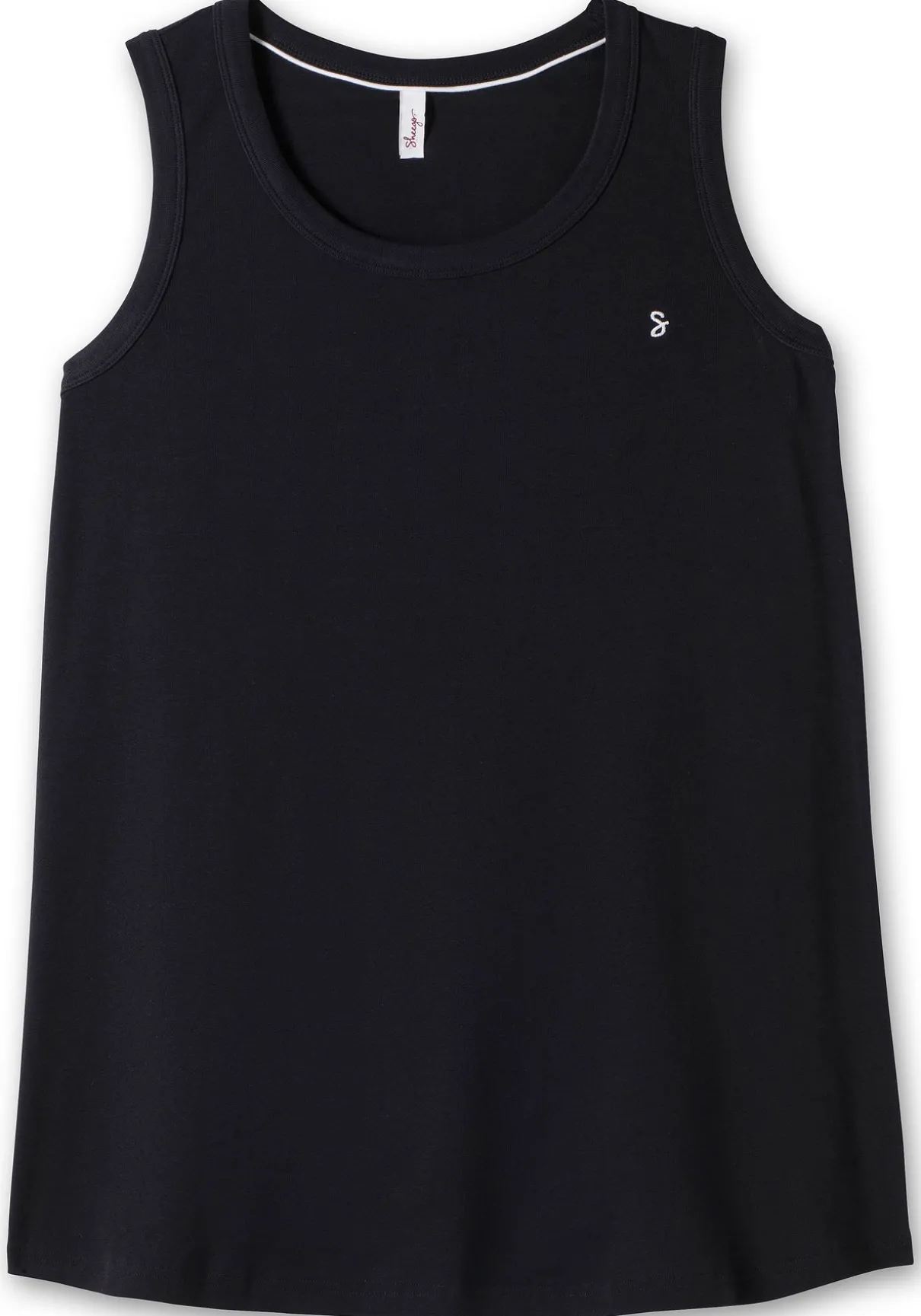 Top in feiner Rippstruktur. Der schlichte, ärmellose Style ist mit Rundhalsausschnitt, breiten Trägern und geradem Saumabschluss gearbeitet. Eine kleine Logostickerei auf der linken Brustseite sowie ein Piping innen im Nacken setzen sich kontrastfarben ab.