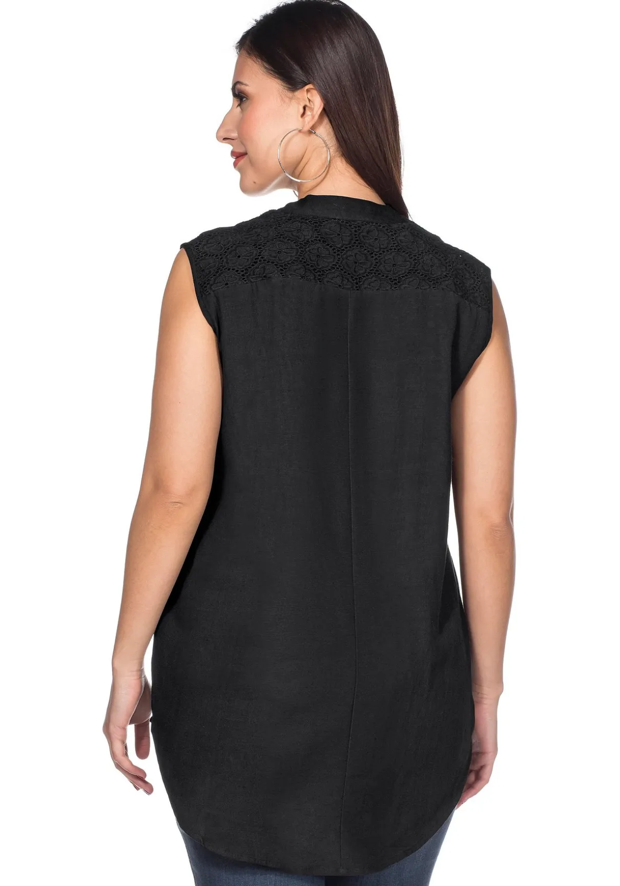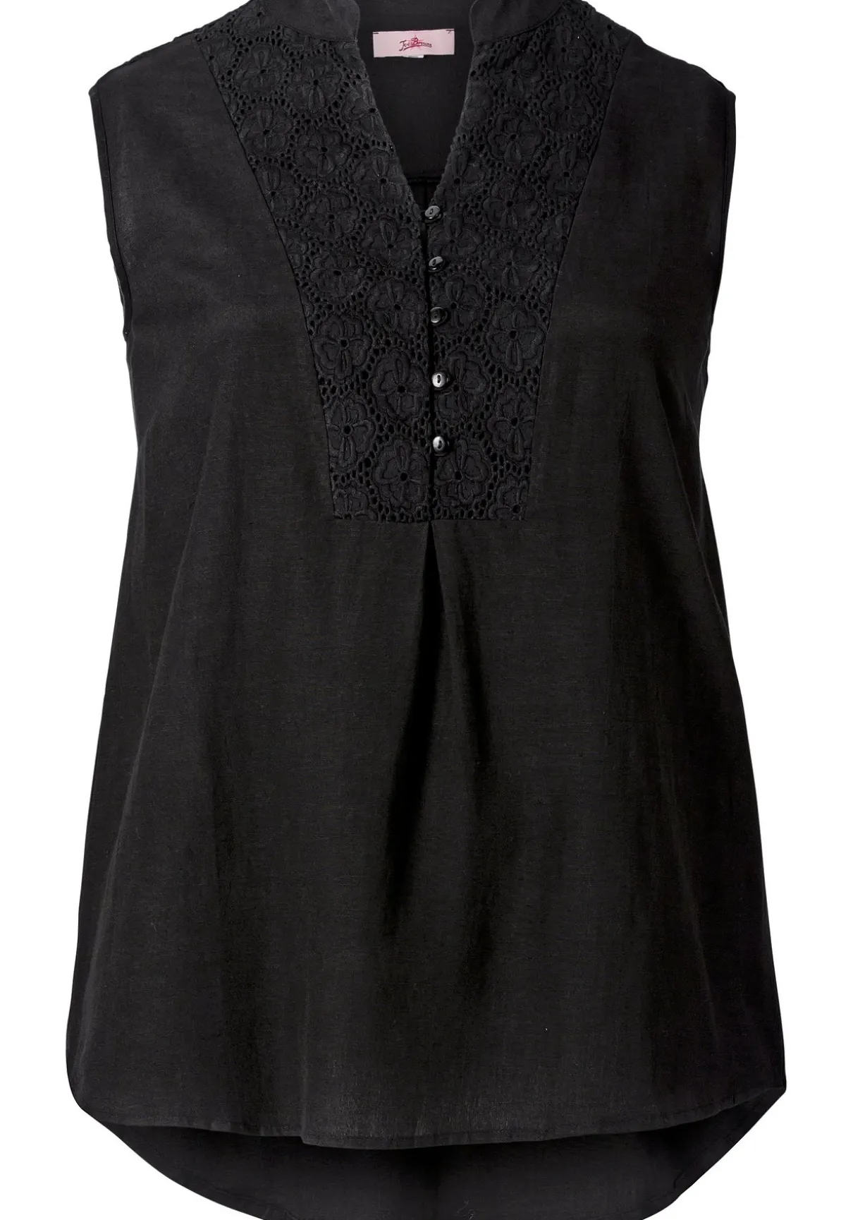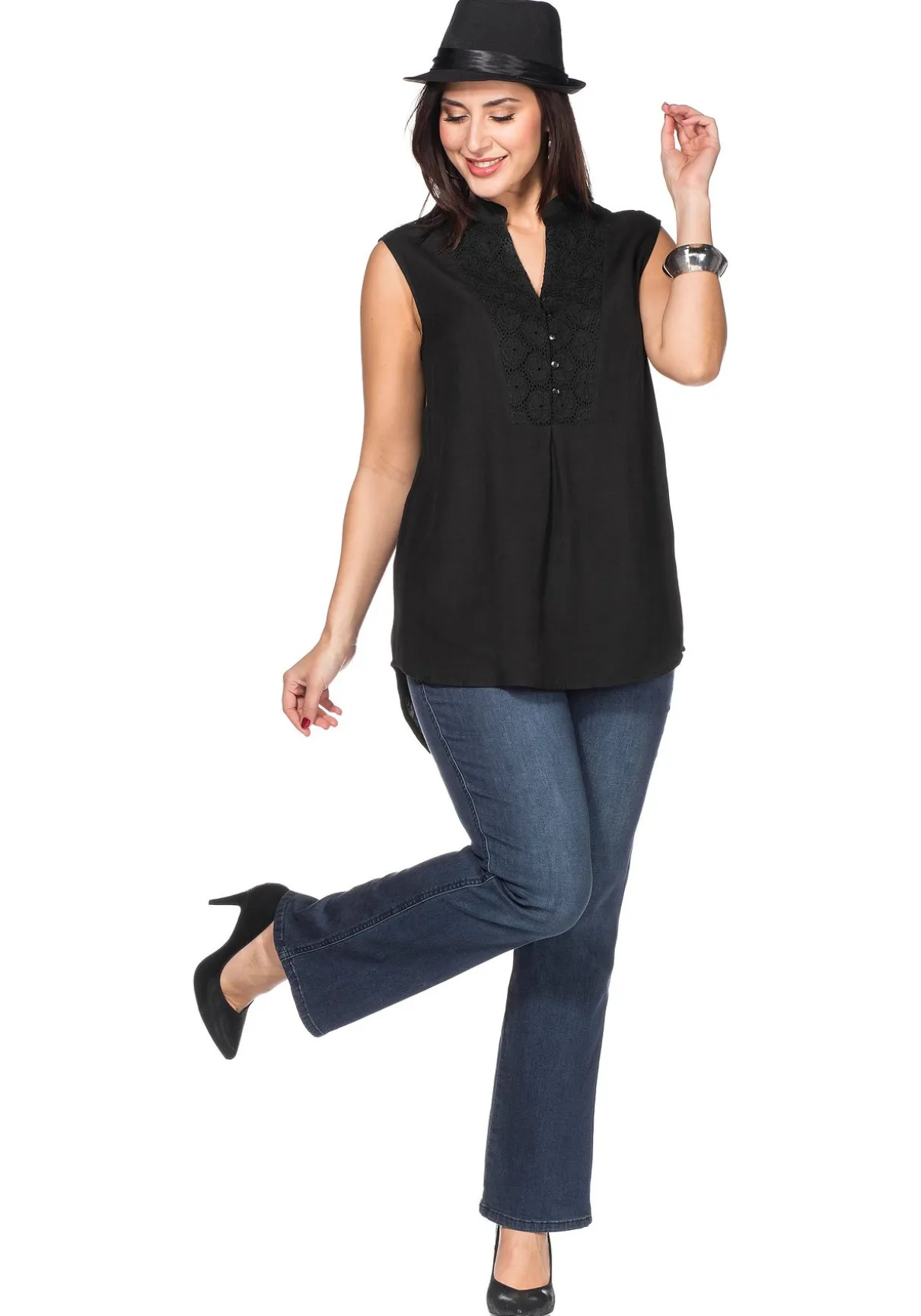 Schlicht und schön ist das Webtop von sheego by Joe Browns. Der edle Look entsteht durch den aufwendigen Spitzenbesatz um den Ausschnitt und an den Schultern. Der Rundhalsausschnitt geht in eine Knopfleiste über.