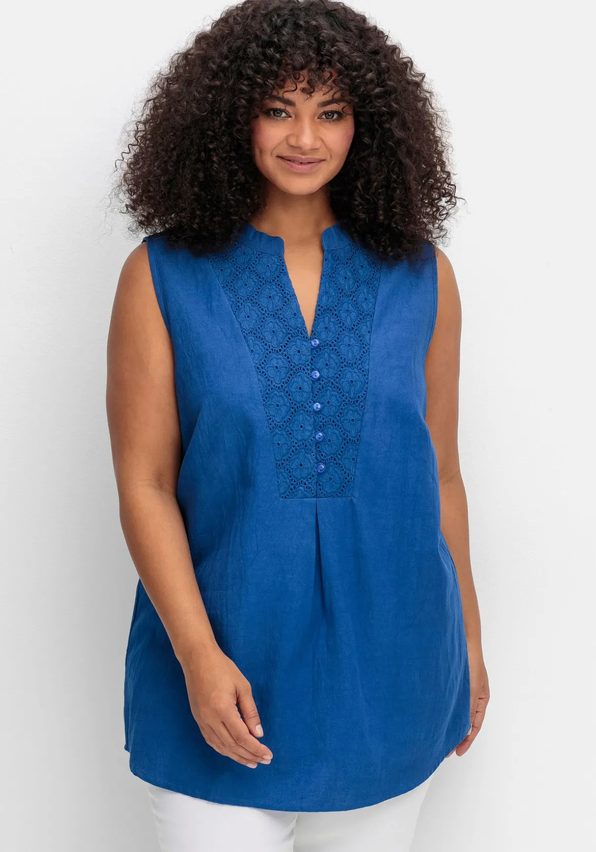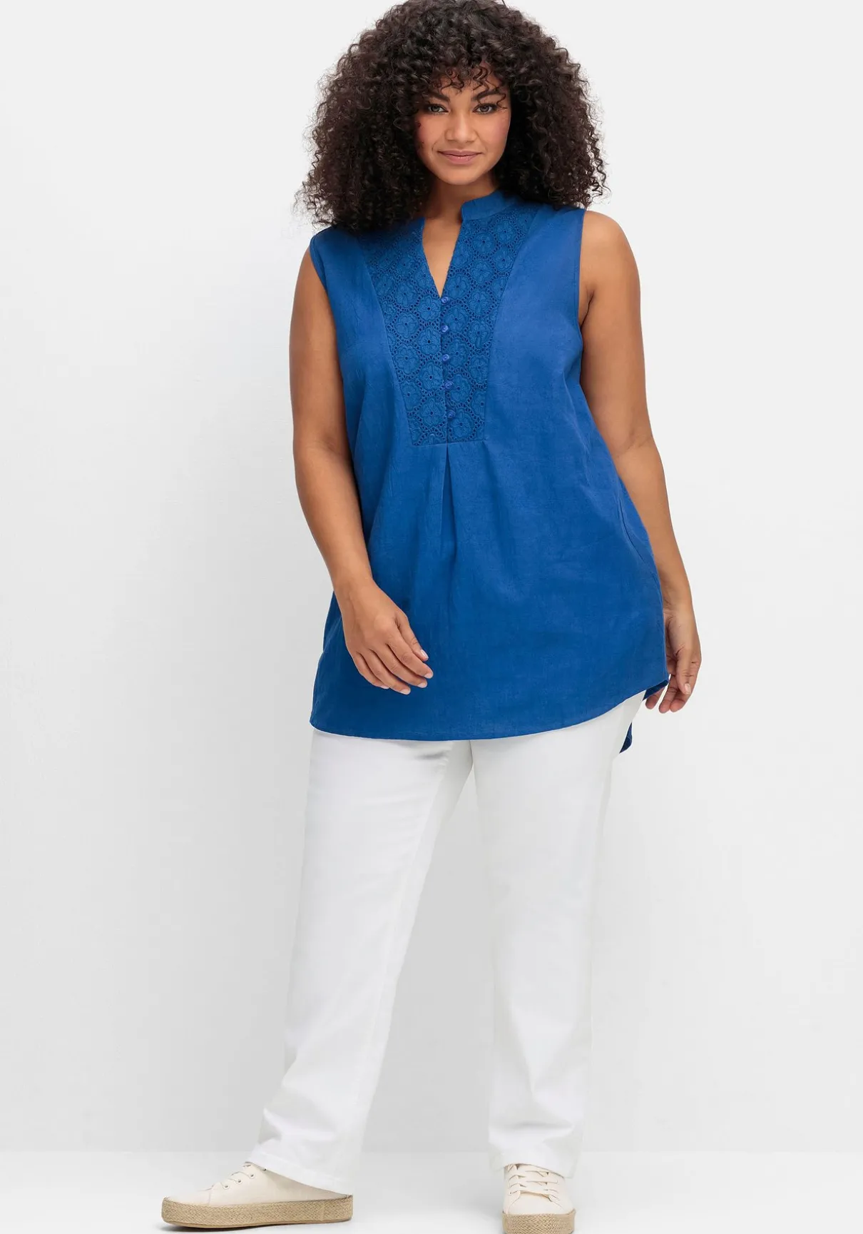 Schlicht und schön ist das Webtop von sheego by Joe Browns. Der edle Look entsteht durch den aufwendigen Spitzenbesatz um den Ausschnitt und an den Schultern. Der Rundhalsausschnitt geht in eine Knopfleiste über.