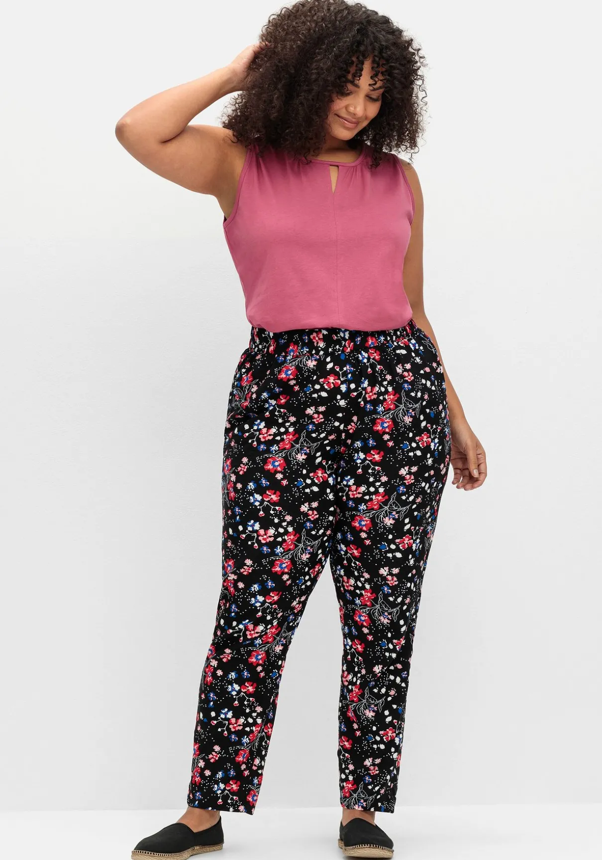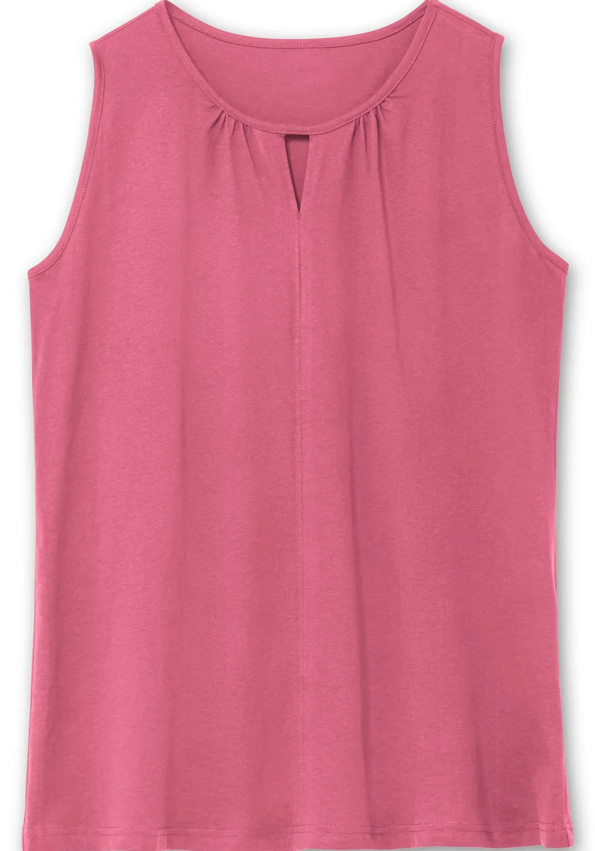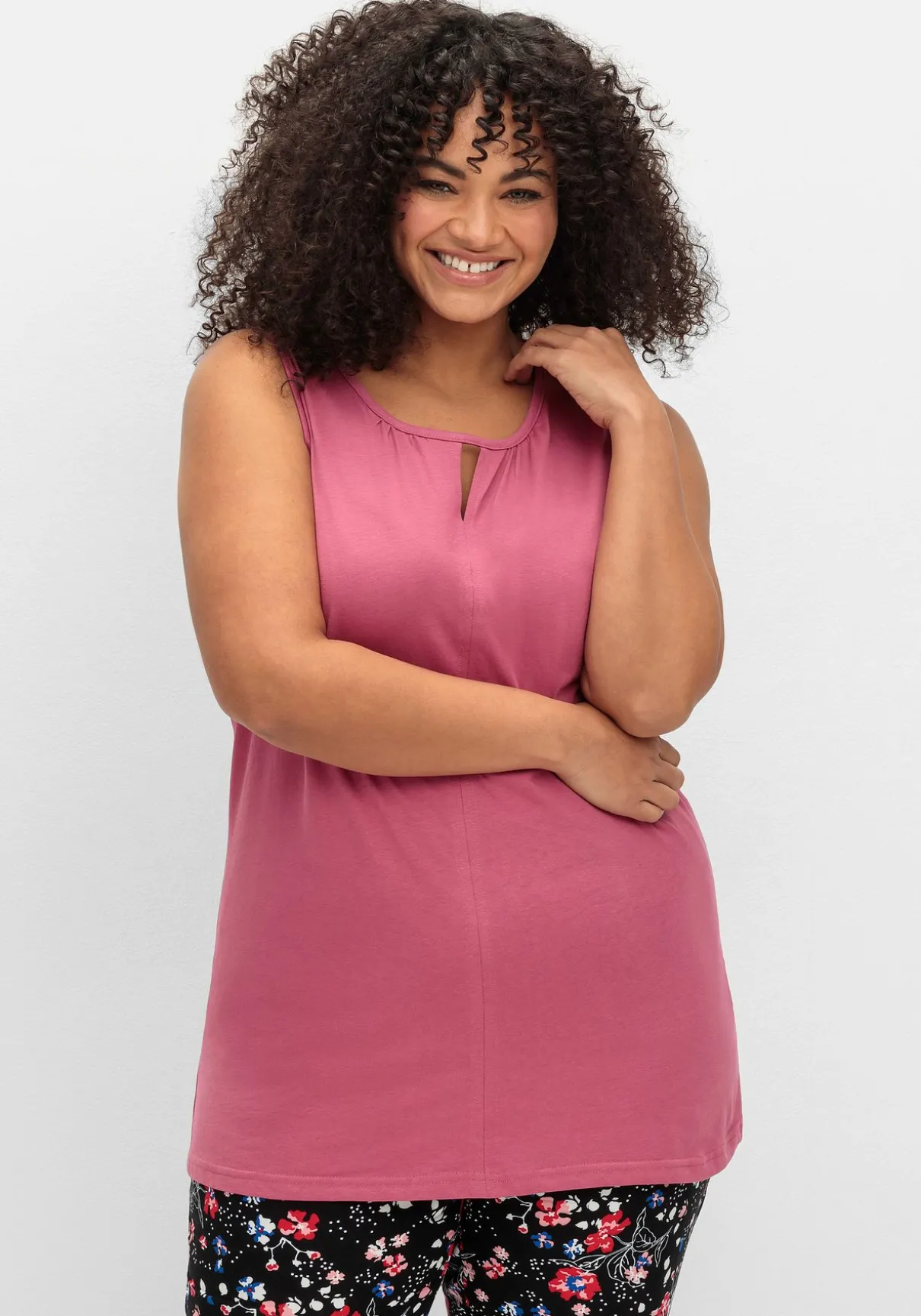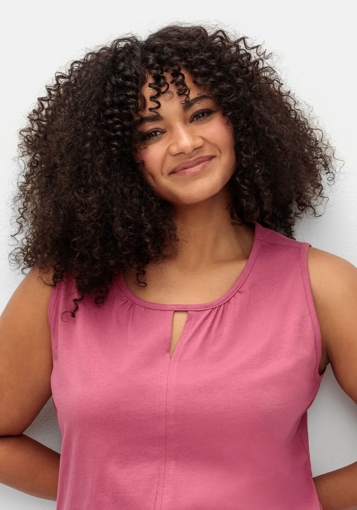 Jerseytop mit raffinierten Details. Der paspelierte Rundhalsausschnitt ist mit kleinen Raffungen und Cut-Out gearbeitet und verleiht so dem Top eine feminine Note. Der ärmellose Schnitt mit breiten, bequemen Trägern macht das Oberteil zum idealen Sommerbegleiter.