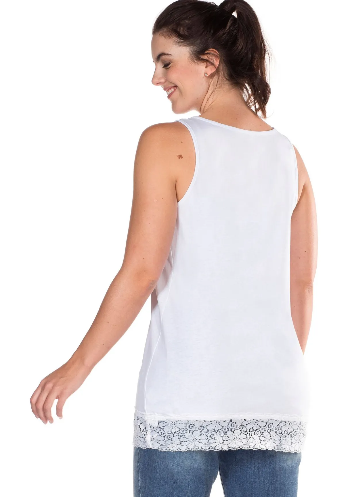 Das unkomplizierte Basic Top wirkt dank der Spitzenbordüre am Saum verspielt und feminin. Ansonsten ist das Top schlicht gehalten. Der Rundhalsausschnitt und die figurumspielende Passform tragen zum angenehmen Tragekomfort bei. Unser Tipp: Das Top eignet sich für den angesagten Layering-Look.