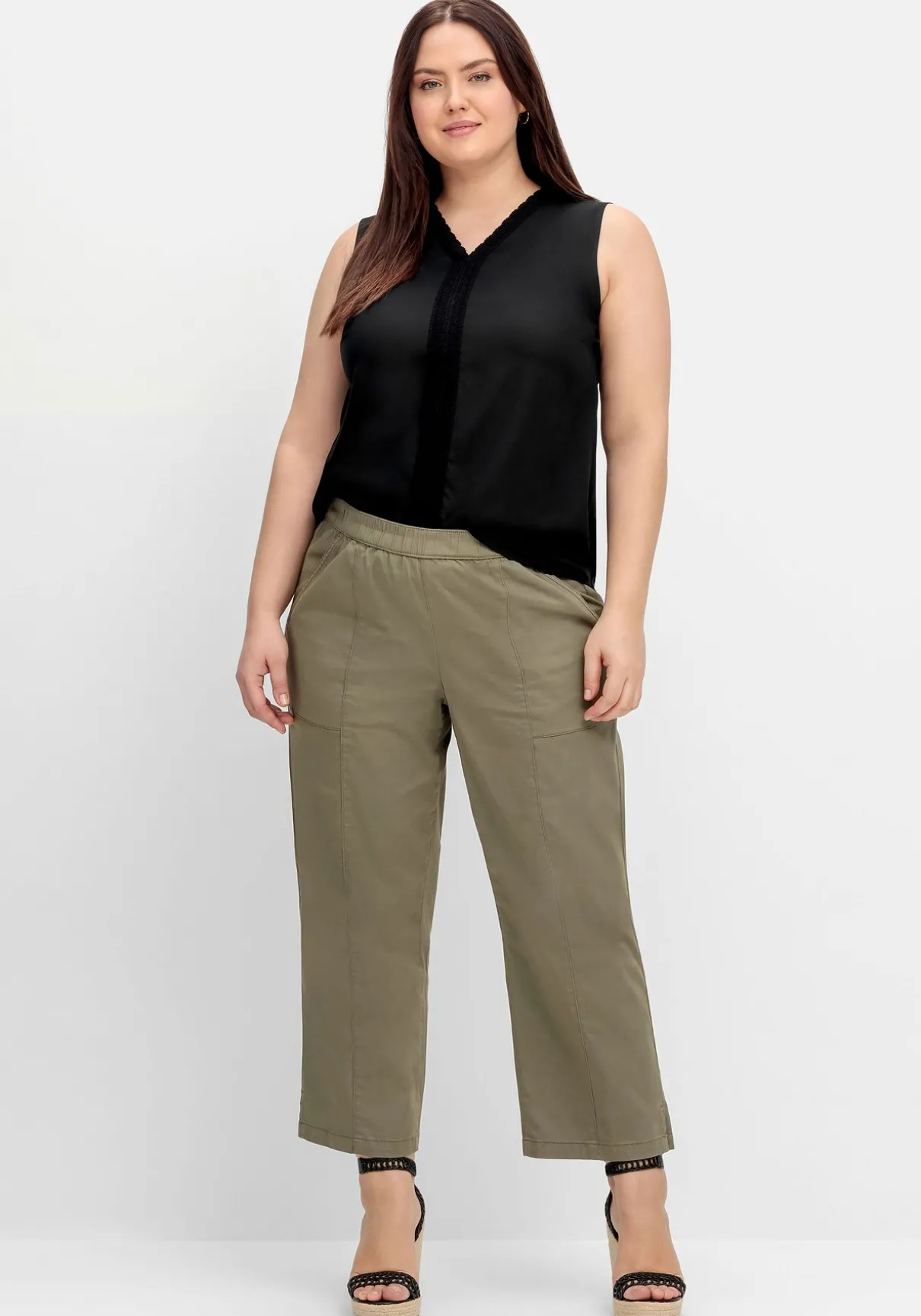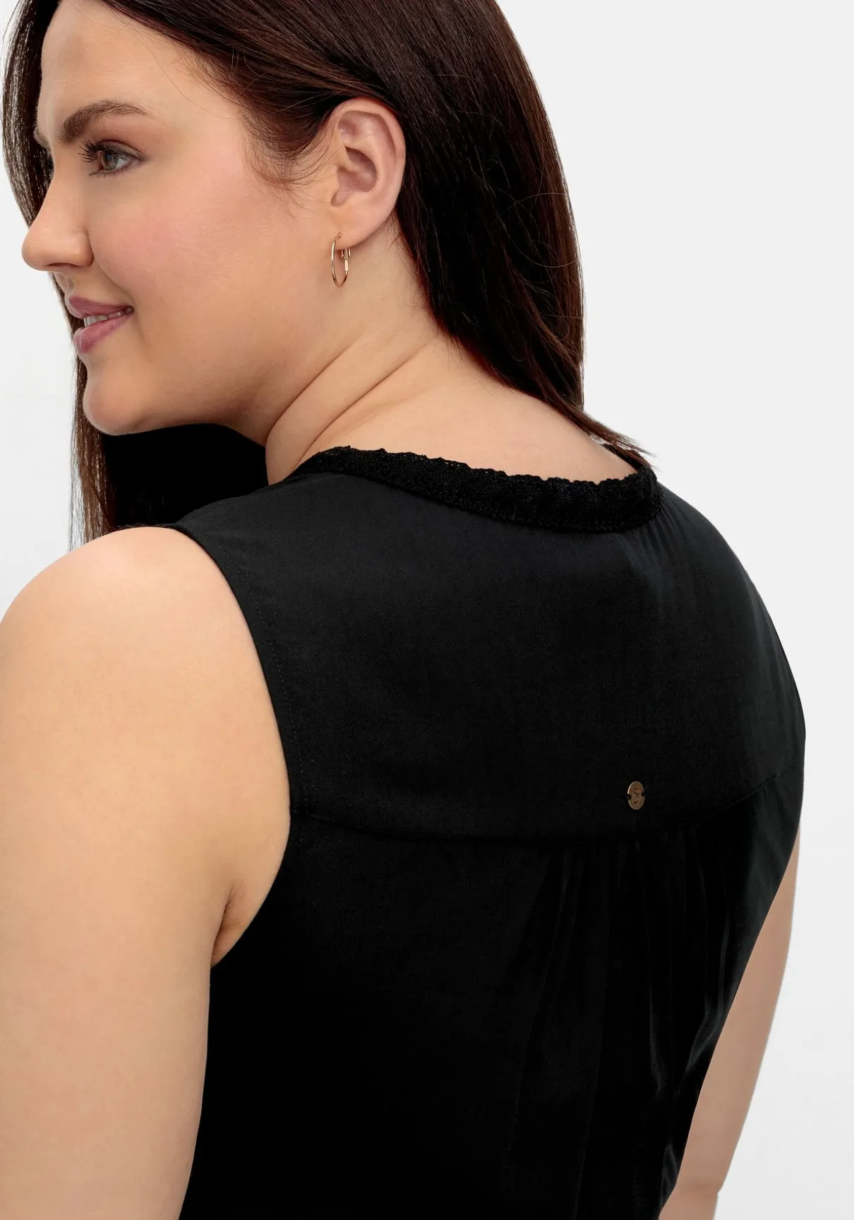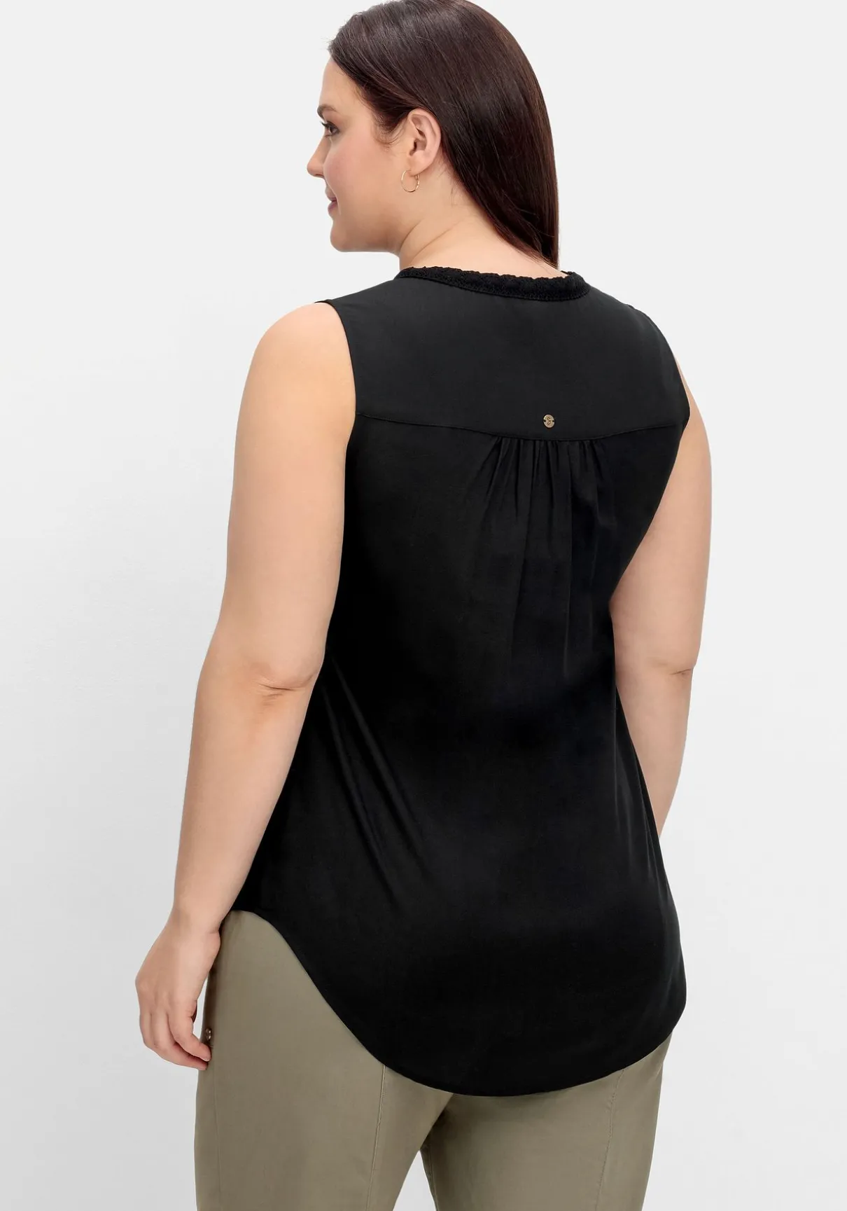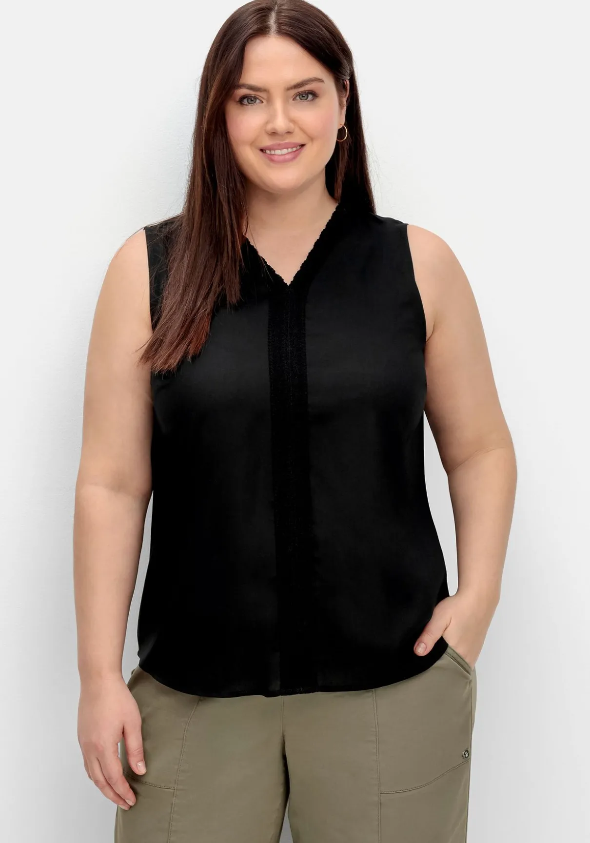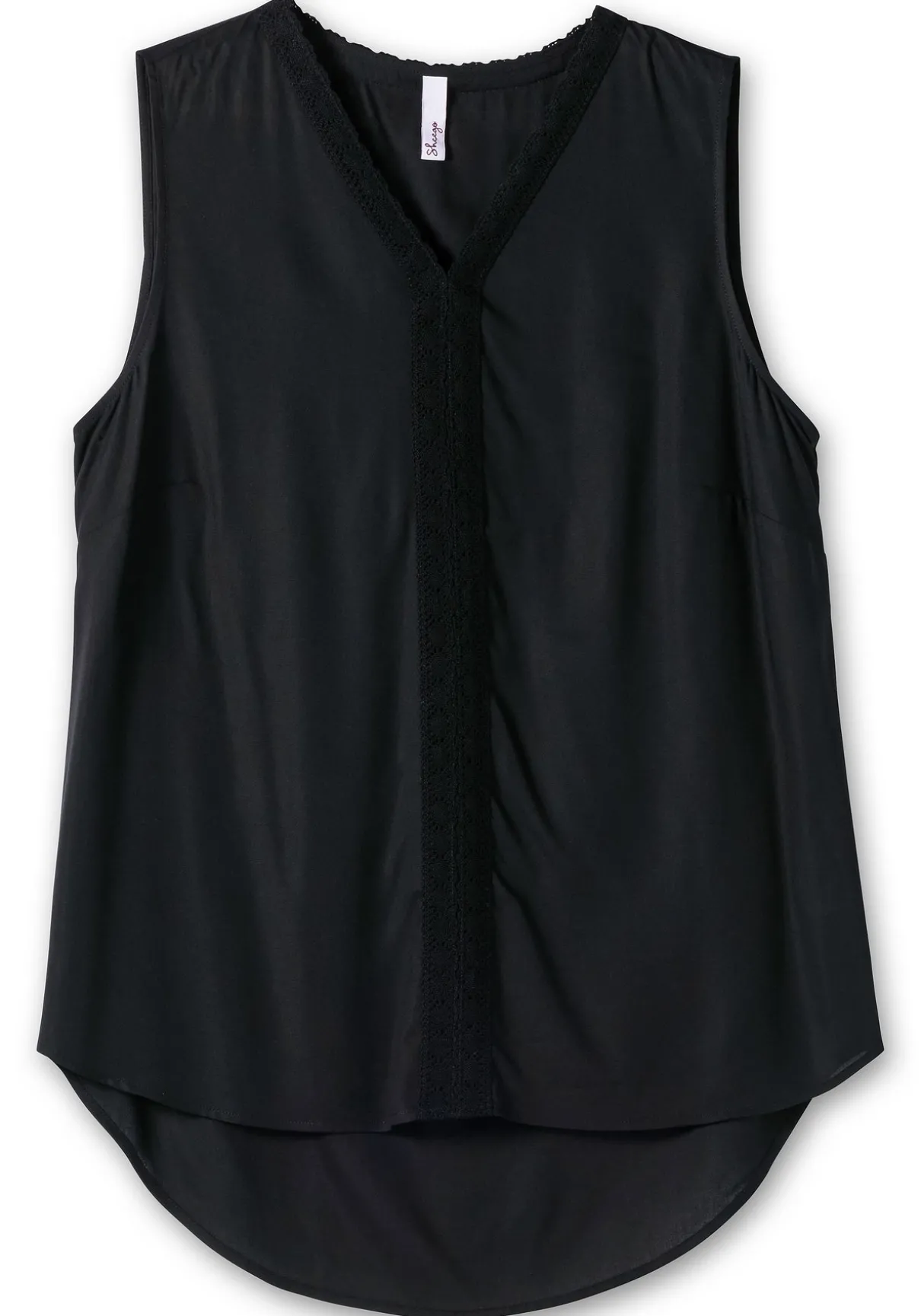 Top mit V-Ausschnitt. Dekorative Häkelspitze umsäumt den Ausschnitt und verläuft vorn mittig bis zum Saum. Für eine gute Passform ist das Oberteil hinten mit Passe gearbeitet, die dezente Kräuselung darunter lässt das verlängerte Rückteil mit gerundetem Saum locker fallen.