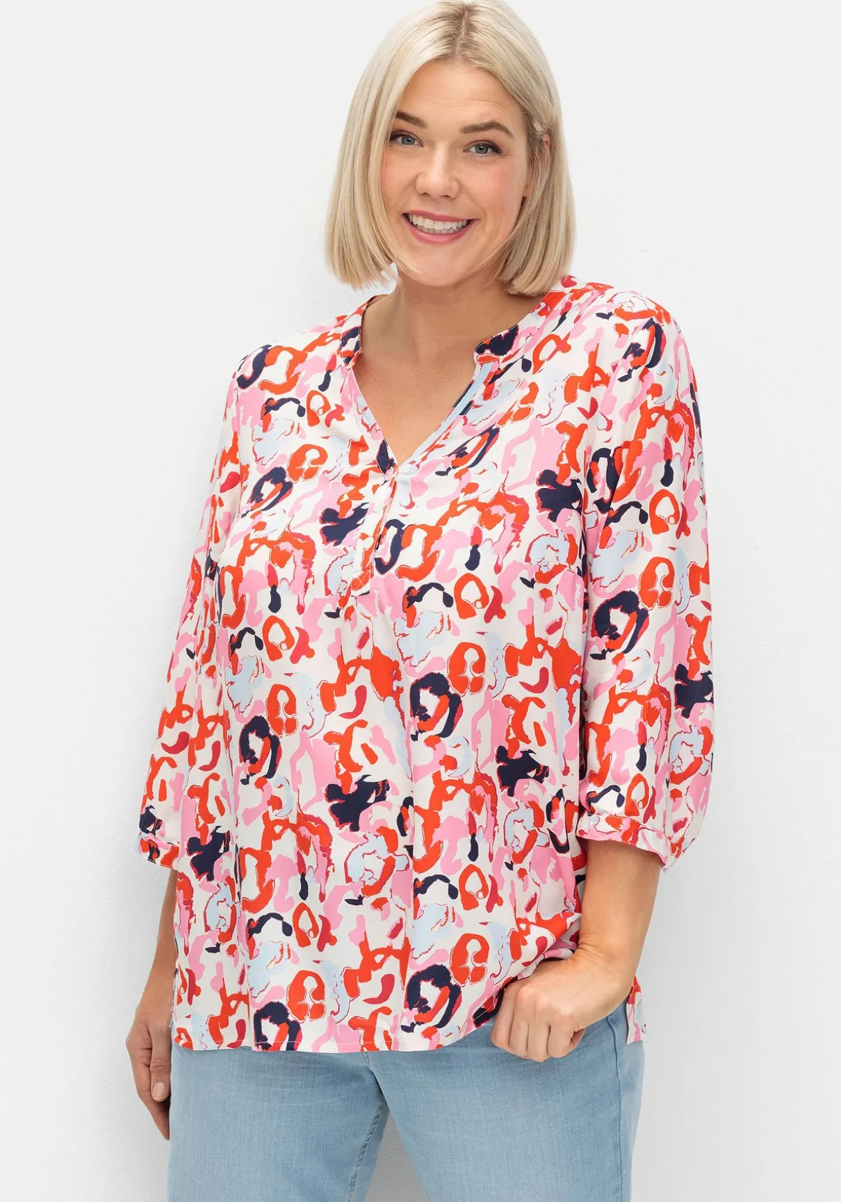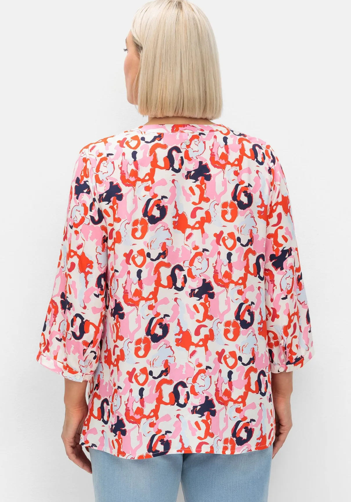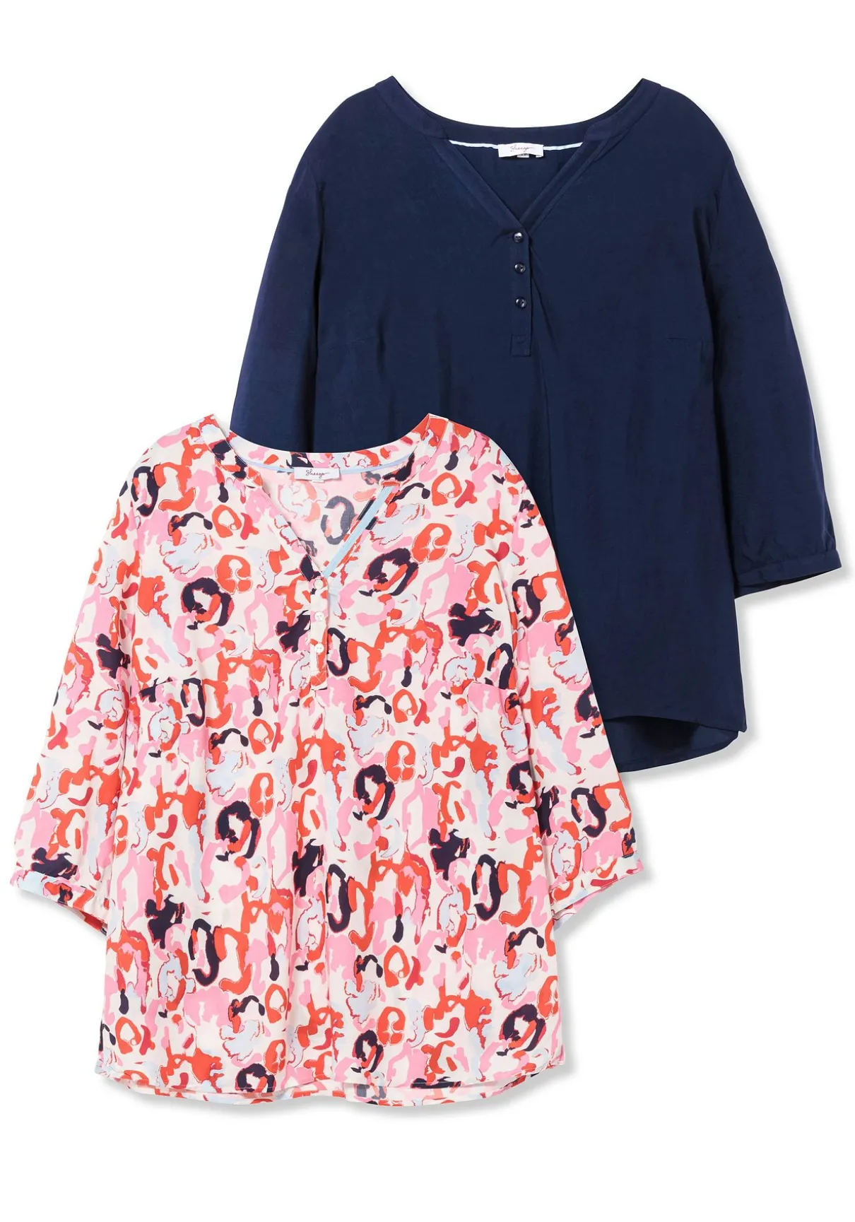 Tuniken im Doppelpack. Das Set besteht aus einer unifarbenen und einer mit abstraktem Alloverprint bedruckten Tunika. Sie sind mit V-Schlitz und Knopfleiste gearbeitet, die 3/4-langen Ärmeln enden mit schmalen, weitenverstellbaren Manschetten. Durch den lockeren Schnitt und die Seitenschlitze am Saum lassen sie sich zu vielen entspannten Looks kombinieren.