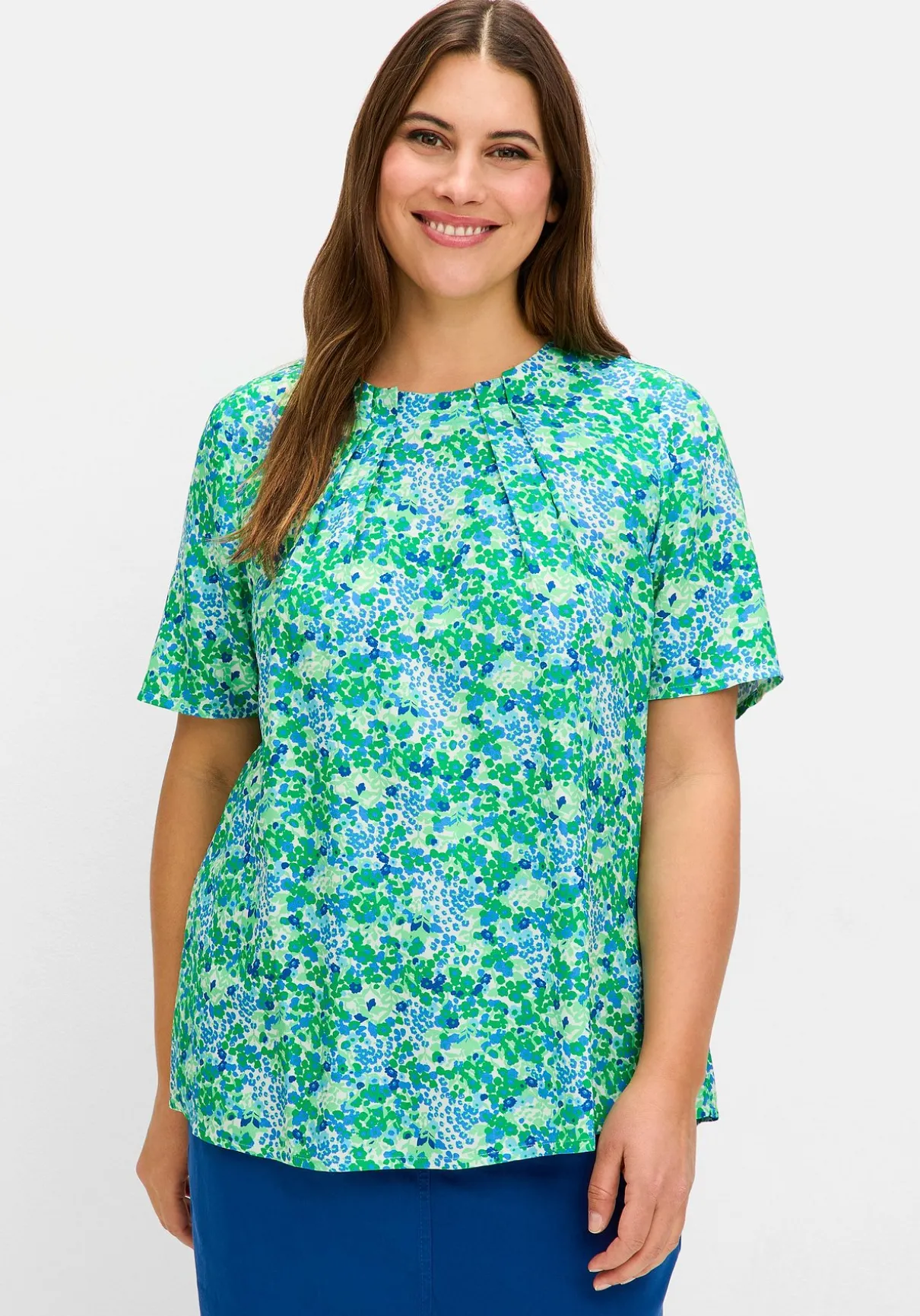 Tunika in leichter A-Linie. Dekorative Falten am Rundhalsausschnitt verleihen dem Oberteil femininen Charme. Der Schlitz mit Knopfverschluss im Nacken ist eine stilvolle Ergänzung. Der verlängerte Halbarm schmeichelt den Oberarmen, während die leichte A-Linie eine feminine Silhouette schafft.