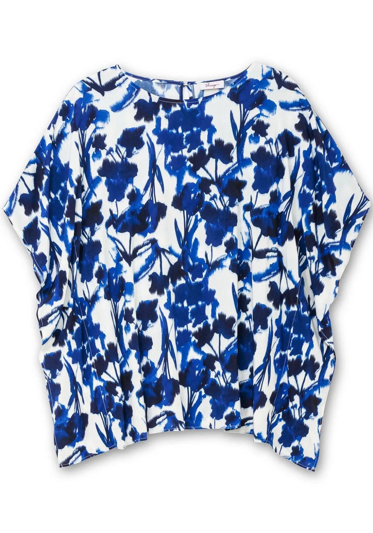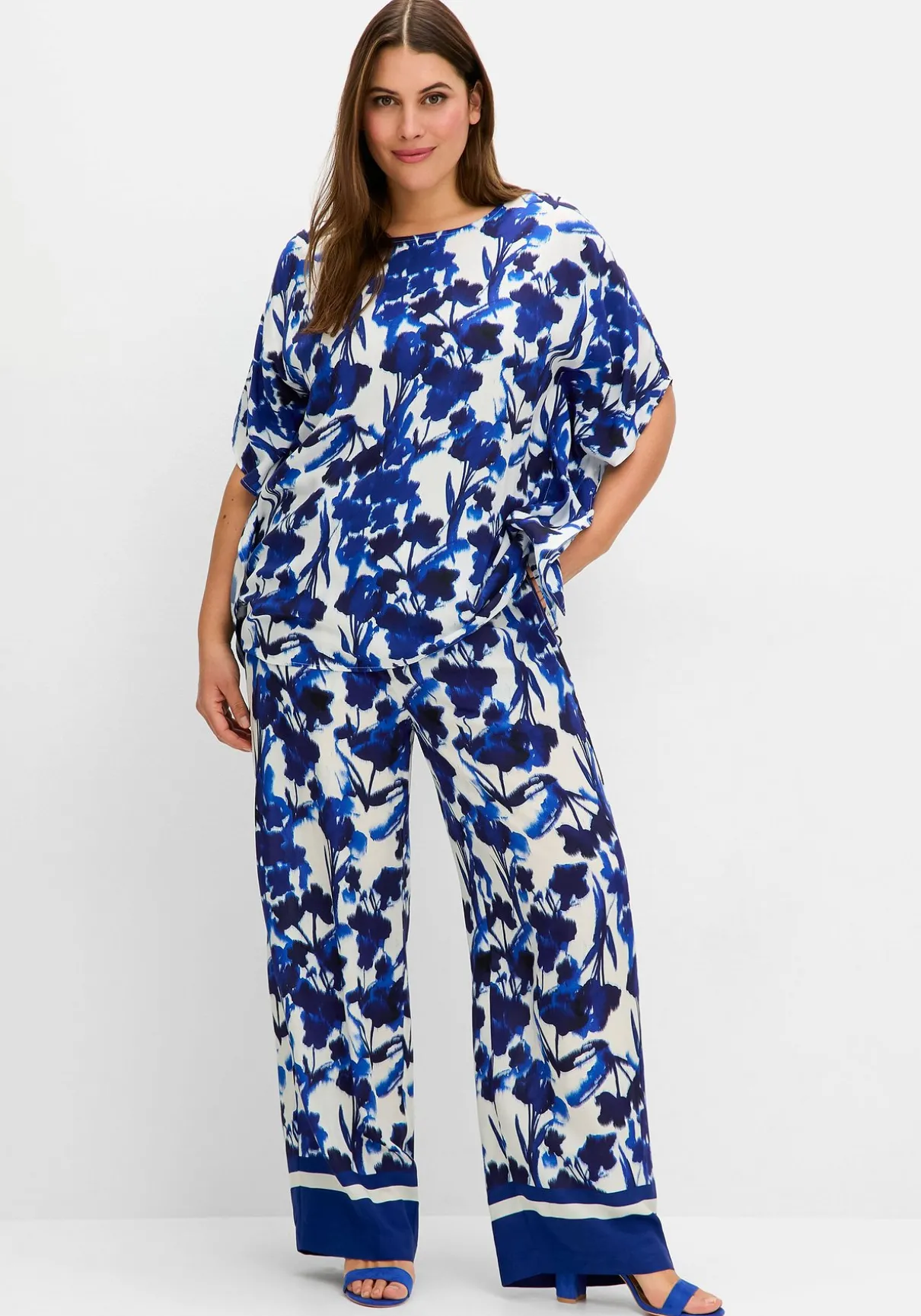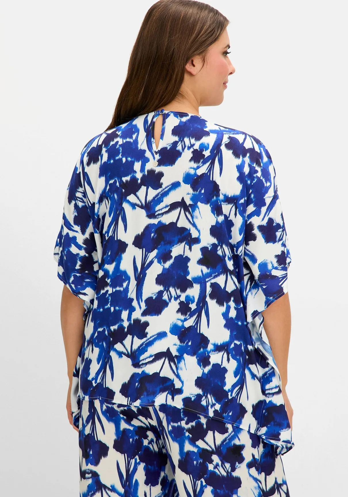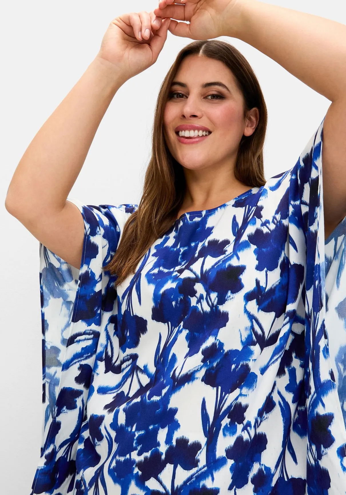 Tunika mit Blumenprint. Der Rundhalsausschnitt wird durch einen Schlitz mit Knopfverschluss im Rücken stilvoll ergänzt. Die weite Form mit überschnittenen Schultern und zipfeligem Saum sorgt für eine lässige, moderne Optik.