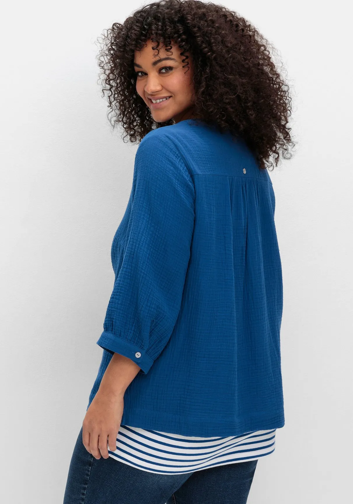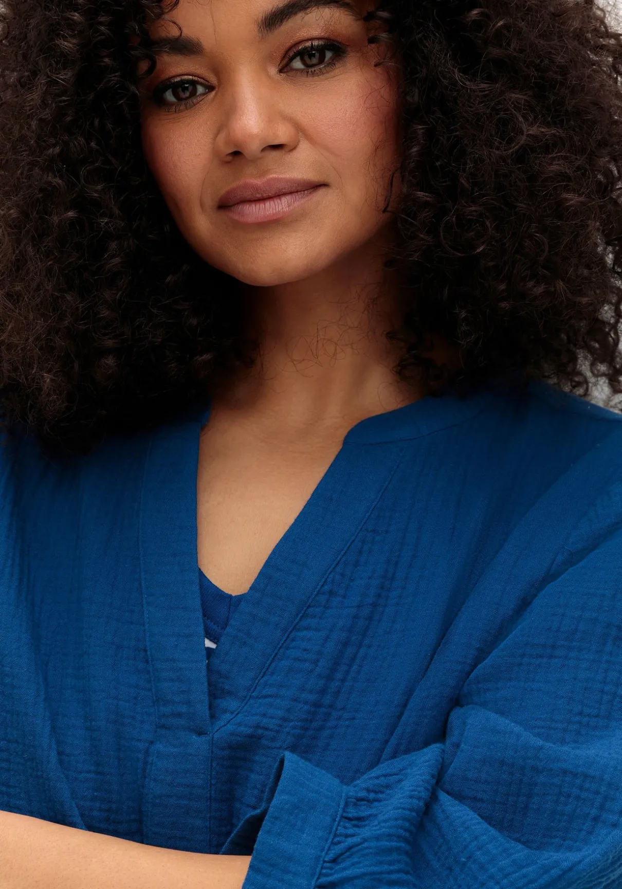 Der Musselin-Stoff aus softer Baumwolle besitzt eine dezent strukturierte Optik, trägt sich herrlich leicht und liegt weich auf der Haut.