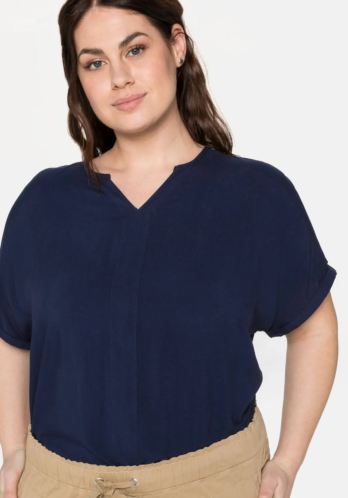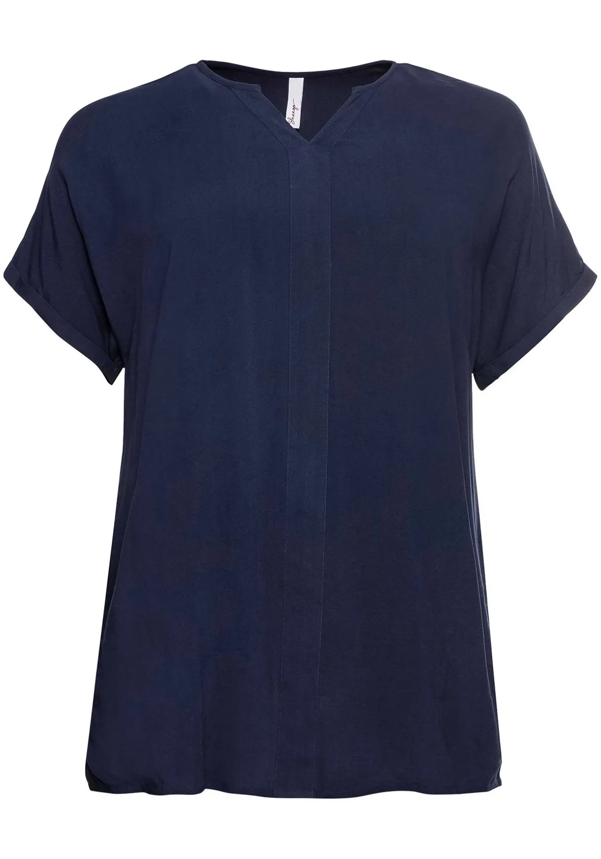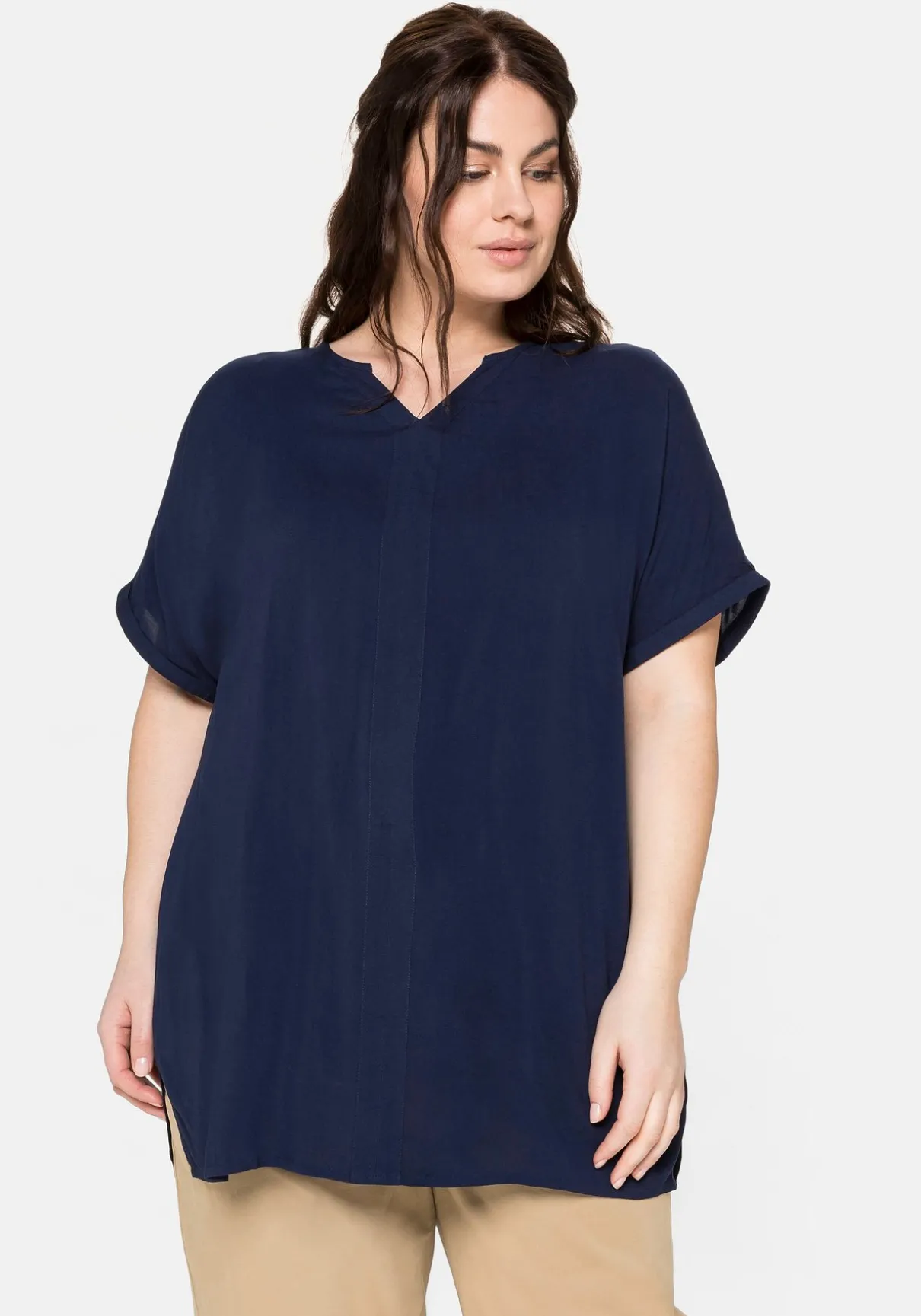 Durch den lockeren Schnitt eignet sich die Tunika für jeden Figurtyp, die Blende vorn streckt dabei optisch die Silhouette.