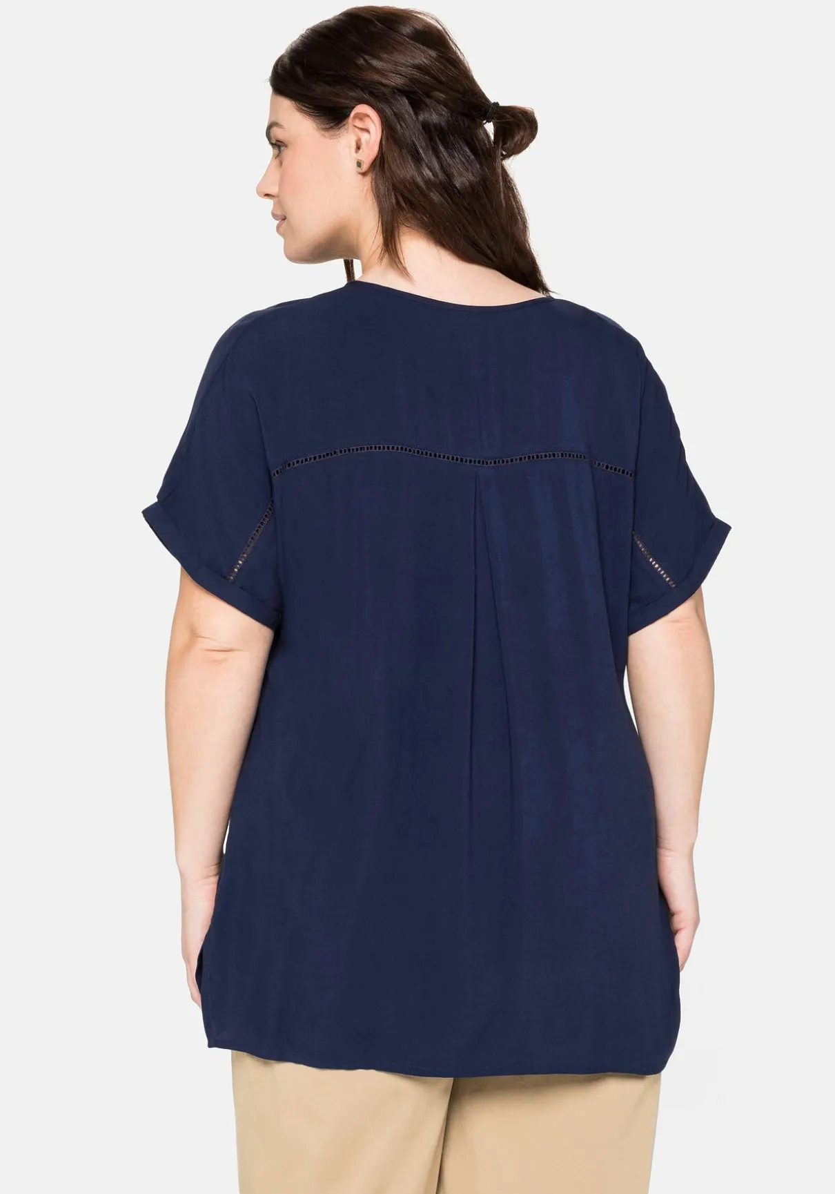 Tunika mit V-Ausschnitt. Der cleane Look erhält durch dezente Details modische Spannung: Vorn fällt die mittig gesetzte Blende ins Auge, hinten überrascht das dekorative Lochstrickmuster. An den überschnittenen Schultern befinden sich kurze Ärmel mit fixierten Umschlägen, im Rücken gibt die Passe mit Kellerfalten dem Oberteil einen schönen Fall.