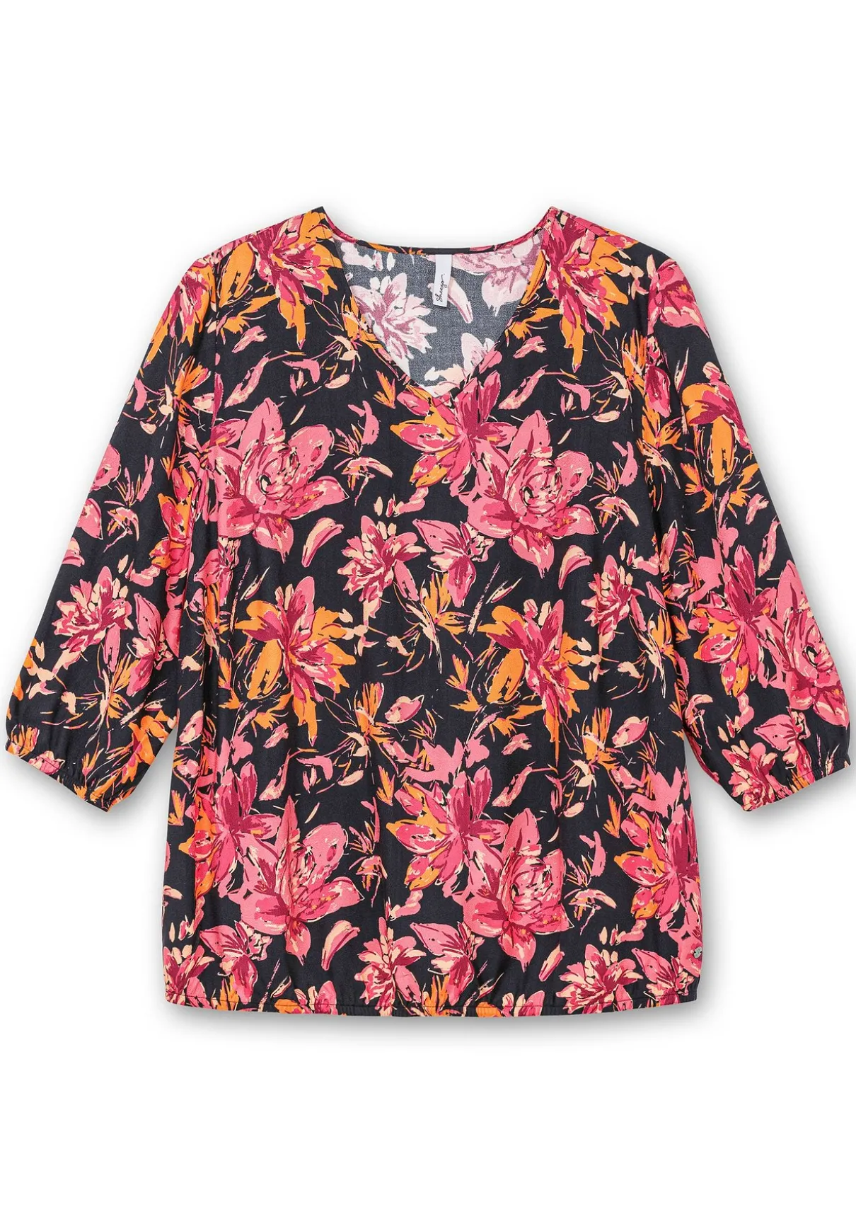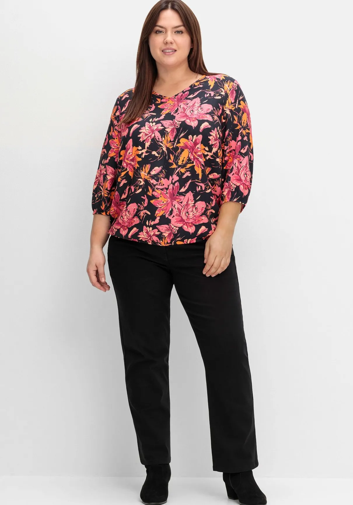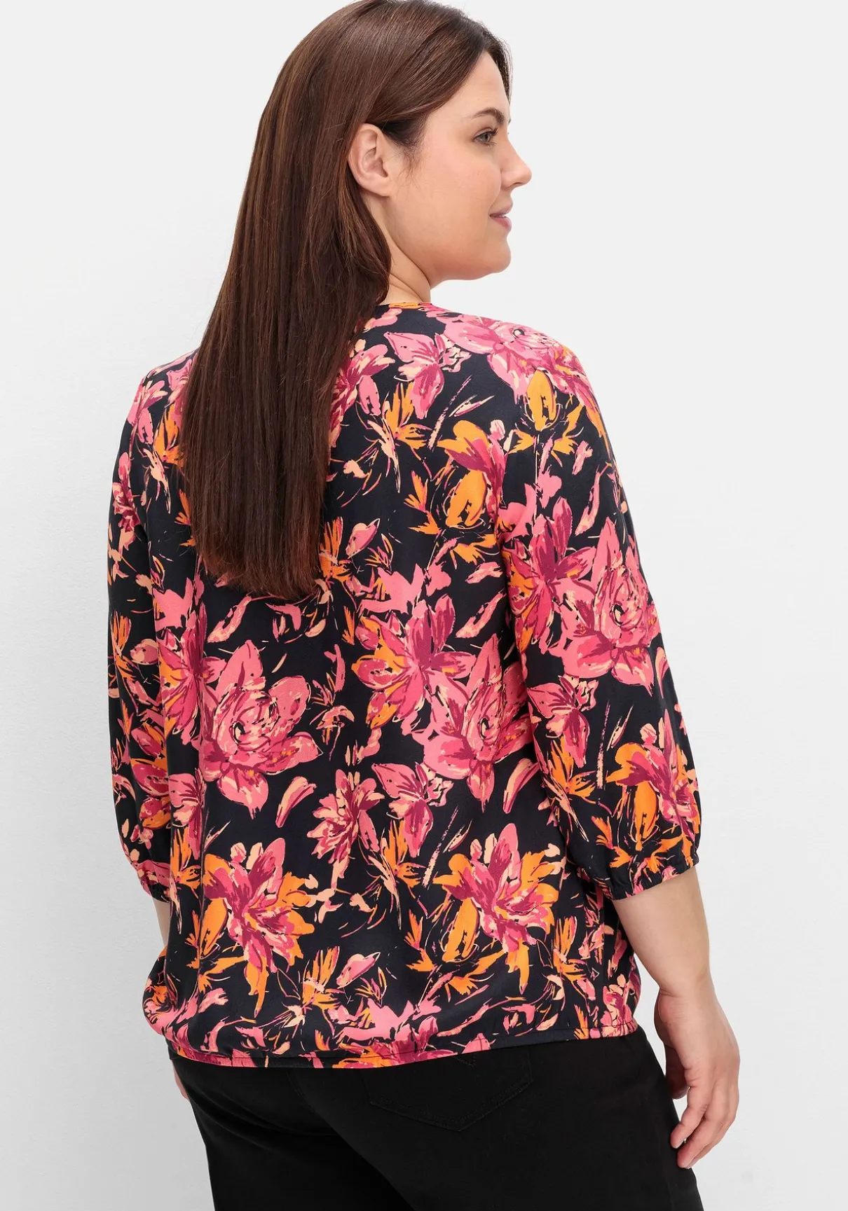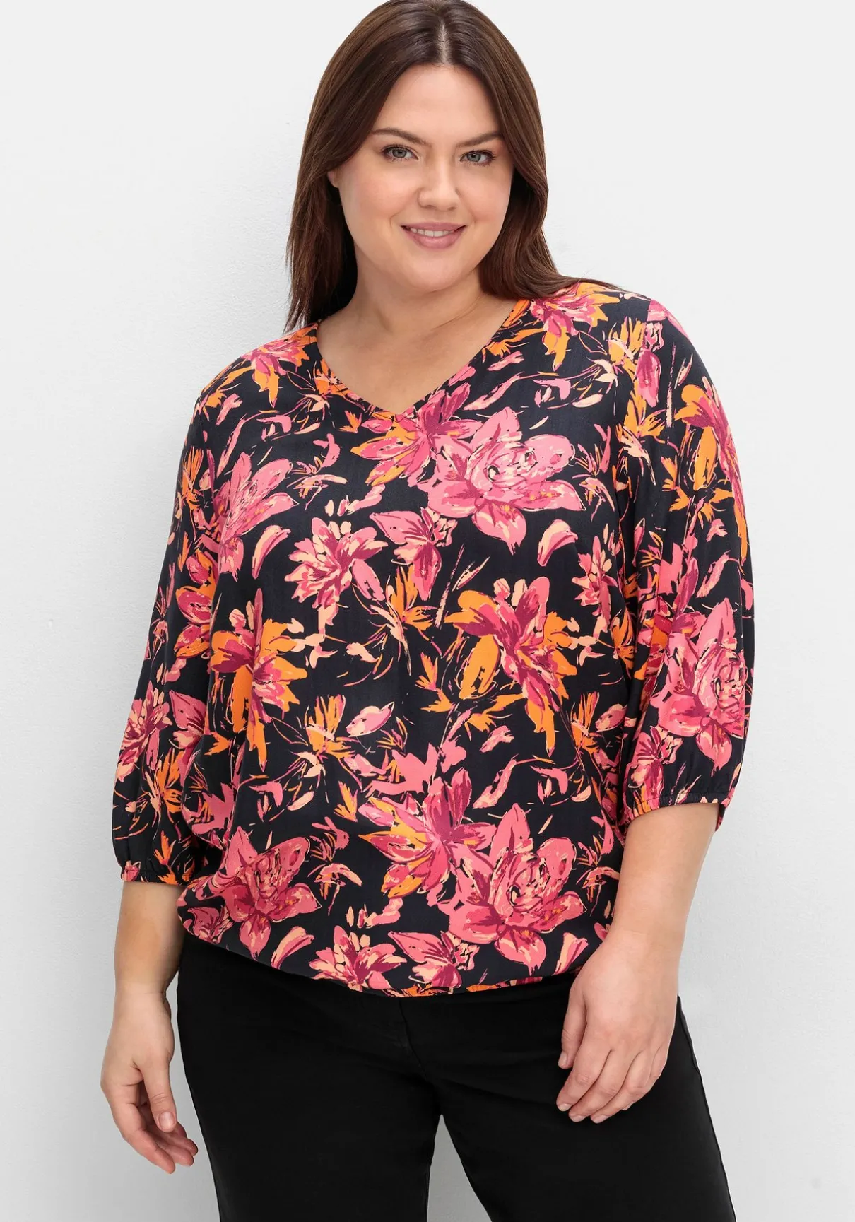 Tunika mit Blumendruck. Der aufwändige florale Print und die weich fließende Qualität verleihen dem Oberteil eine gepflegte Optik. Auch der V-Ausschnitt und die 3/4-langen Ärmel mit elastischen Bündchen unterstreichen den femininen Look. Die figurumspielende Form wird am Saum mit einem Gummibund zusammengefasst und lässt so bequeme Weite rund um die Bauchpartie entstehen.