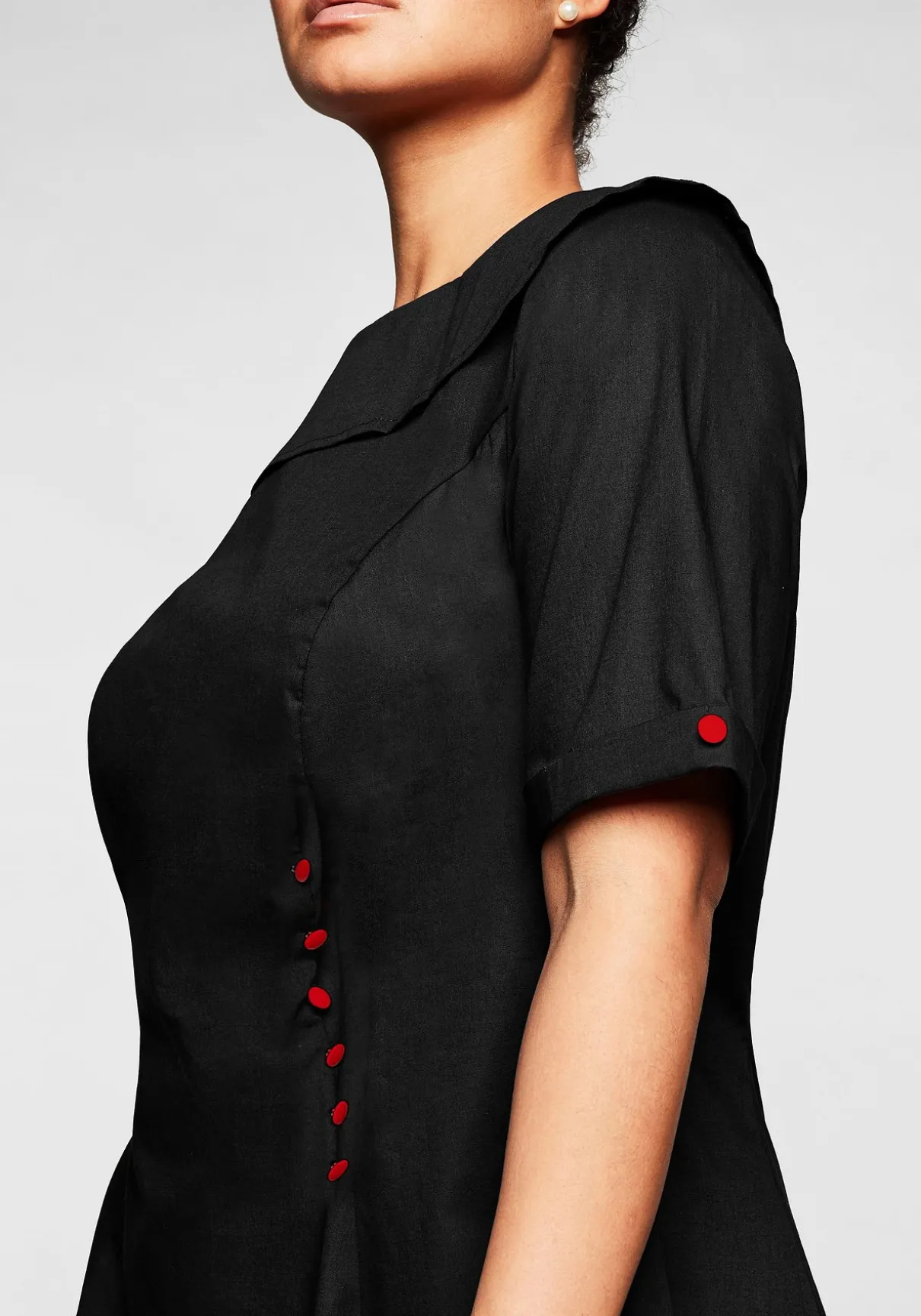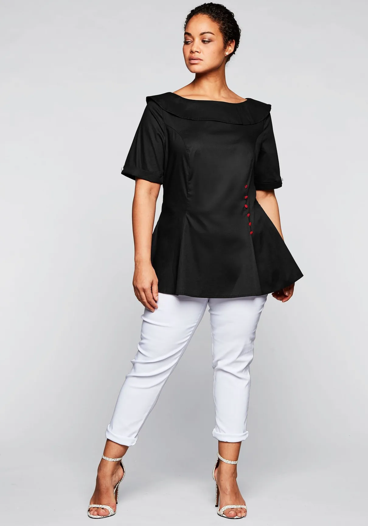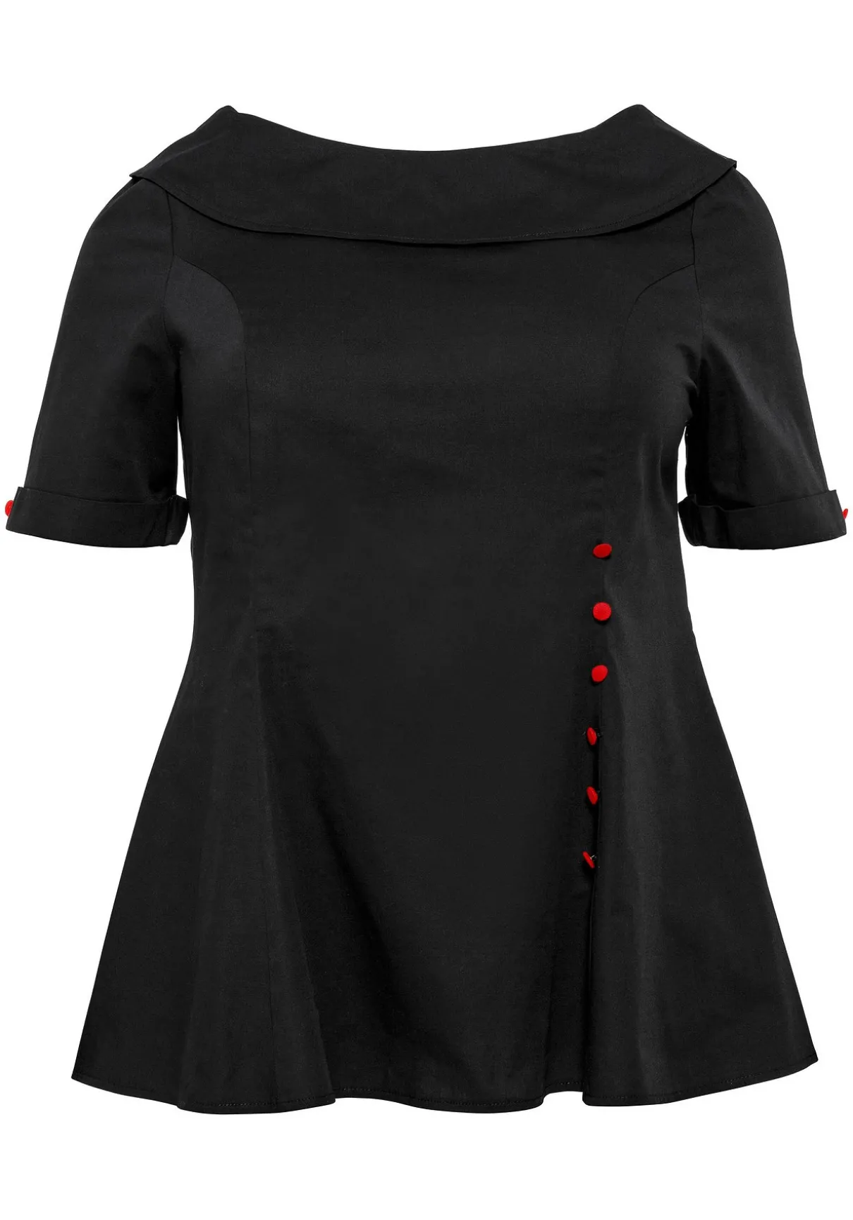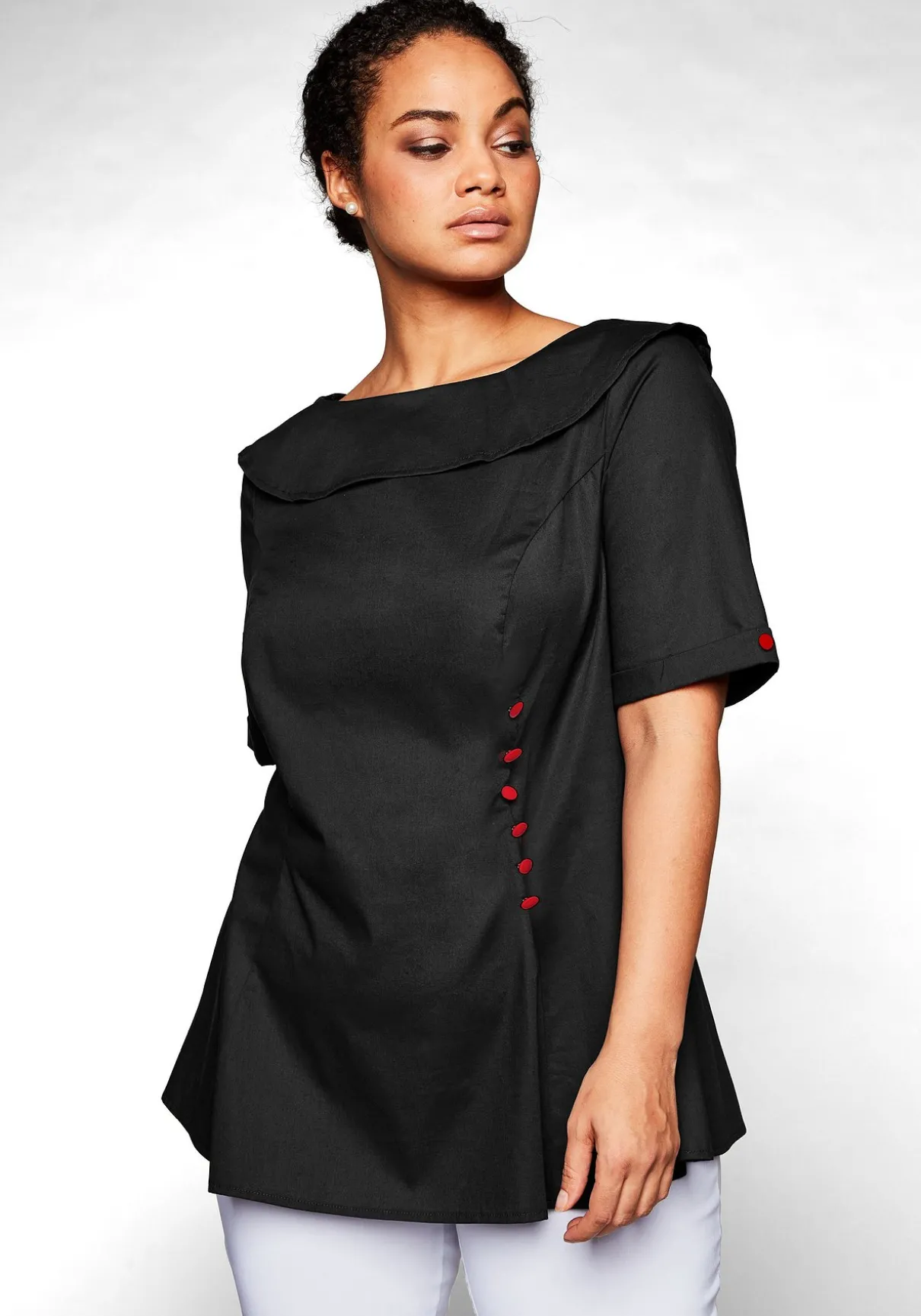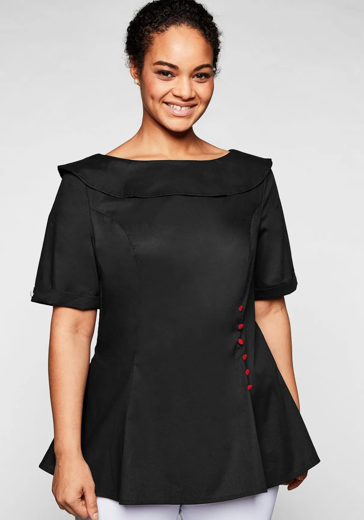 Tunika von sheego by Joe Browns. Für die feminine Optik sorgt der weite Ausschnitt mit breitem, rundem Kragen. Auch die kontrastfarbenen Zierknöpfe fallen ins Auge. Die kurzen Ärmel enden mit Aufschlägen. Dank des seitlichen, nahtfeinen Reißverschlusses wird das Ankleiden erleichtert.