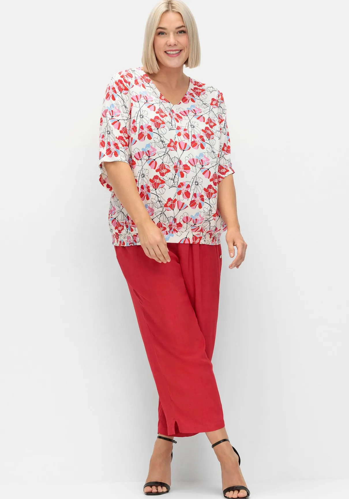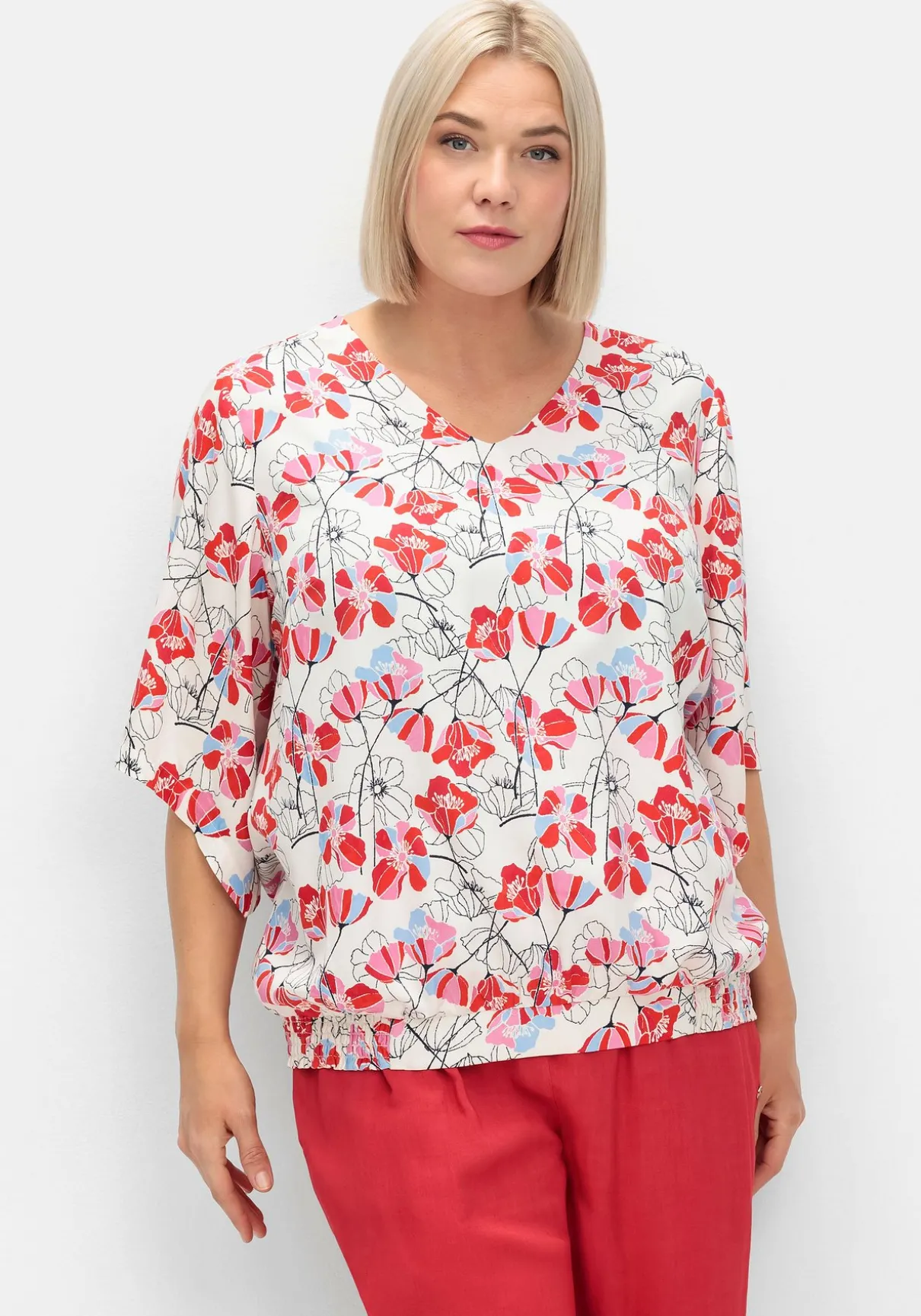 Tunika mit floralem Alloverprint. Das wunderschöne Blumenmuster wirkt leicht und feminin, der raffinierte Schnitt gibt dem Look Modernität. Dabei sorgen die locker geschnittenen, leicht verlängerten Flügelärmel genauso für Tragekomfort wie der bequeme Smokbund am Saum.