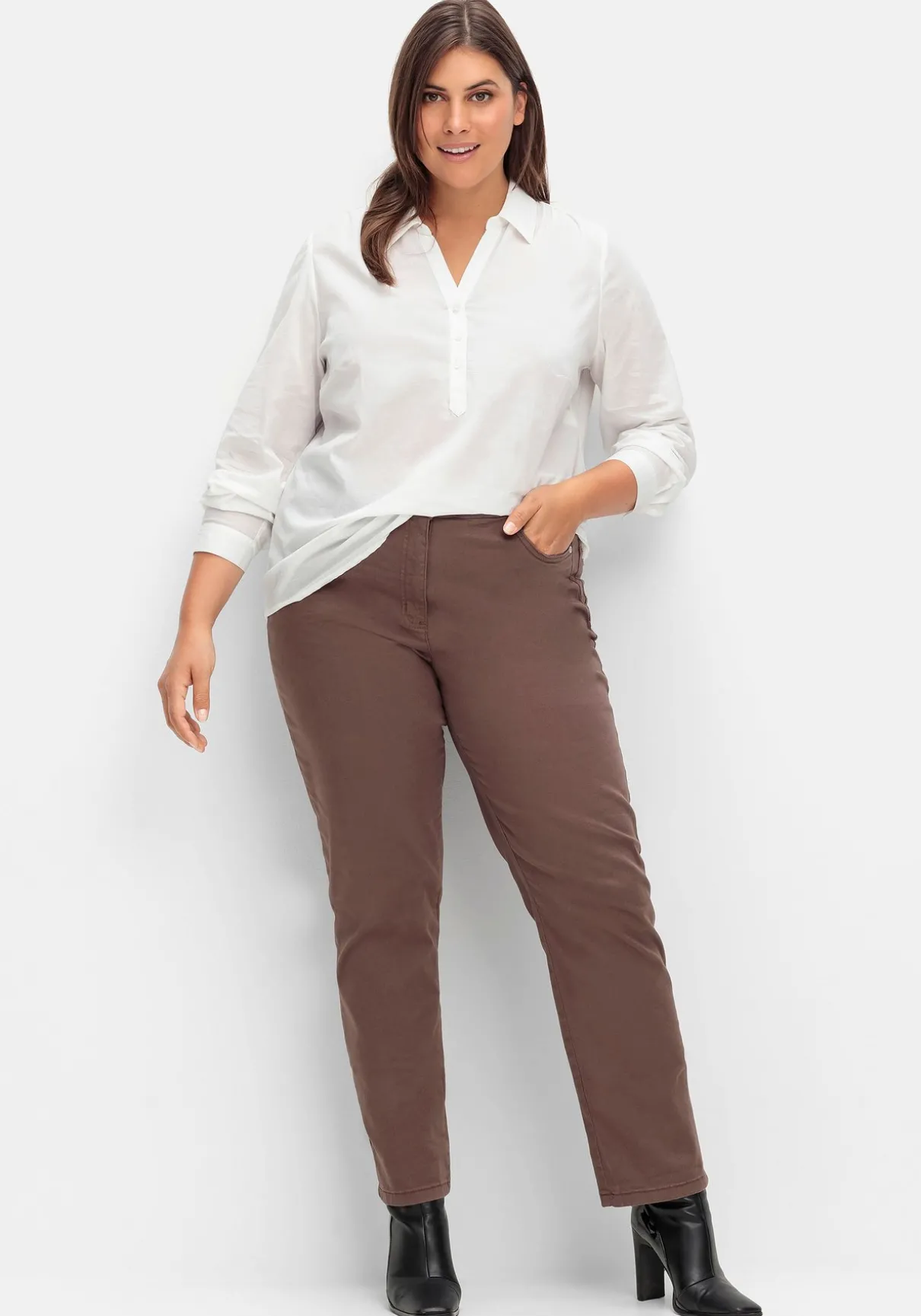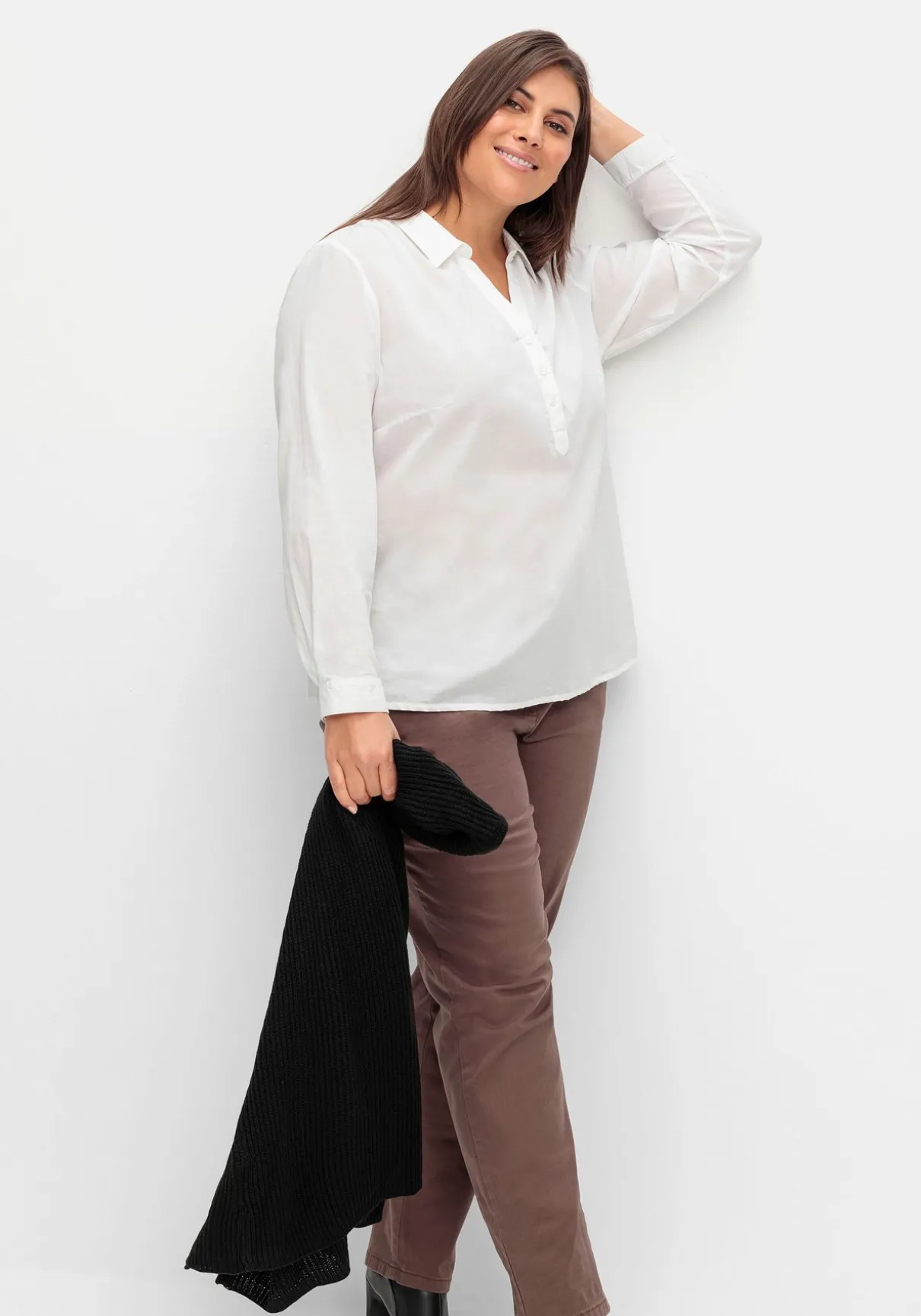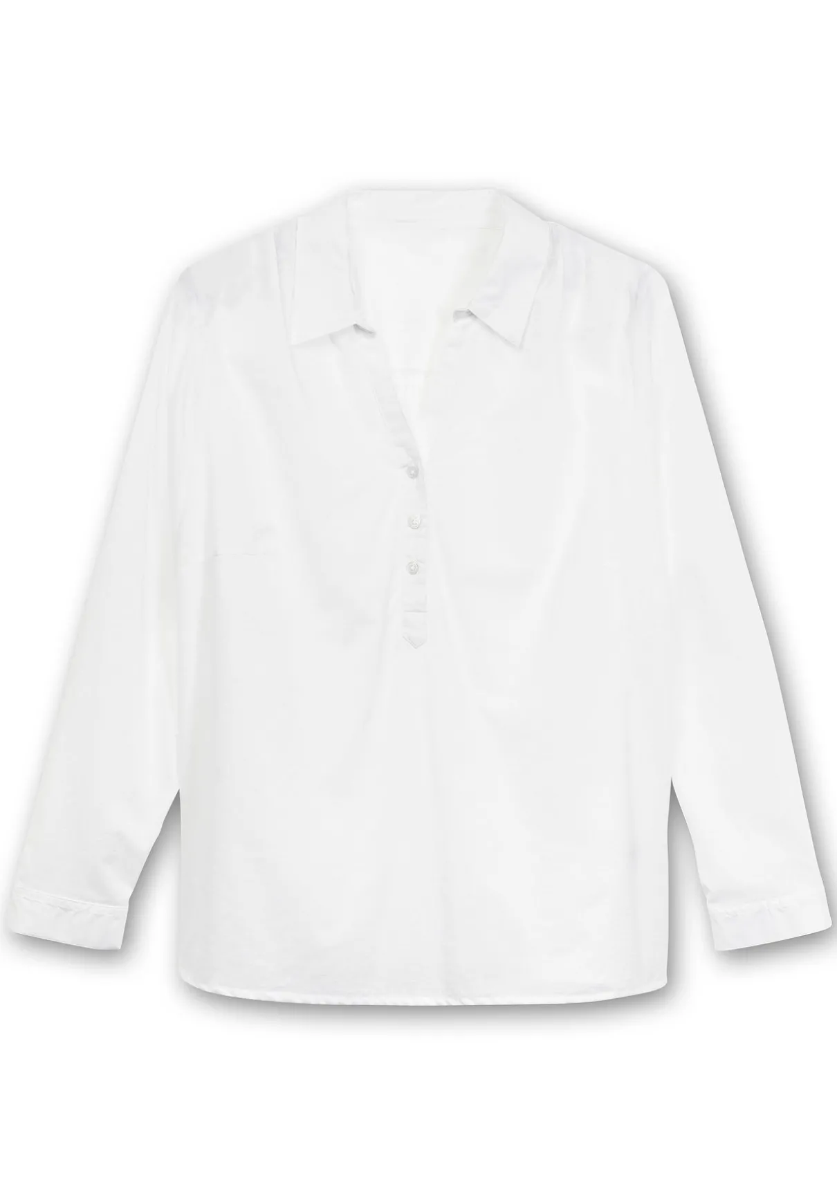 Tunika mit kurzer Knopfleiste. Der offene Hemdkragen mit V-Ausschnitt sowie die kleinen Raffungen an Schulter und Rückenpartie geben der Bluse eine feminine Optik. Breite Manschettenärmel mit Schlitz und Knopf runden den klassischen Stil gepflegt ab.