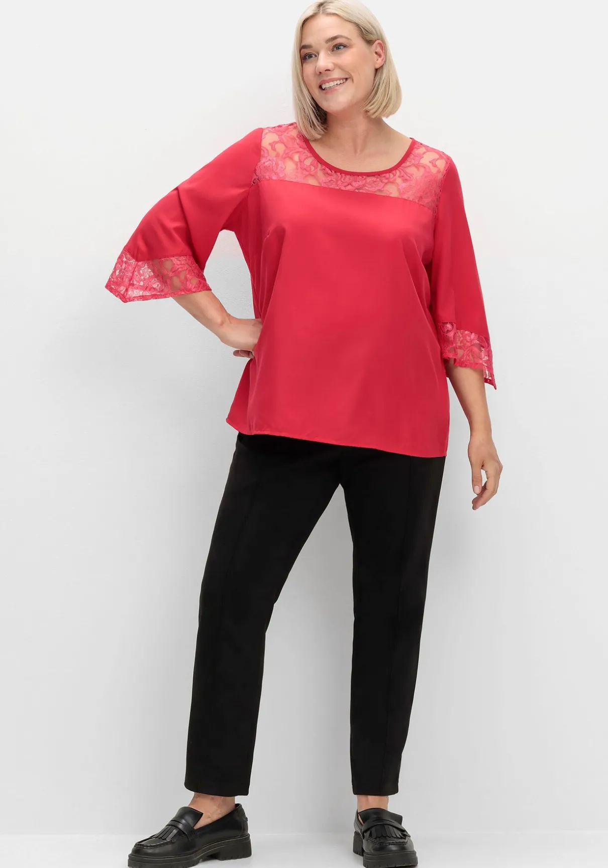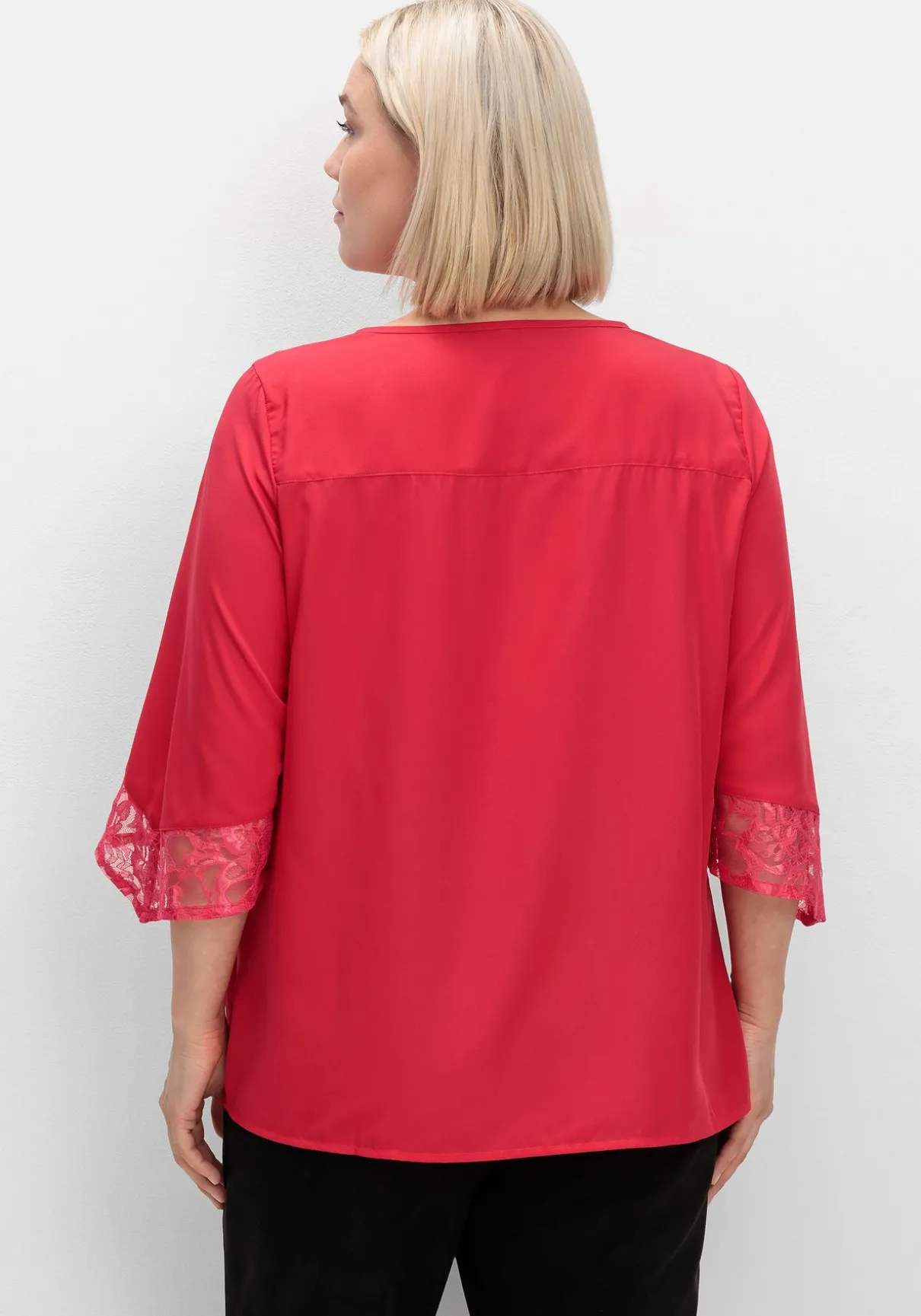 Tunika mit 3/4-langen Ärmeln. Der feminine Schnitt und die dekorativen Spitzendetails machen dieses Oberteil so besonders. Die Passe am Rundhalsausschnitt besteht aus leicht transparenter Spitze und sorgt so für einen eleganten Look. Die 3/4-Ärmel sind in ausgestellter Trompetenform geschnitten, auch hier findet sich die zarte Spitze am Ärmelabschluss wieder. Formgebende Brustabnäher betonen gekonnt die Figur.