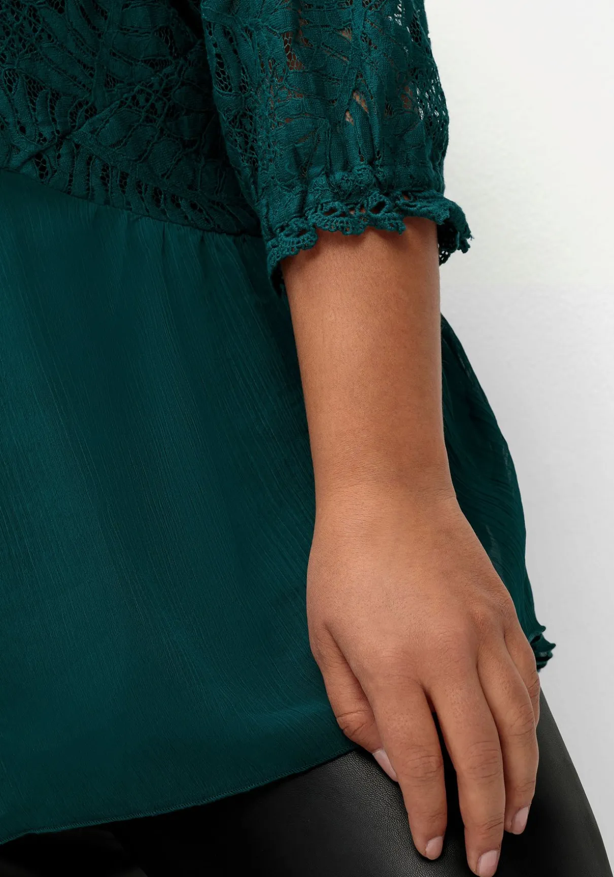 Tunika mit Chiffon und Spitze von sheego x Fair Lady. Highlight ist das aus floraler Spitze gefertigte Oberteil, ein Rundhalsausschnitt dient als feminine Ergänzung. Die 3/4-Ärmel bestehen ebenfalls aus Spitze, enden mit Gummizug und Bordüre und lassen zart die Haut durchschimmern. Durch das Jerseyfutter wird die Tunika am Body blickdicht. Das leicht geraffte Chiffonteil, das an den asymmetrisch geschnittenen Saum angesetzt ist, macht den romantischen Look perfekt.