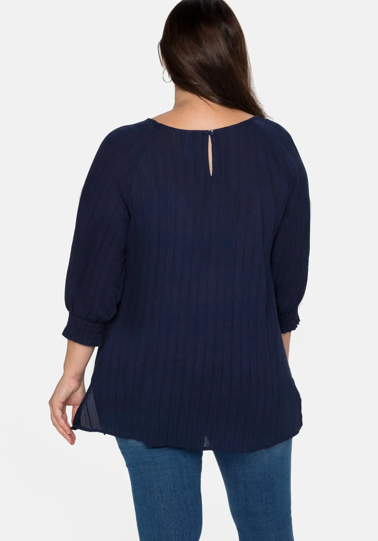 Tunika in A-Linie. Die feine Struktur in tonigen Längslinien lässt eine edle, leicht transparente Optik entstehen. Der feminine U-Boot-Ausschnitt geht hinten in einen Schlitz mit kleinem Knopfverschluss über. Gesmokte Ärmelbündchen am 3/4-langen Arm runden den Look stilvoll ab. Seitenschlitze am geraden Saumabschluss sorgen für den lockeren Sitz des Oberteils.