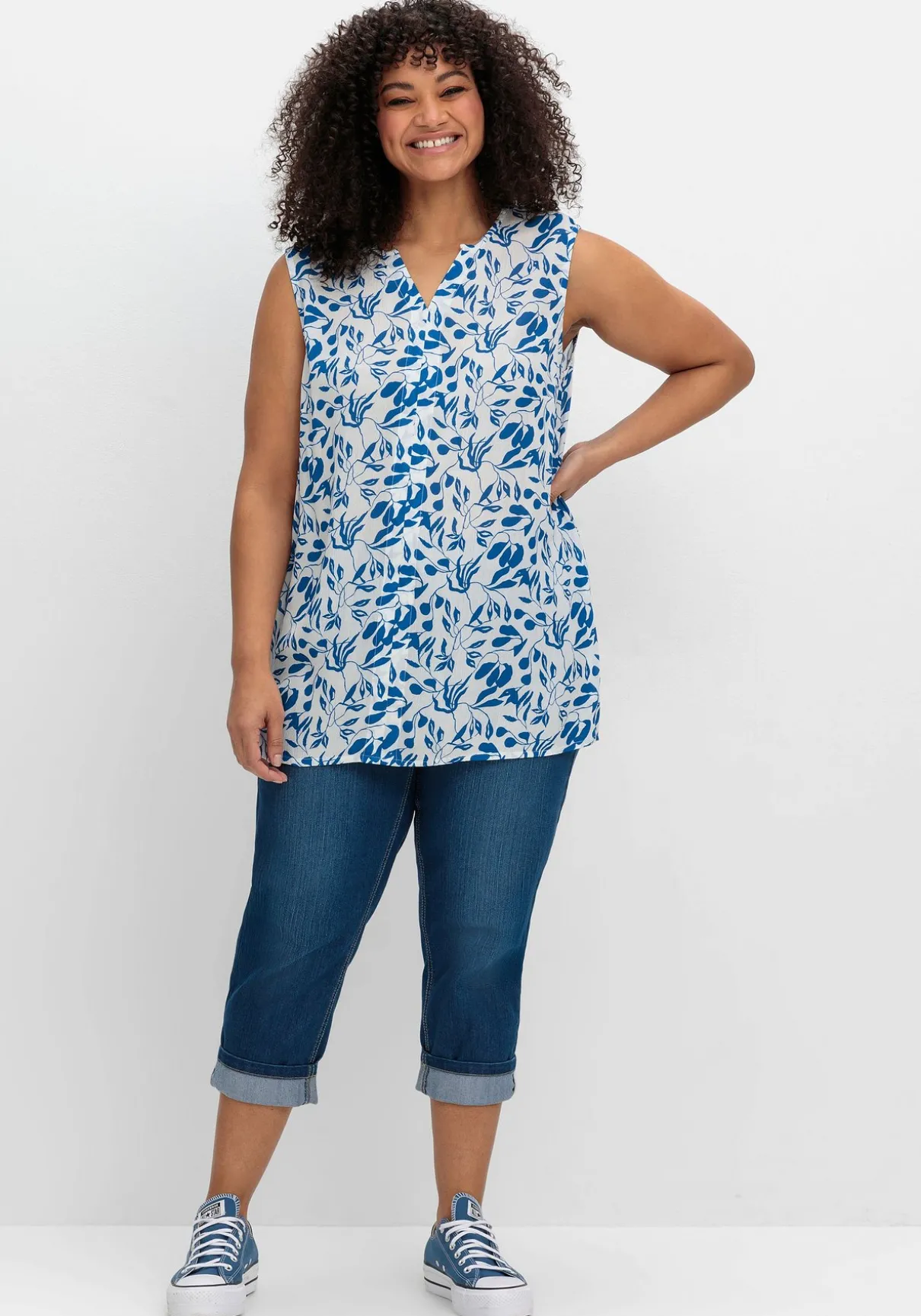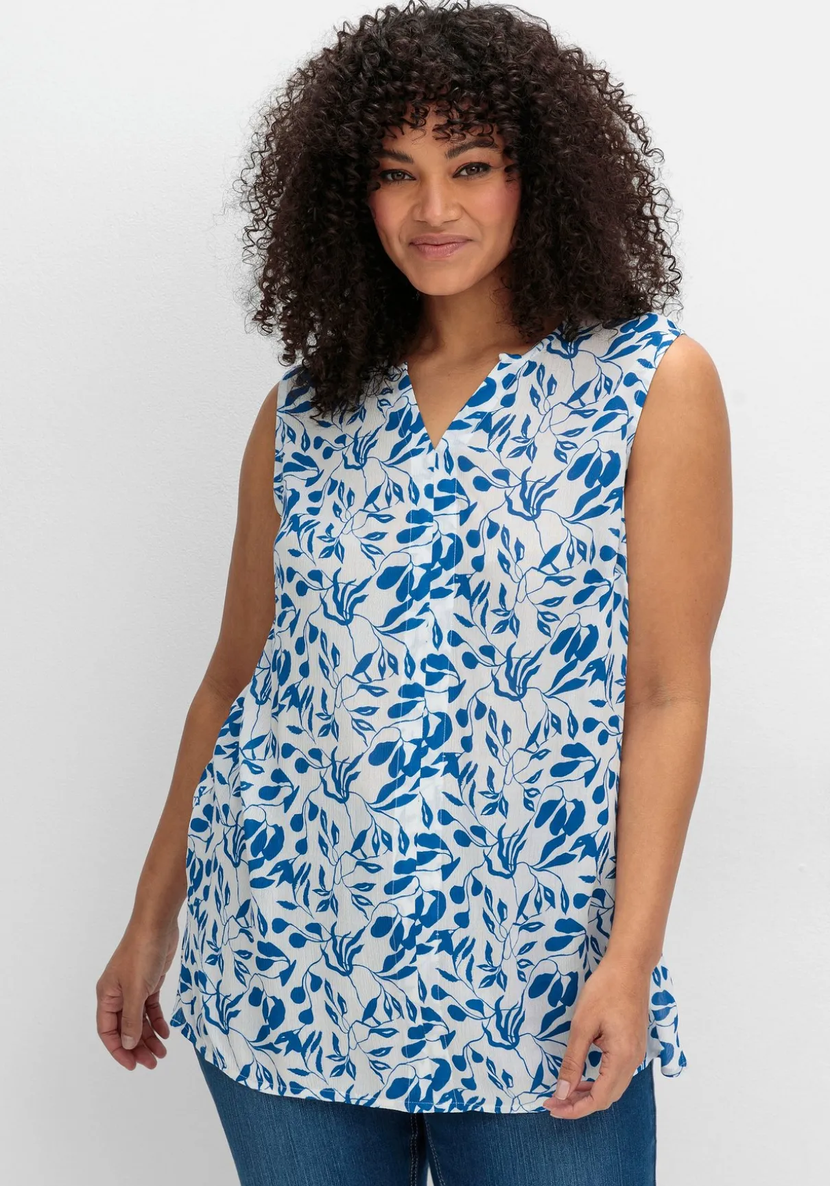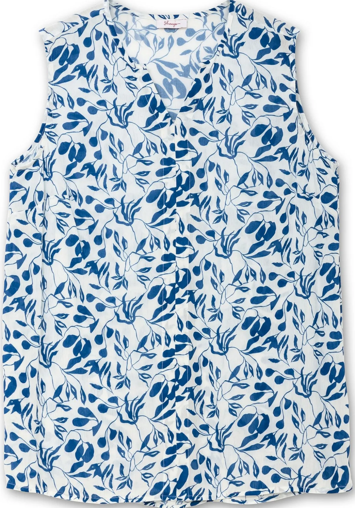Webtop aus leichtem Crêpe. Mit Allover-Blättermuster und in ärmelloser Form wirkt das Top luftig und sommerlich. Der Rundhalsausschnitt ist mit einem Schlitz gearbeitet, die Teilungsnaht vorn streckt die Silhouette optisch. Durch den hinten leicht gerundeten Saum fällt das Oberteil locker über den Po.