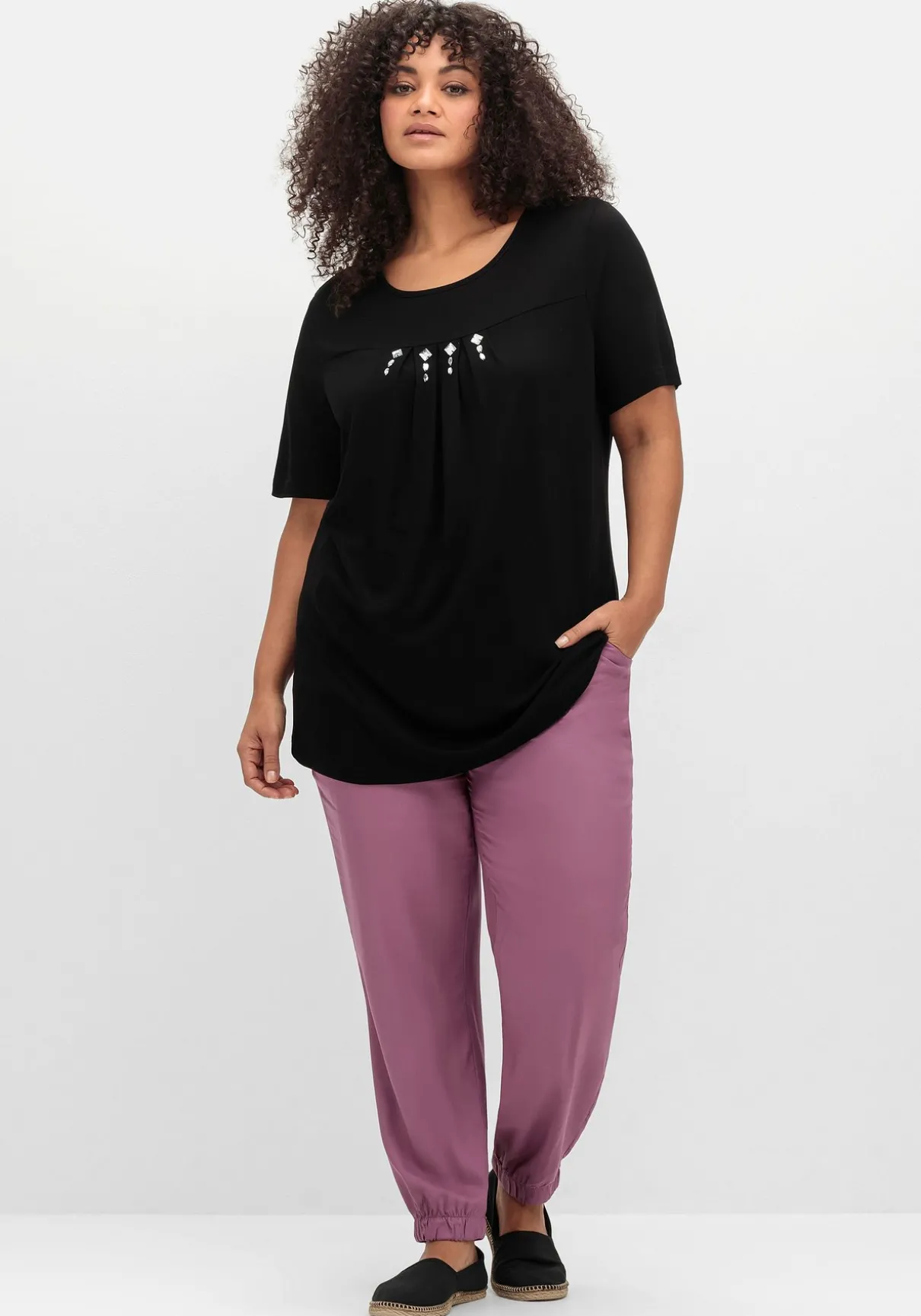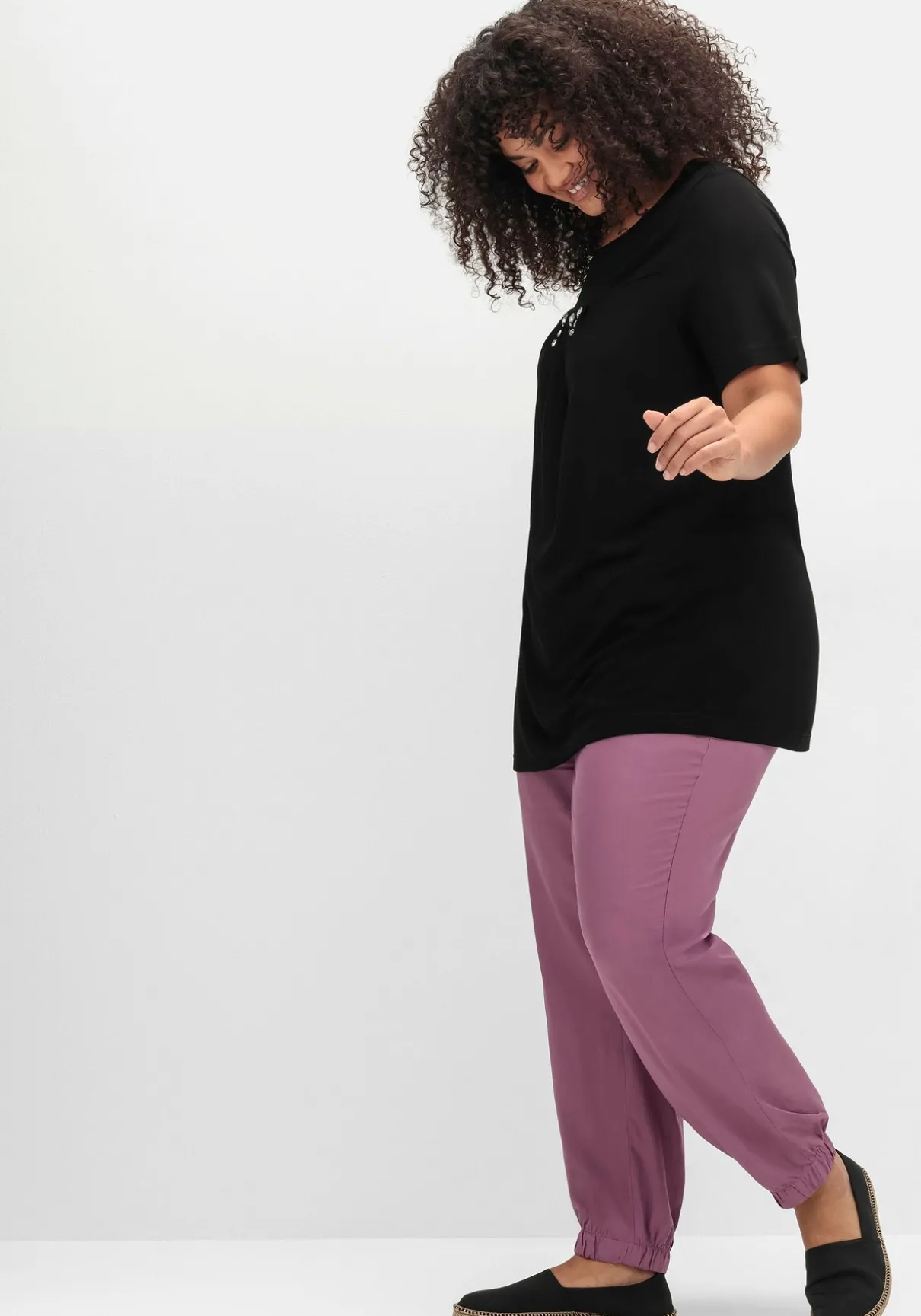 Die Hose ist am Oberschenkel angenehm weit geschnitten, die elastischen Saumbündchen sitzen bequem. Der Schlupfbund macht den Tragekomfort perfekt.