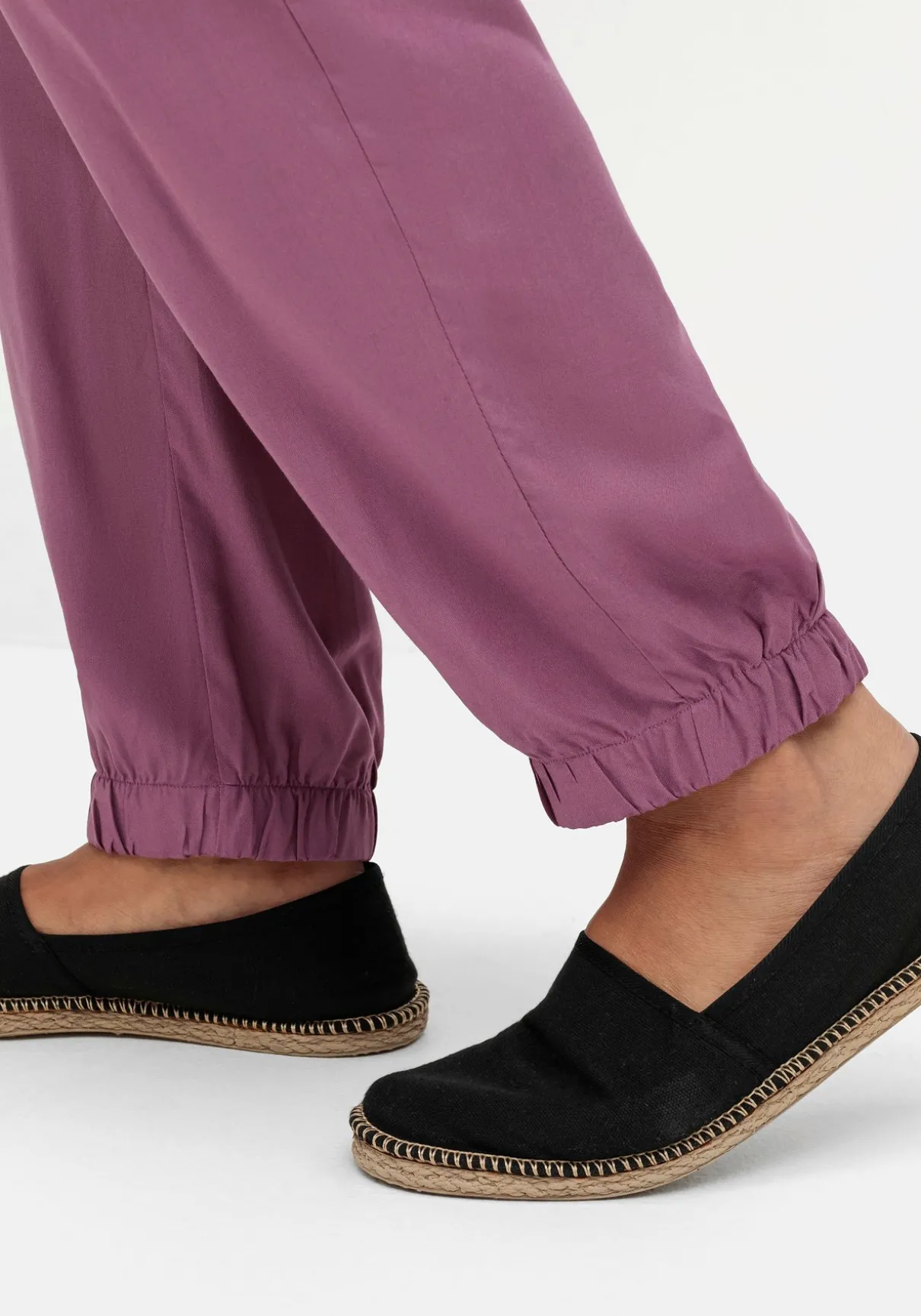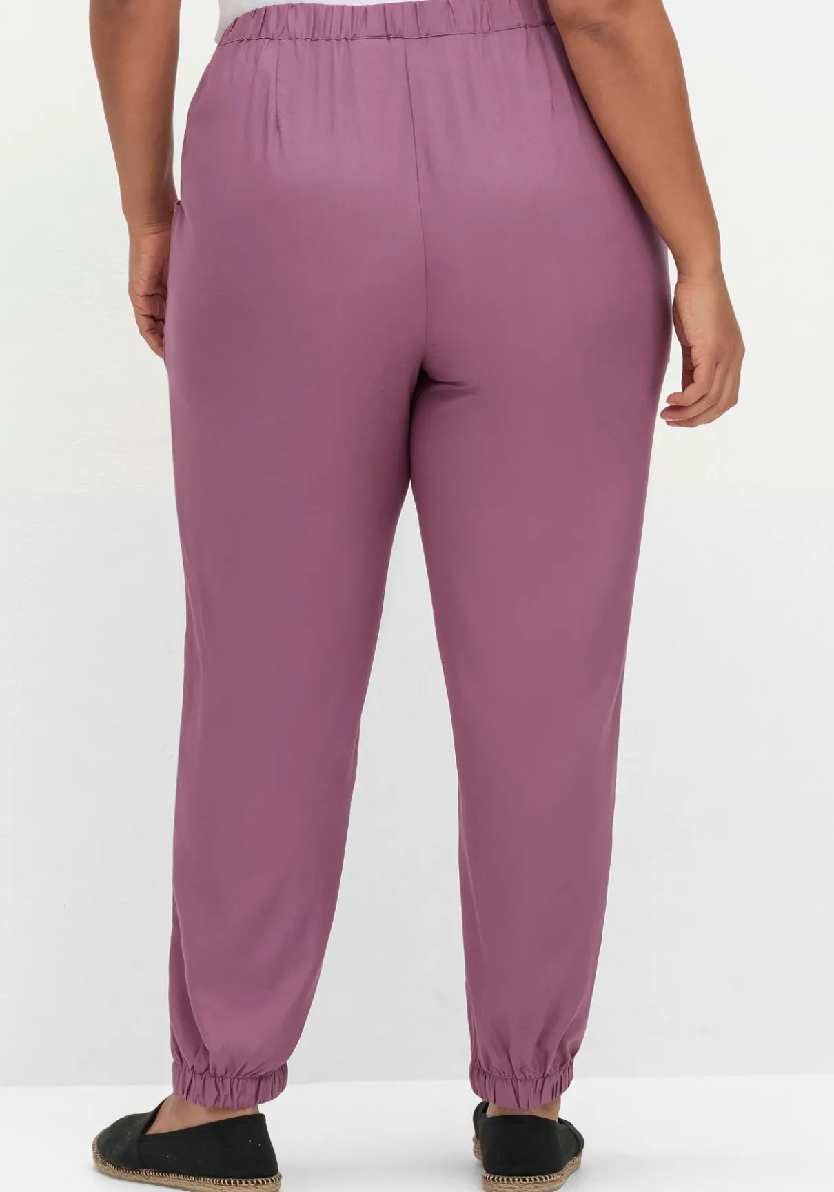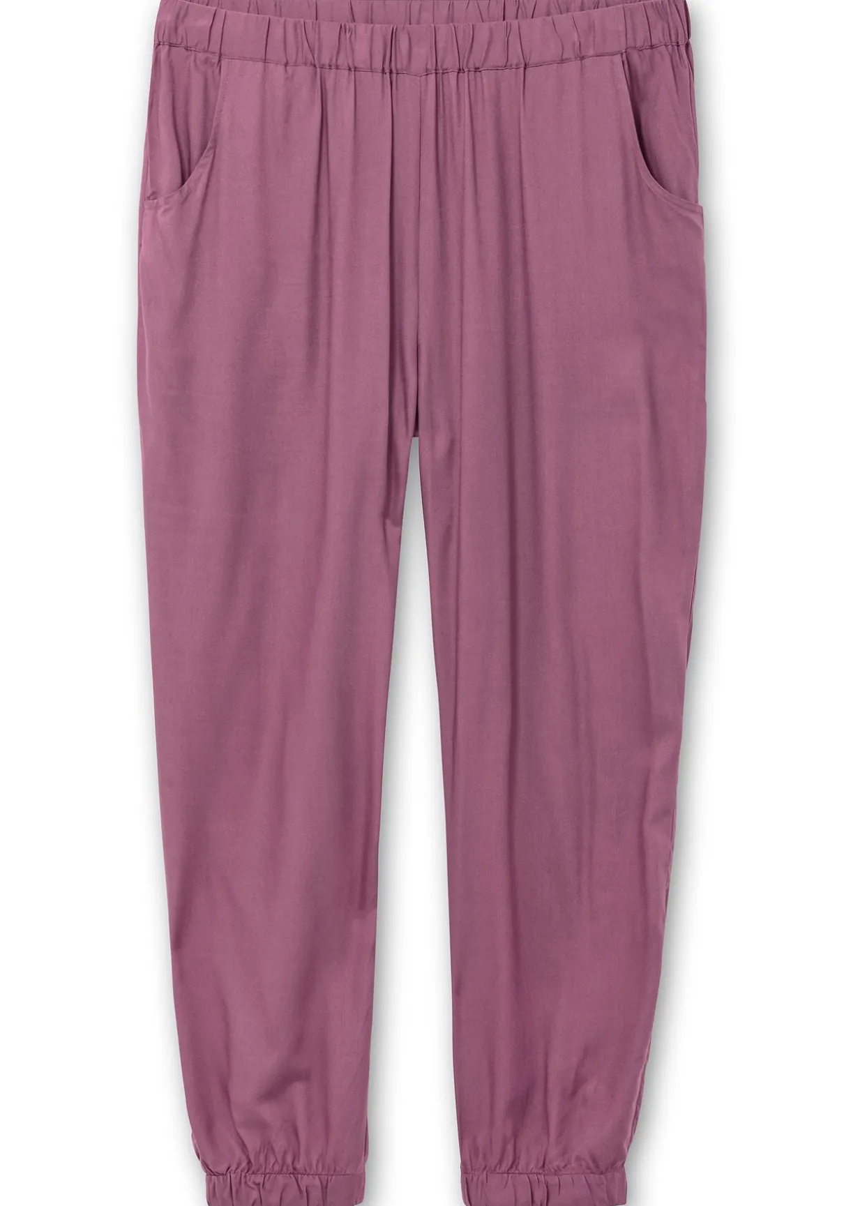 Schlupfhose mit Bündchen am Beinsaum. Der lockere Schnitt, das fließende Material und die bequeme Passform machen diese Hose zum entspannten und zugleich modischen Alltagsbegleiter. Sie besitzt einen Rundum-Dehnbund sowie zwei abgerundete Eingrifftaschen. Schmale, elastische Bündchen fassen das weite Bein am Saum zusammen und geben dem Fit seine sportive Optik.
