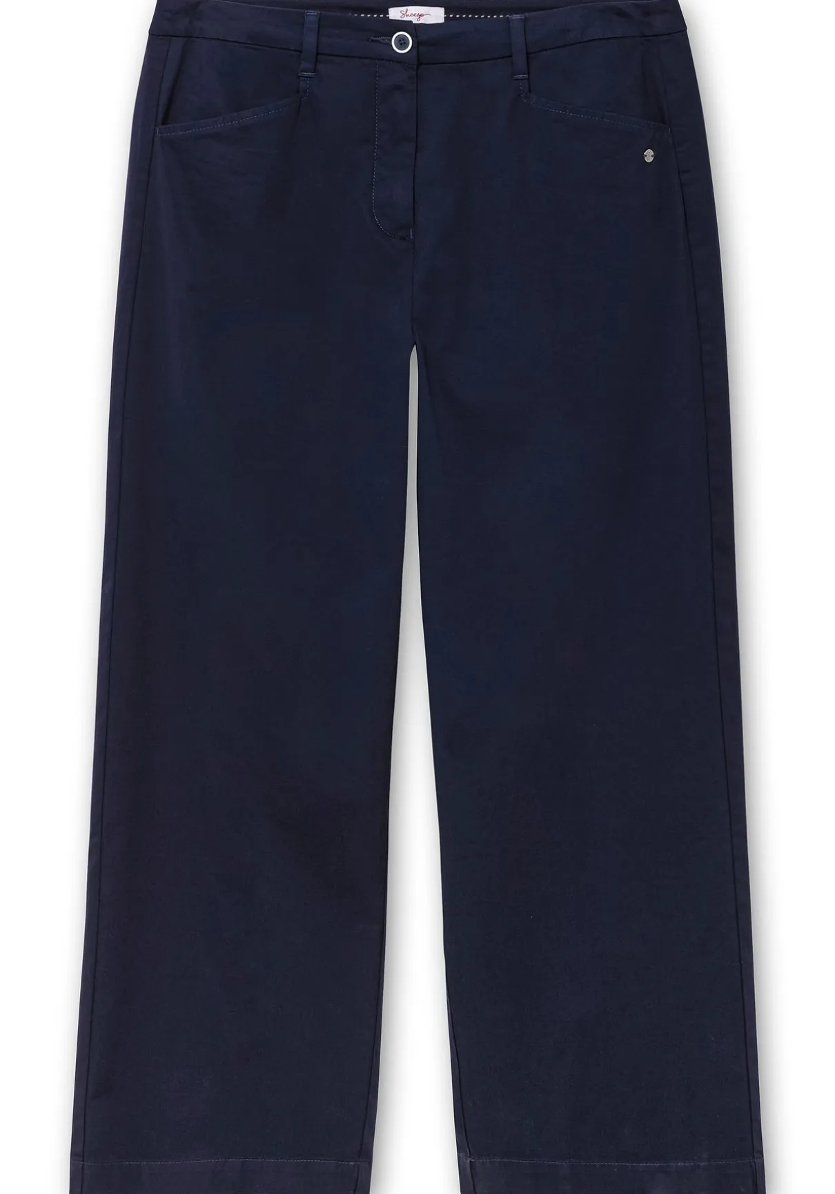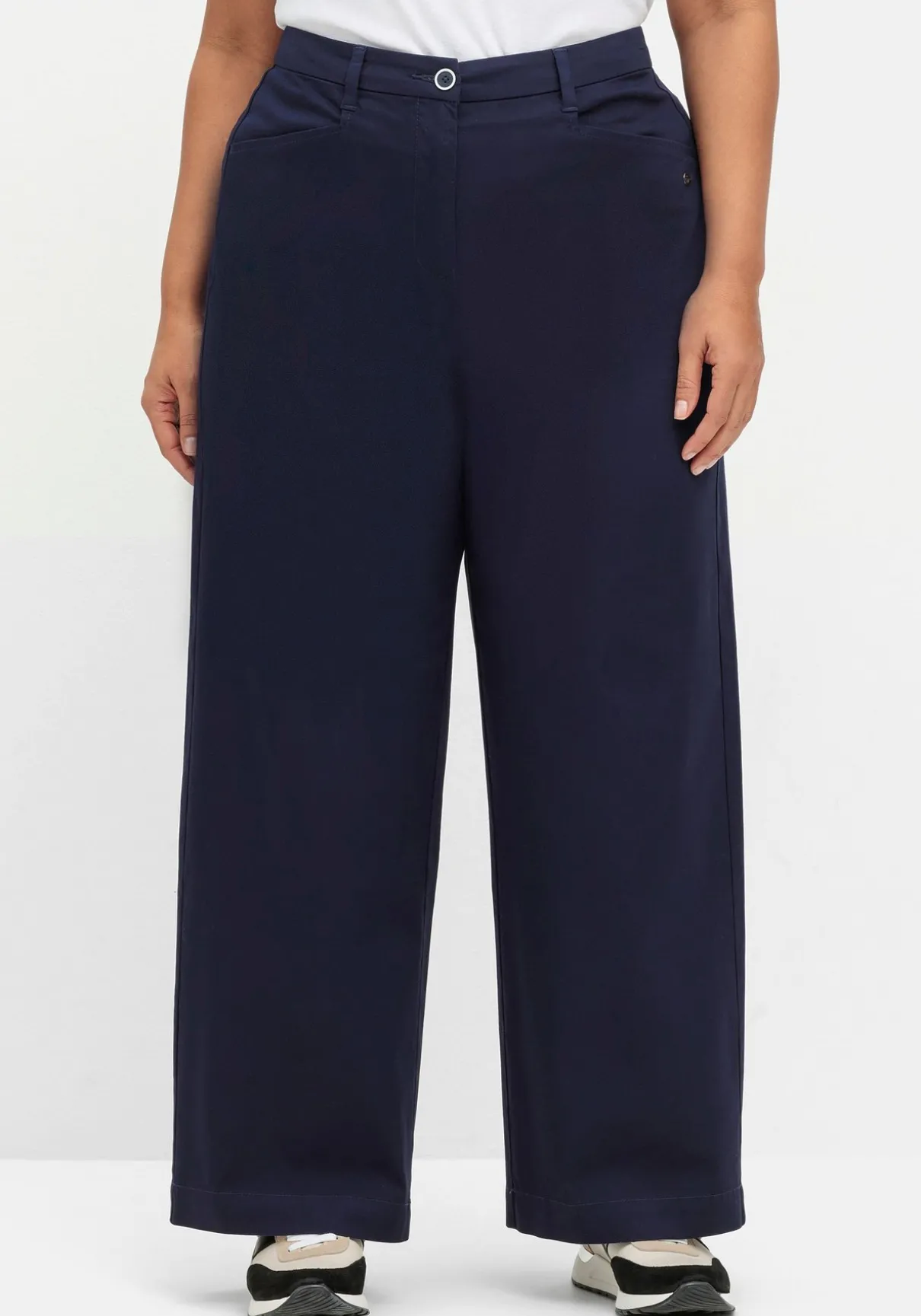Weite Hose im Chino-Stil. Zu schließen ist sie mit Knopf und Reißverschluss, die hinten gekreuzten Gürtelschlaufen lassen den Bund auch im Sitzen nicht abstehen. Zwei Eingrifftaschen vorn und zwei Leistentaschen mit dekorativer Ziernaht hinten machen den zeitlos-cleanen Look perfekt.