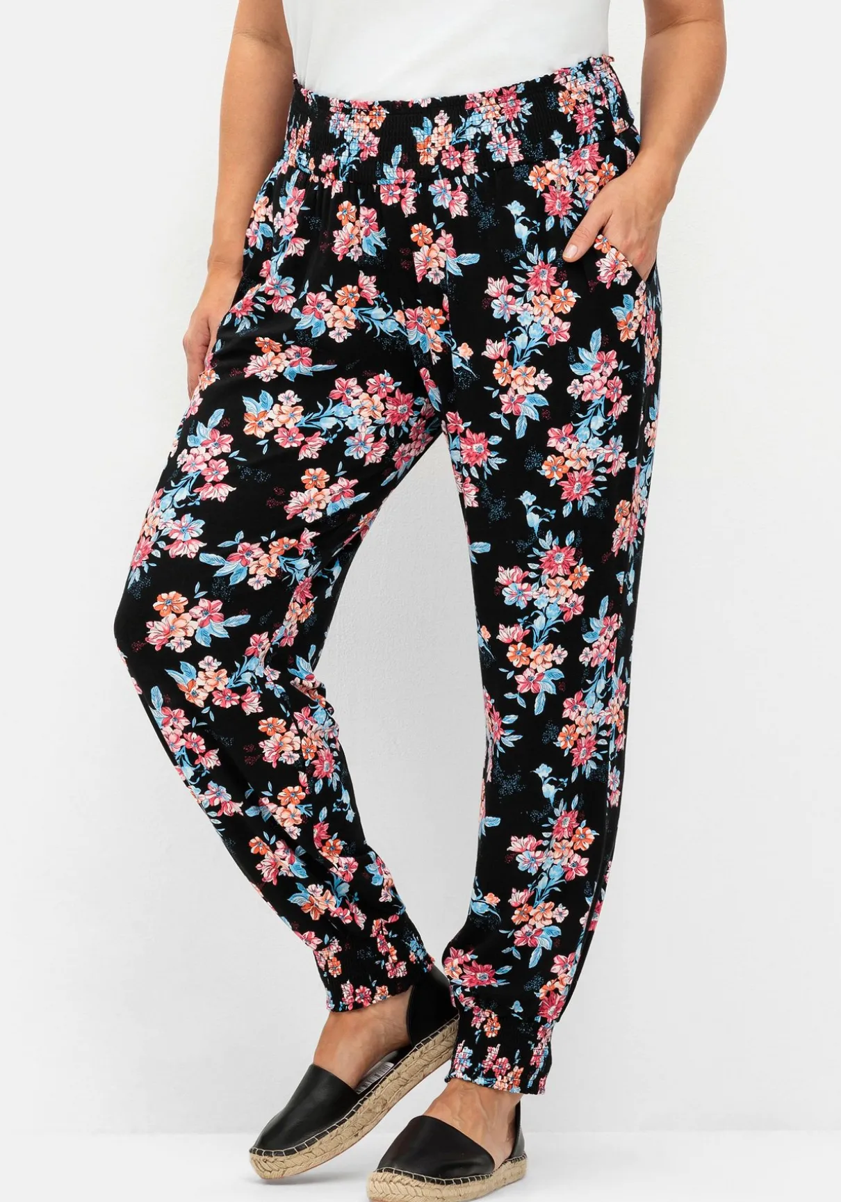 Hose mit Allover-Blumendruck. Der farbenfrohe Print verleiht der Hose eine verspielte Note, der breite Smokbund und die gesmokten Beinabschlüsse wirken entspannt und sportiv. Seitliche Eingrifftaschen sind praktische Details und ergänzen den legeren Style.