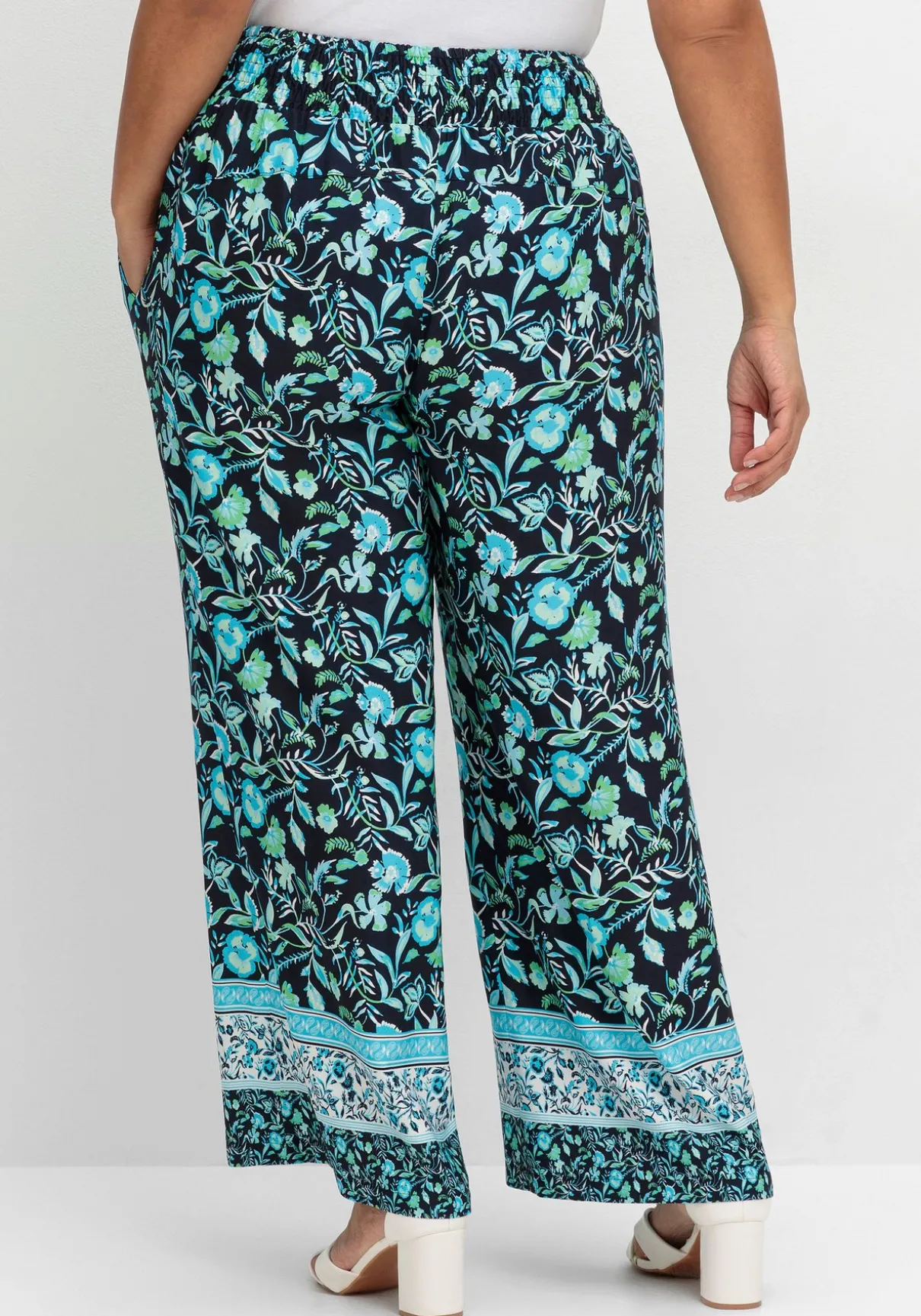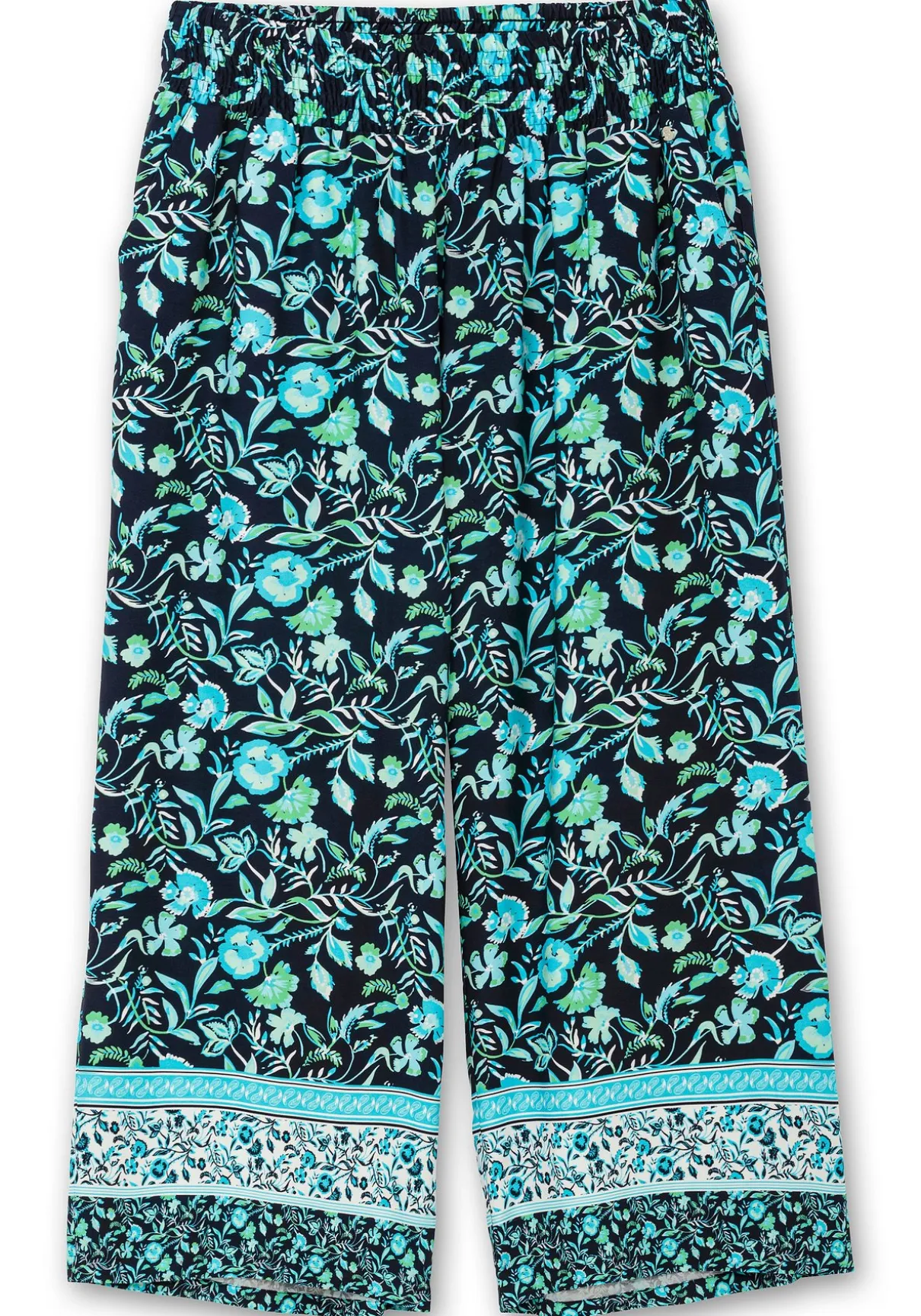 Weite Sommerhose in komfortabler Schlupfform. Der florale Druck wird mit einem stilvollen Bordürenprint am Hosensaum kombiniert und verleiht der Hose so einen charmanten Look. Dazu sorgt der breite Smokbund für Bequemlichkeit, seitliche Taschen sind dabei ein praktisches Detail. Die weite, locker fallende Form ergänzt den luftig-leichten Stil – ideal für die Freizeit oder den Strand.