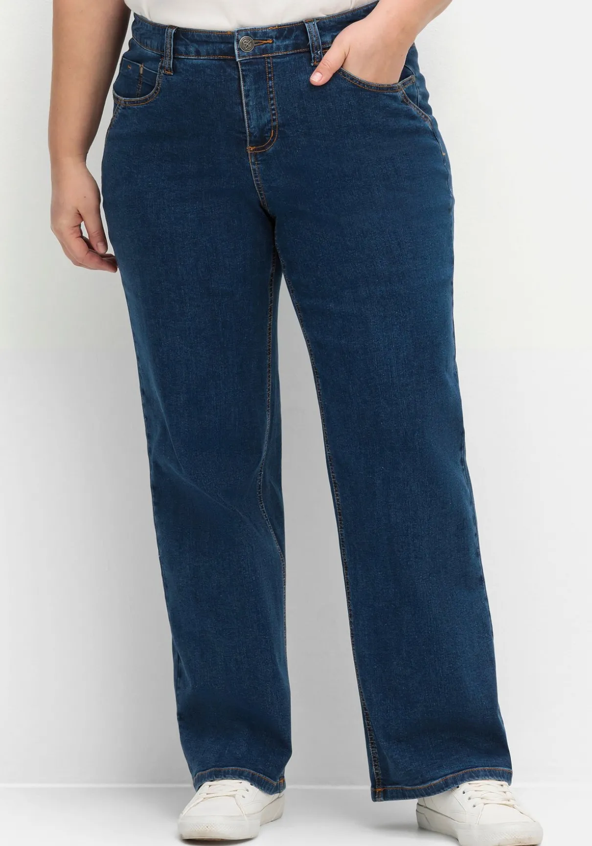 Jeans im Curvy-Schnitt ELLA mit extraweitem Beinverlauf, für Frauen mit sehr kräftigen Oberschenkeln und Waden. Die bequeme Jeans ist mit einem Formbund und Gürtelschlaufen gearbeitet und besitzt die klassischen fünf Taschen. Die Passe hinten sorgt für einen guten Sitz, Kontrastnähte runden den Look modisch ab.