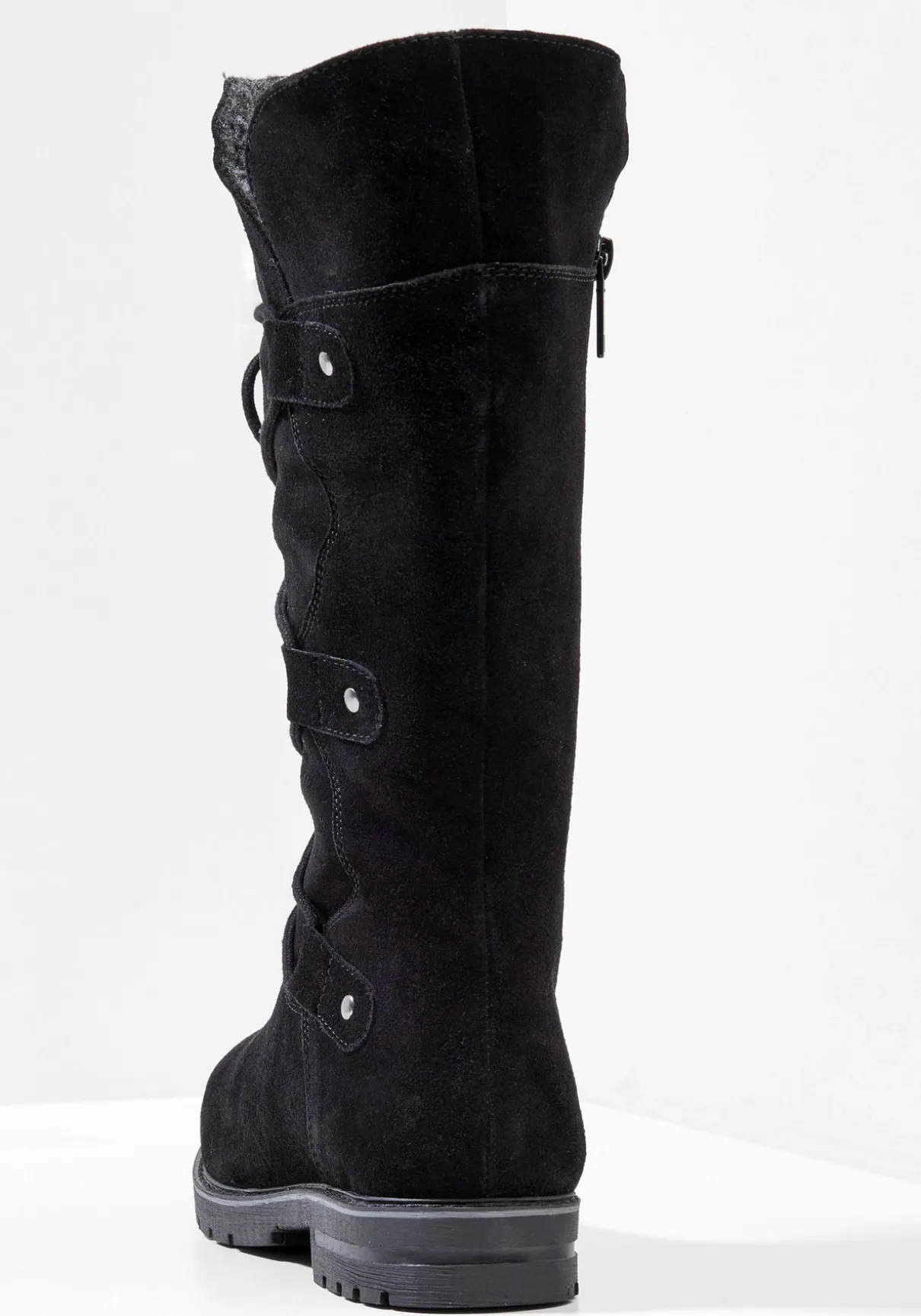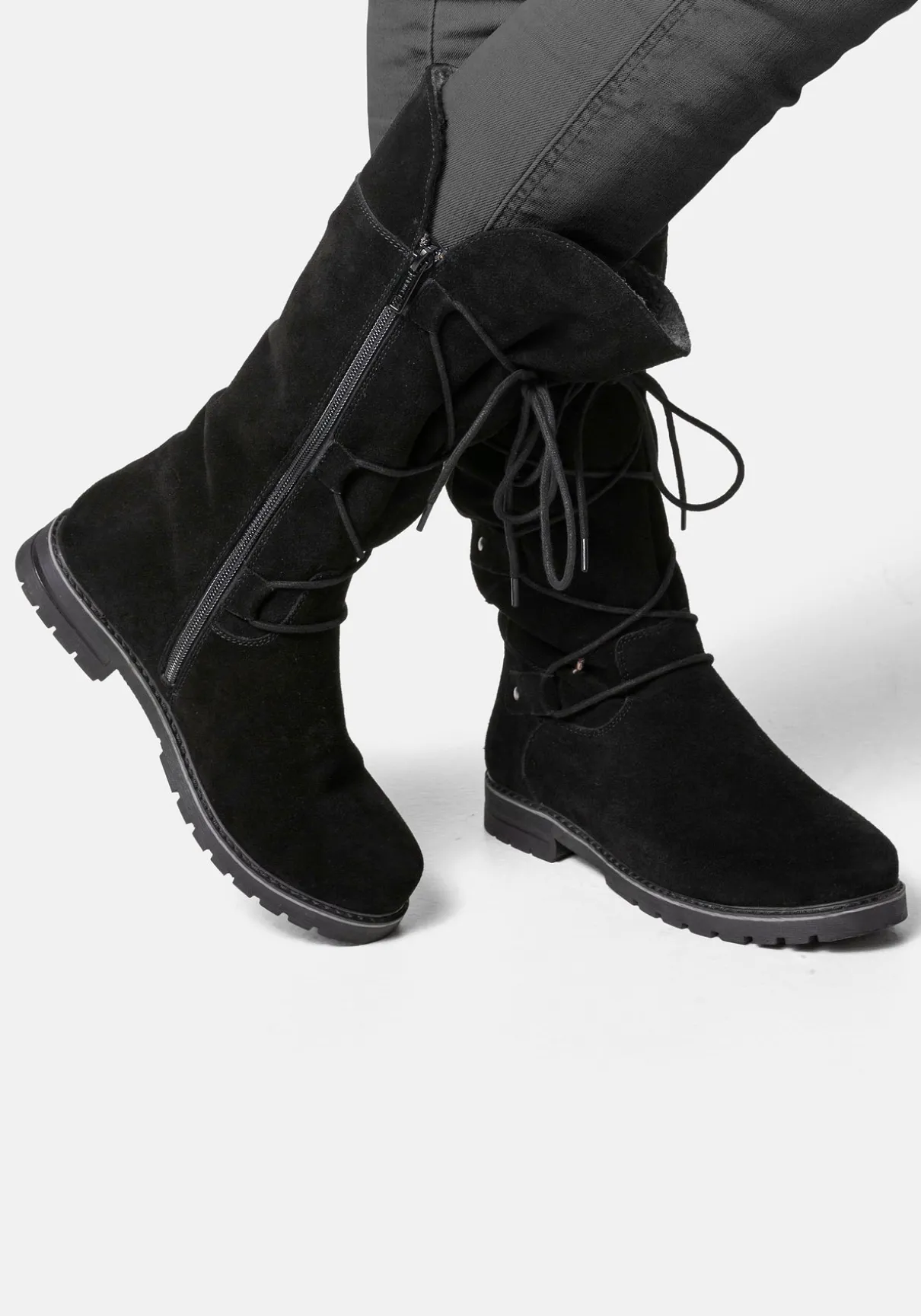 Leger und besonders bequem präsentiert sich dieser Stiefel im Used-Look. Die angebrachte Schnürung zur Weitenregulierung ist nicht nur praktisch, sondern auch ein optisches Highlight. Der seitliche Reißverschluss lässt sich durch den breiten Anhänger angenehm verschließen. Ein sicherer Halt wird durch das starke Profil in der Sohle und die profilierte Außensohle gewährleistet. Besonders schick: Der Schaft kann umgeklappt werden, sodass das Fellfutter sichtbar wird und ein neuer Look entsteht. Der Absatz ist ca. 2,5 cm hoch und die Spitze vorn abgerundet.