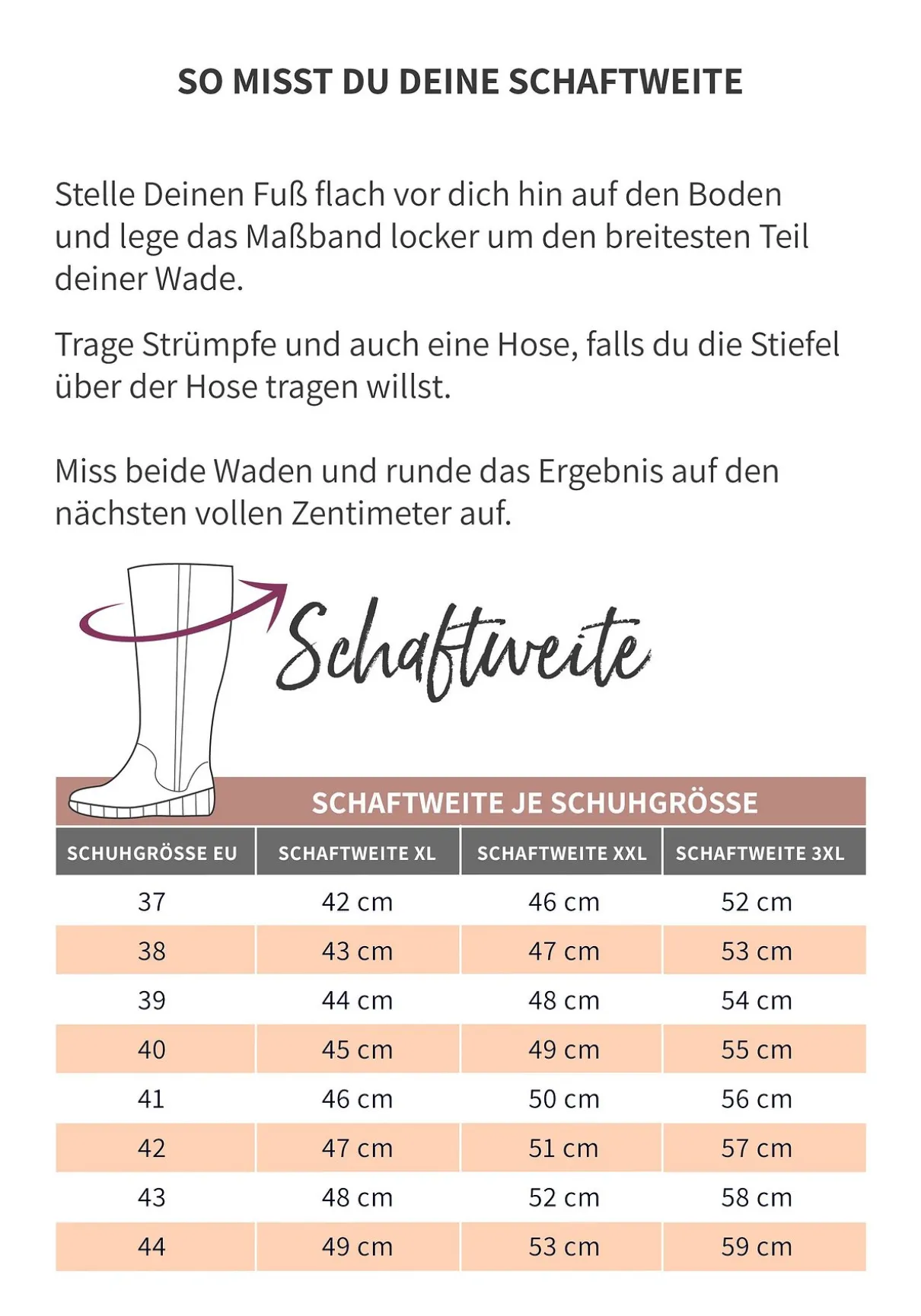 Bei der Fußweite G handelt es sich um eine Komfortweite für breitere Füße. Die Schafthöhe beträgt ca. 32 cm, die Schaftweite XL ca. 42-49 cm, die Schaftweite XXL ca. 46-53 cm.
