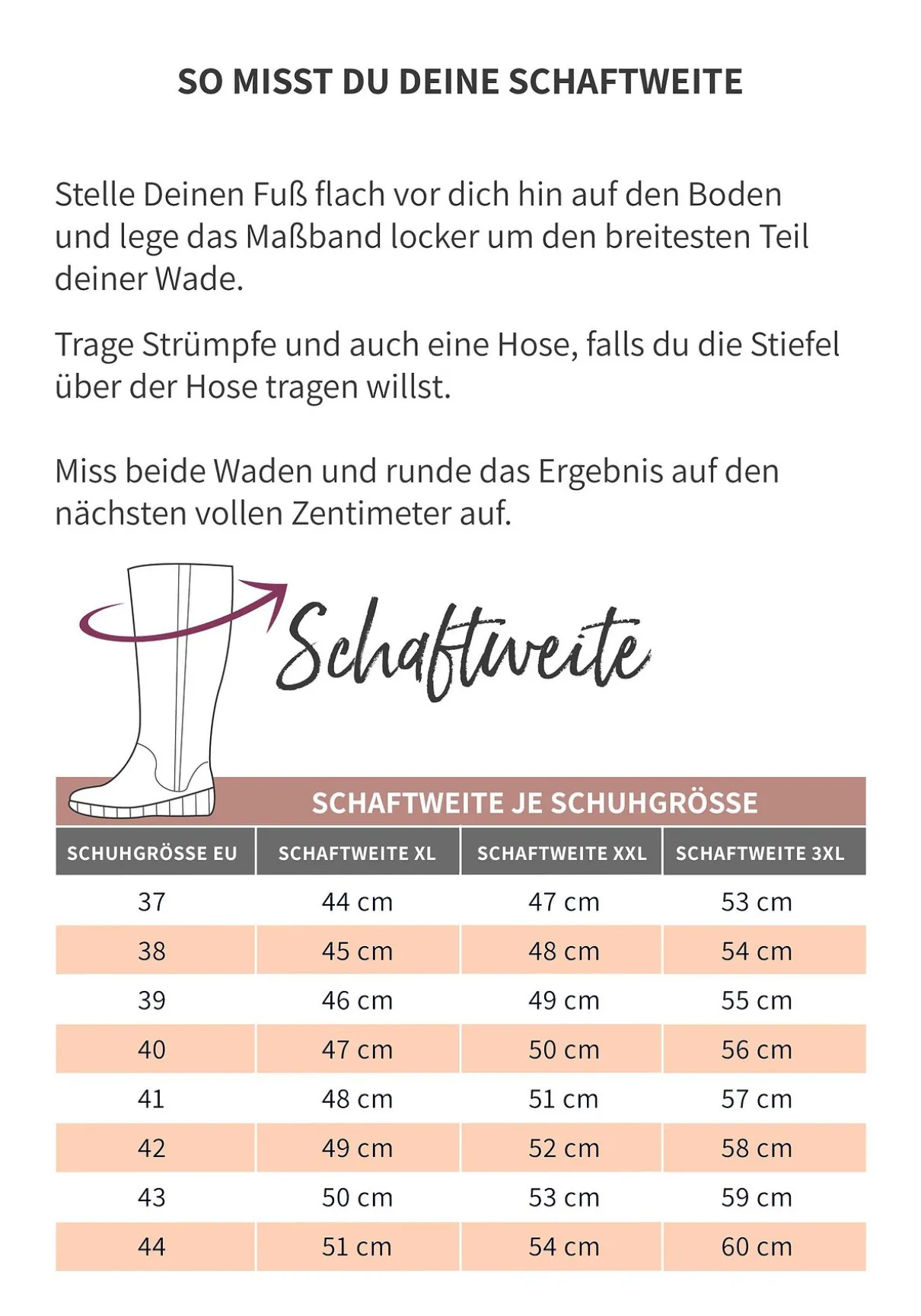 Unser Tipp: Bitte beachte, dass die Schaftweite bei jedem Stiefelmodell unterschiedlich ausfallen kann. Miss daher vor der Bestellung deine Wadenweite nach – eine Anleitung dazu findest du in den Produktbildern.