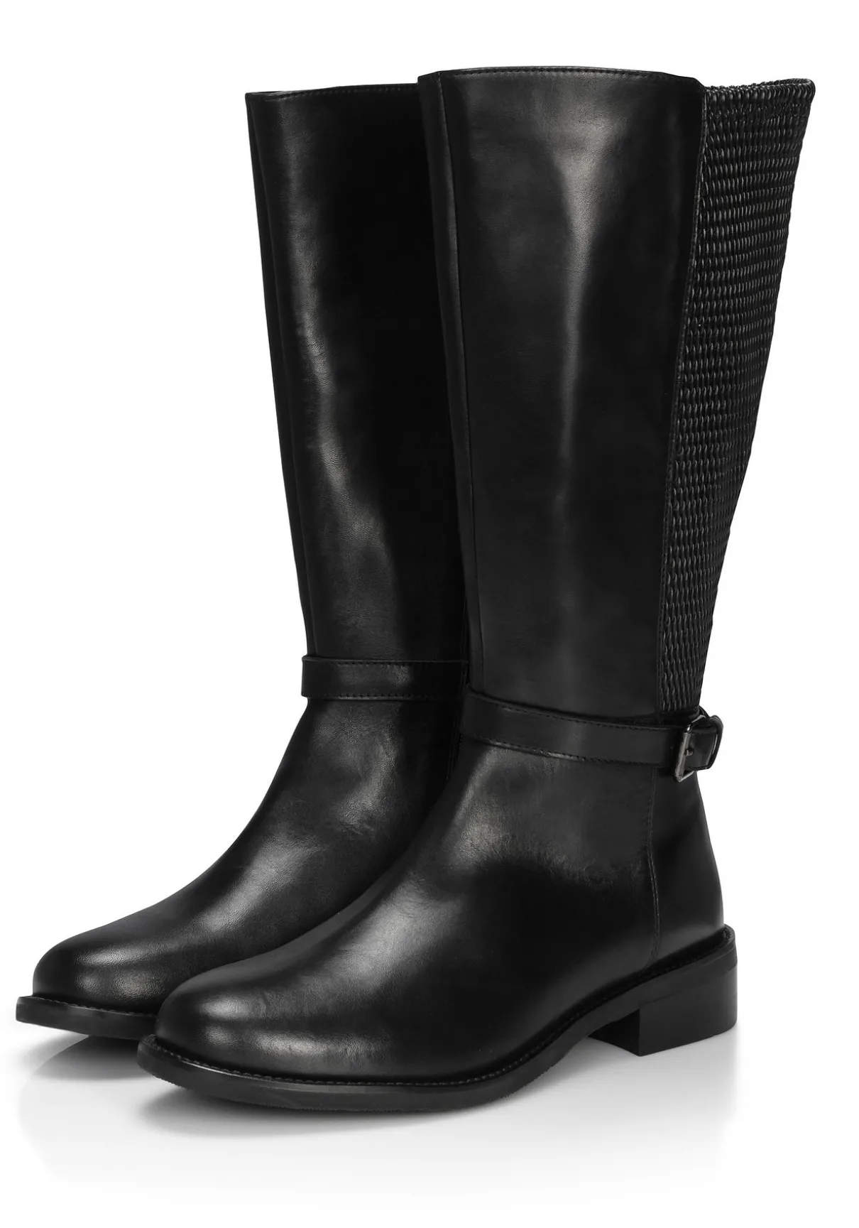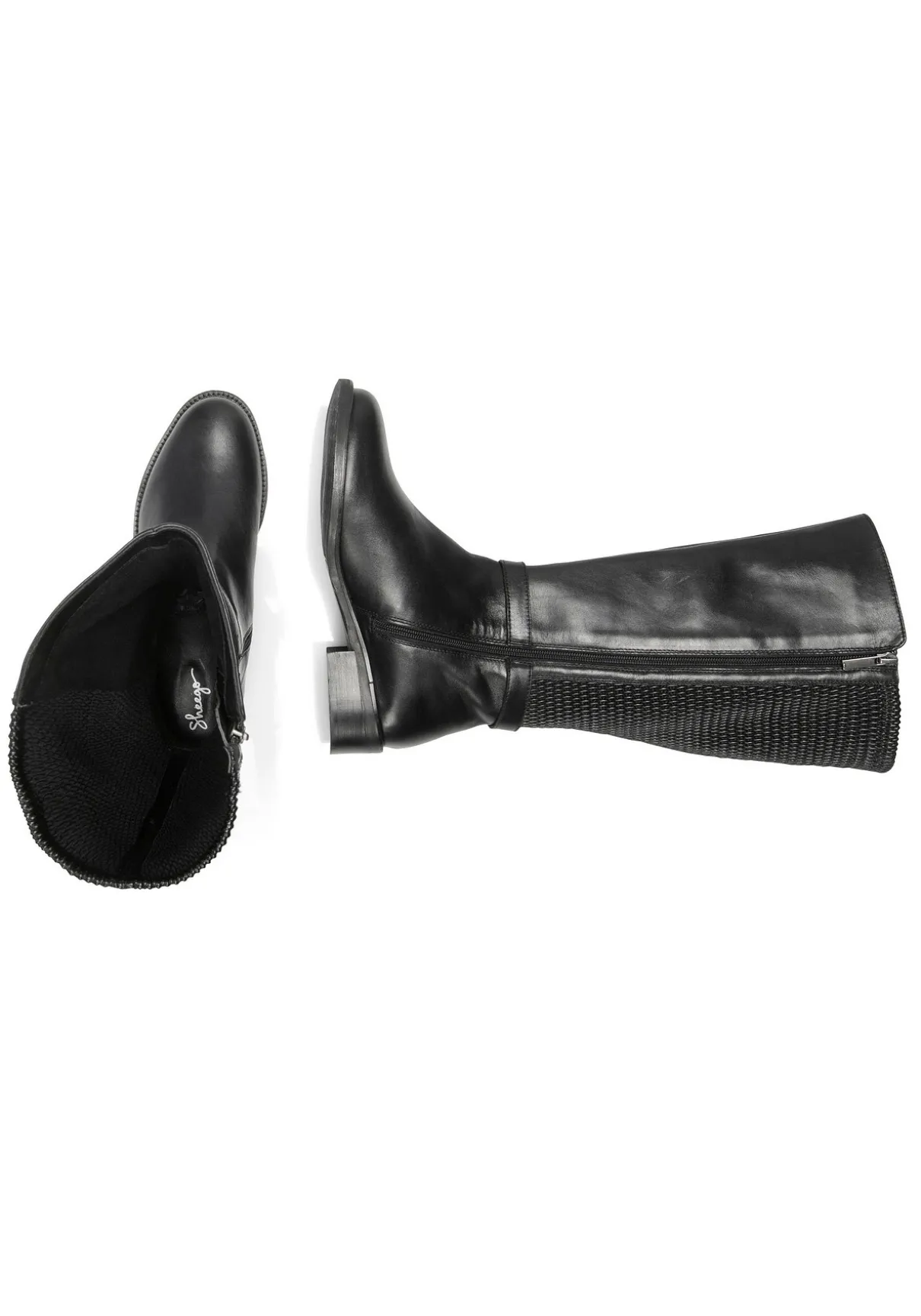 Weitschaftstiefel im dekorativen Materialmix. Die Zierschnalle auf Knöchelhöhe dient als weiteres modisches Detail. Der 3,5 cm hohe Blockabsatz trägt sich bequem, ein seitlicher Reißverschluss erleichtert das An- und Ausziehen. Dank der herausnehmbaren Innensohle ist das Tragen eigener Einlagen in diesen Stiefeln problemlos möglich.